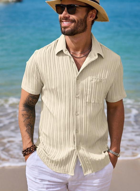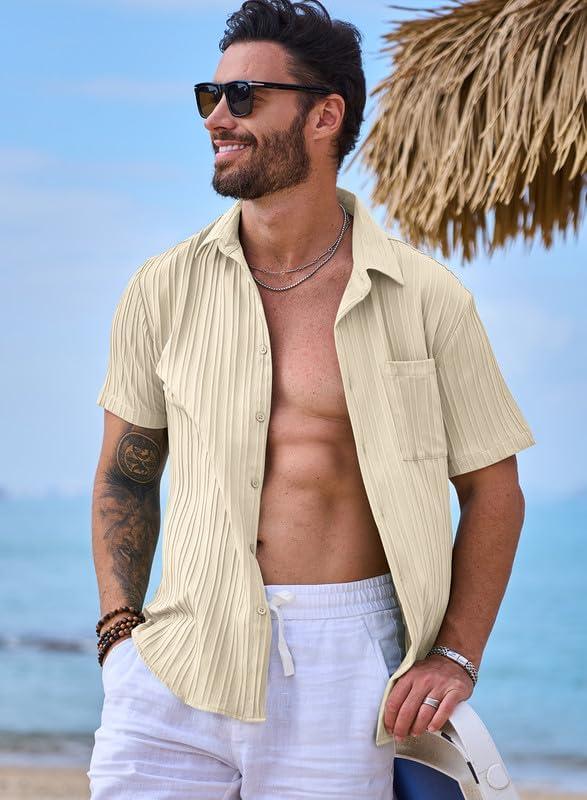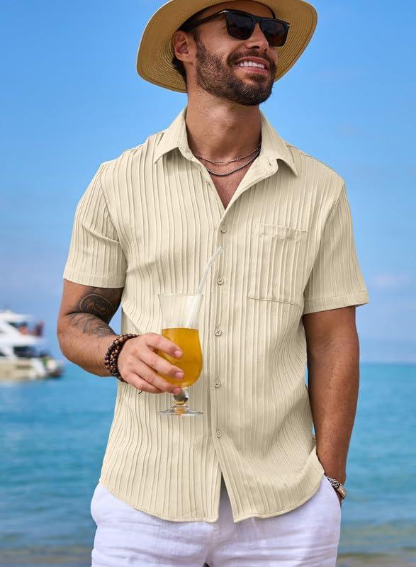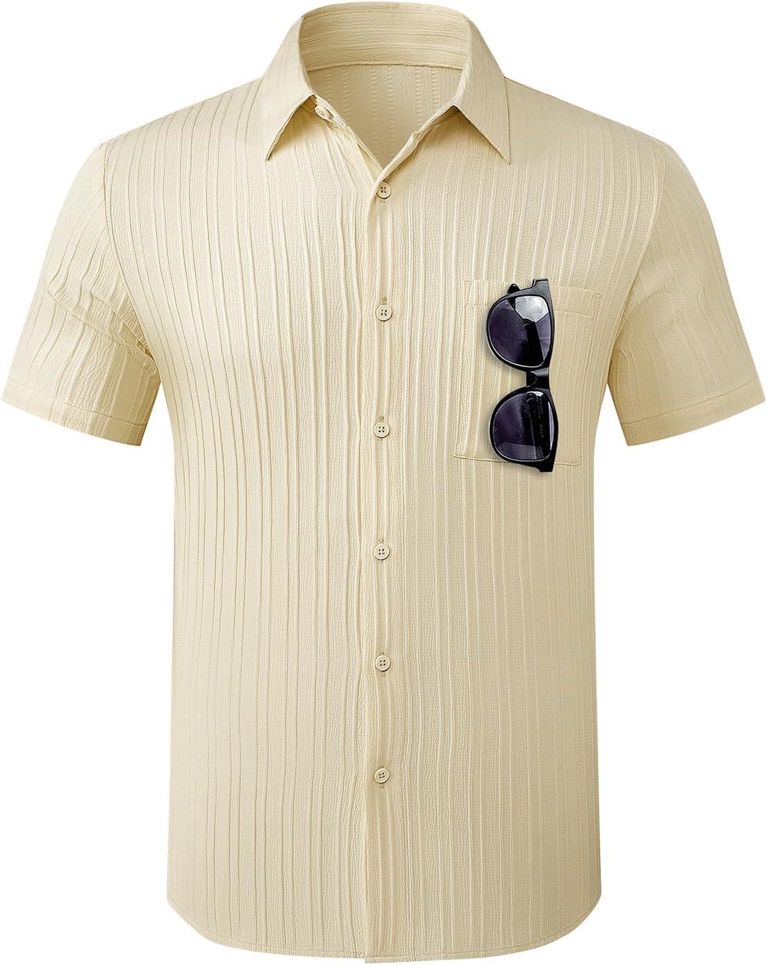 JMIERR Hawaiian Shirt for Men Button Down Short Sleeve Shirts Textured Casual Summer Beach Linen Shirts(A Apricot)