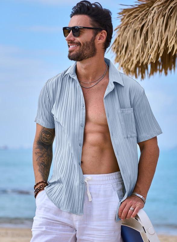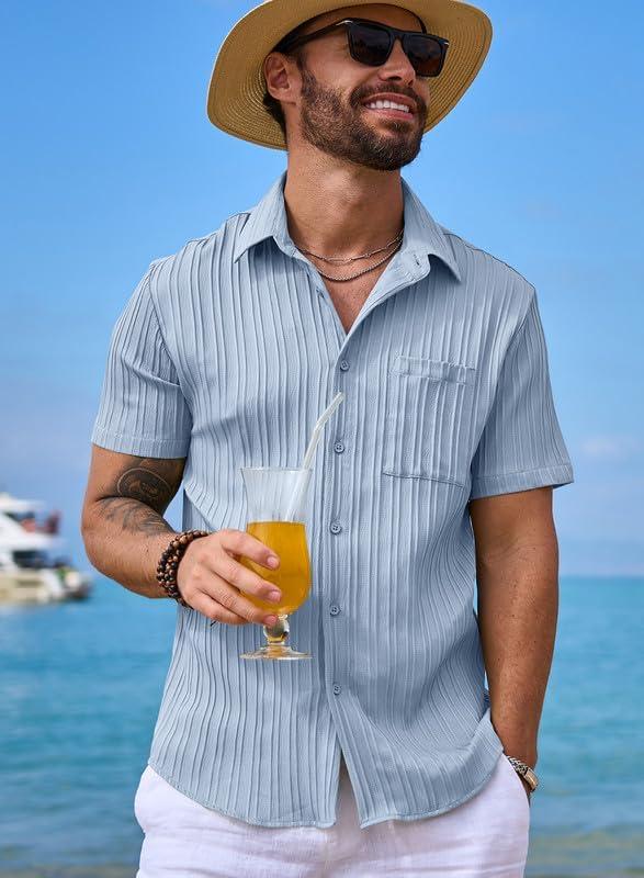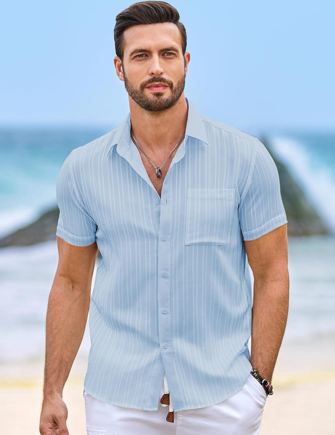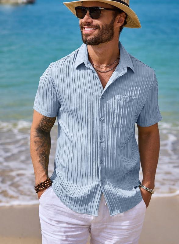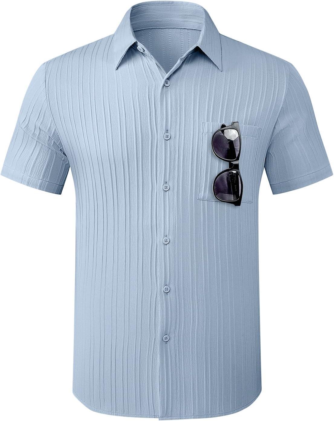 JMIERR Hawaiian Shirt for Men Button Down Short Sleeve Shirts Textured Casual Summer Beach Linen Shirts(B Light Blue)