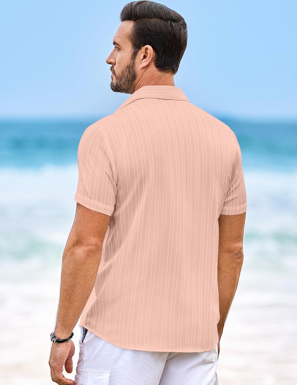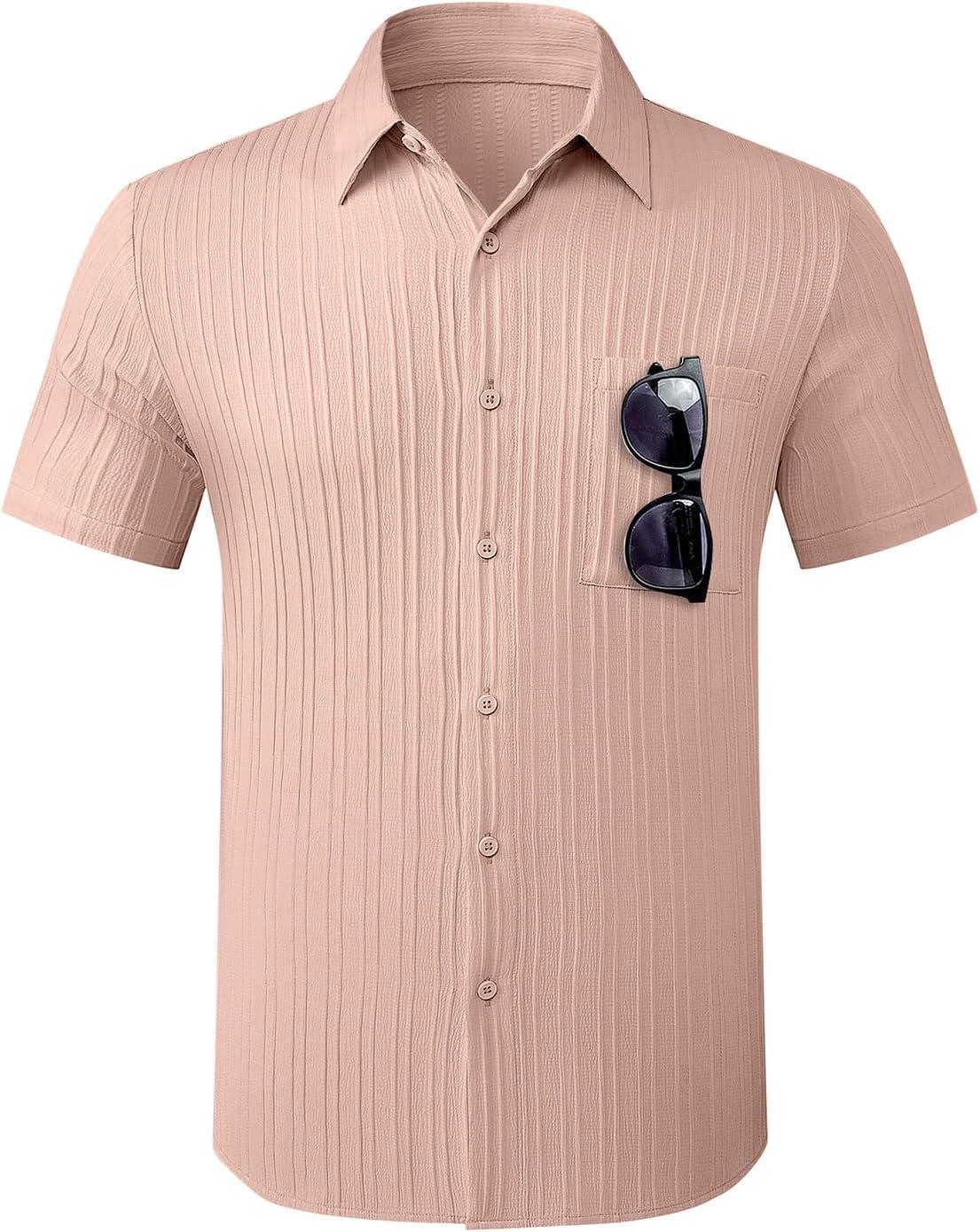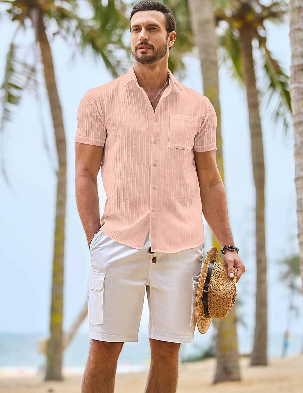 JMIERR Hawaiian Shirt for Men Button Down Short Sleeve Shirts Textured Casual Summer Beach Linen Shirts(B Pink)