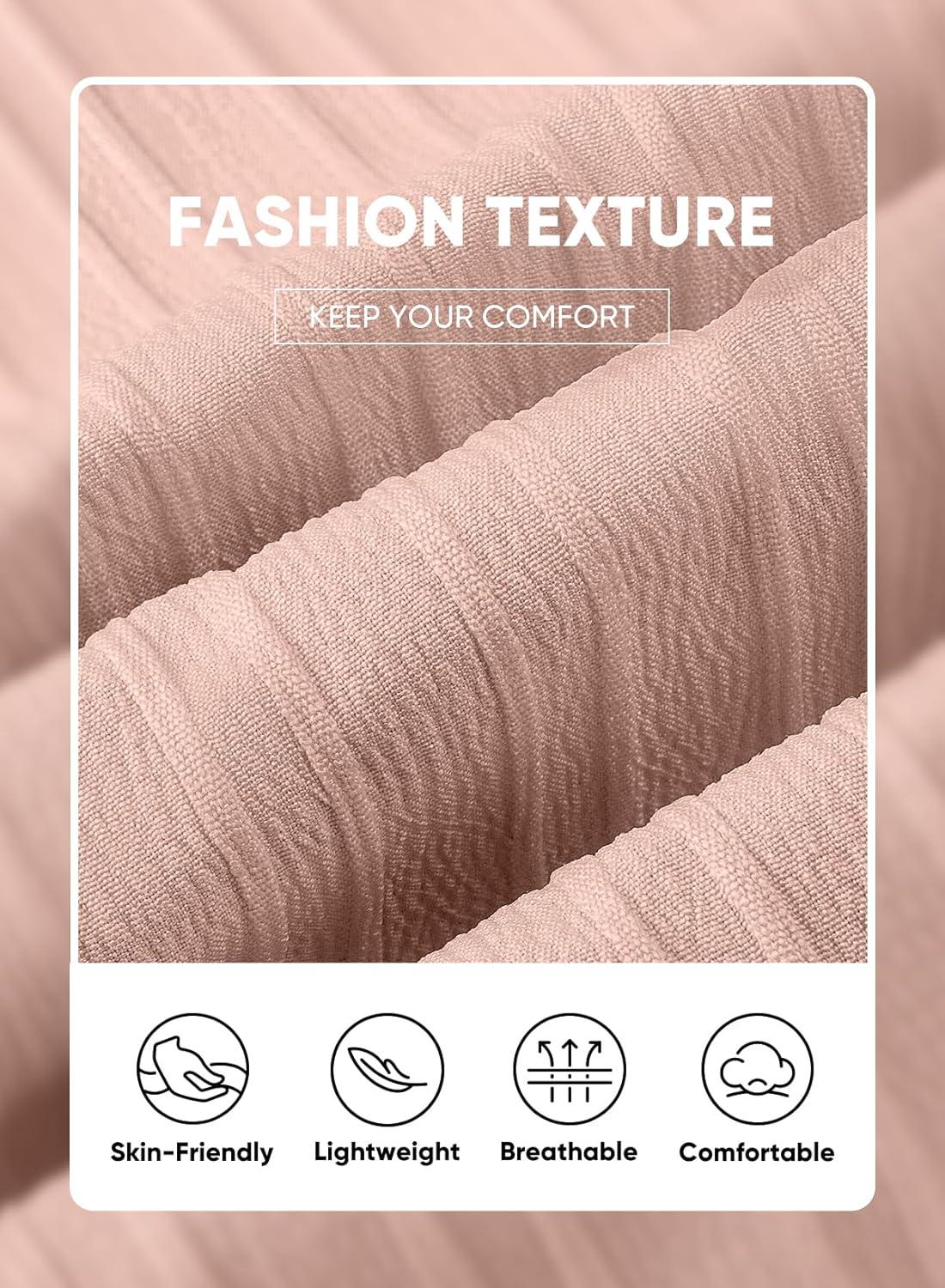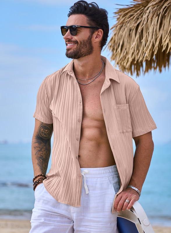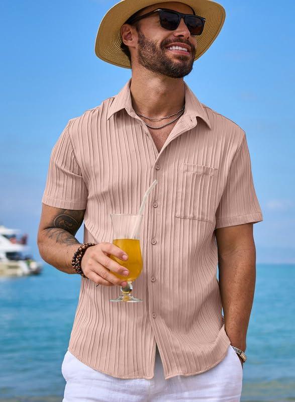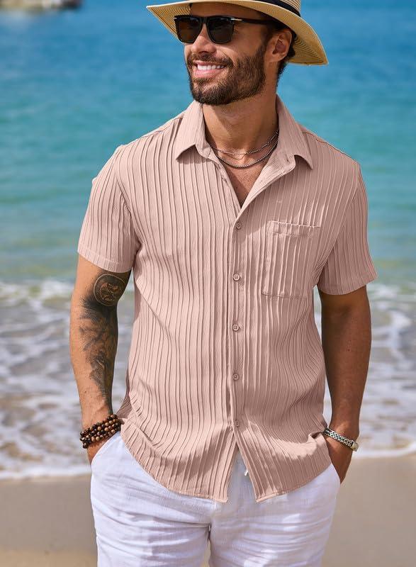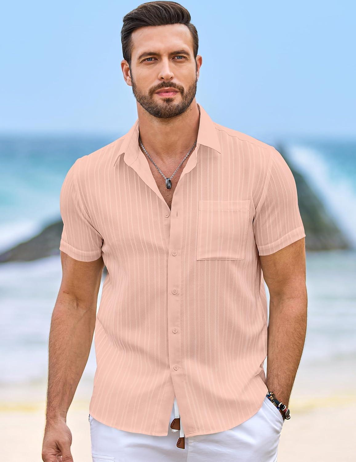 JMIERR Hawaiian Shirt for Men Button Down Short Sleeve Shirts Textured Casual Summer Beach Linen Shirts(B Pink)