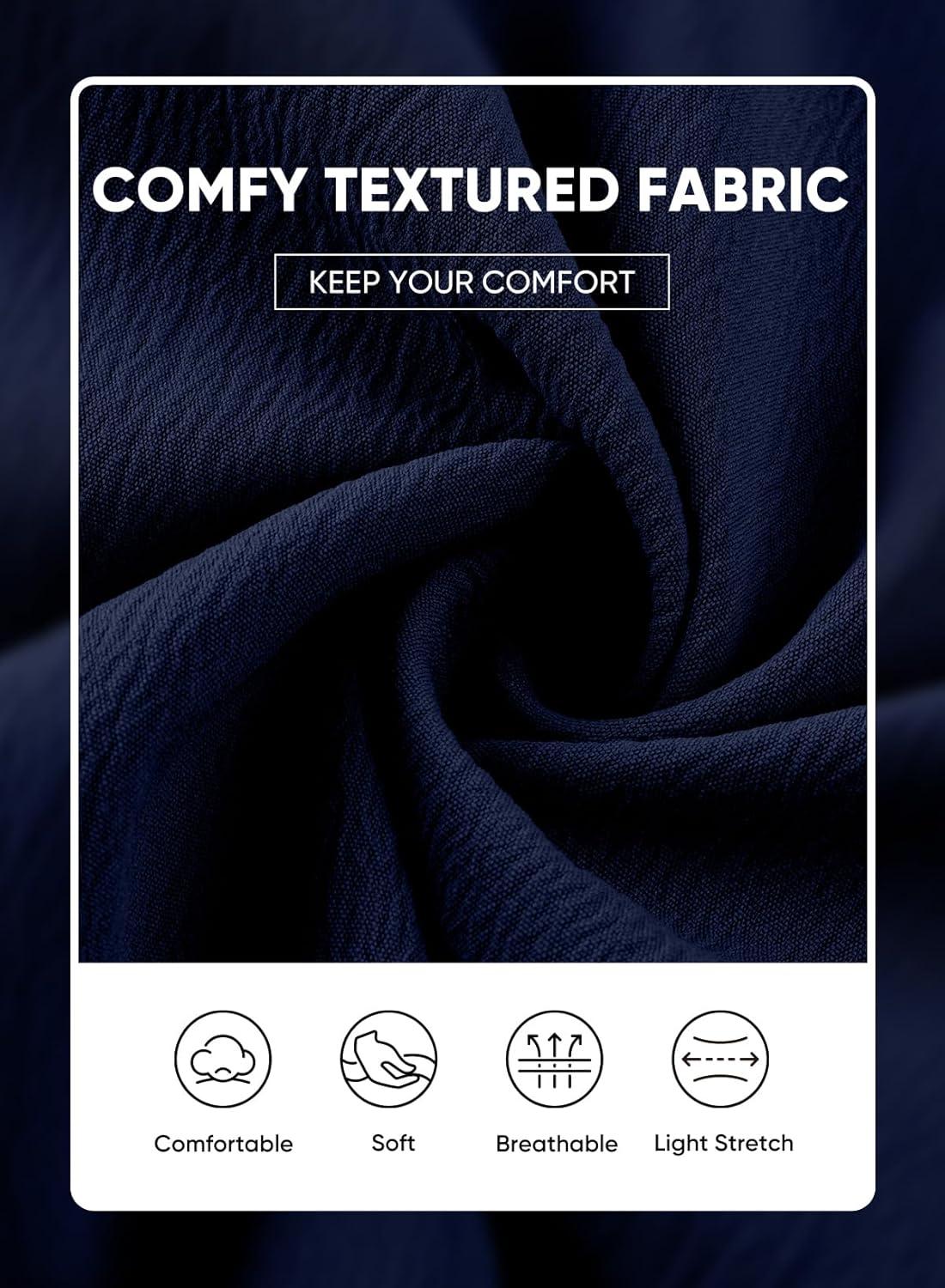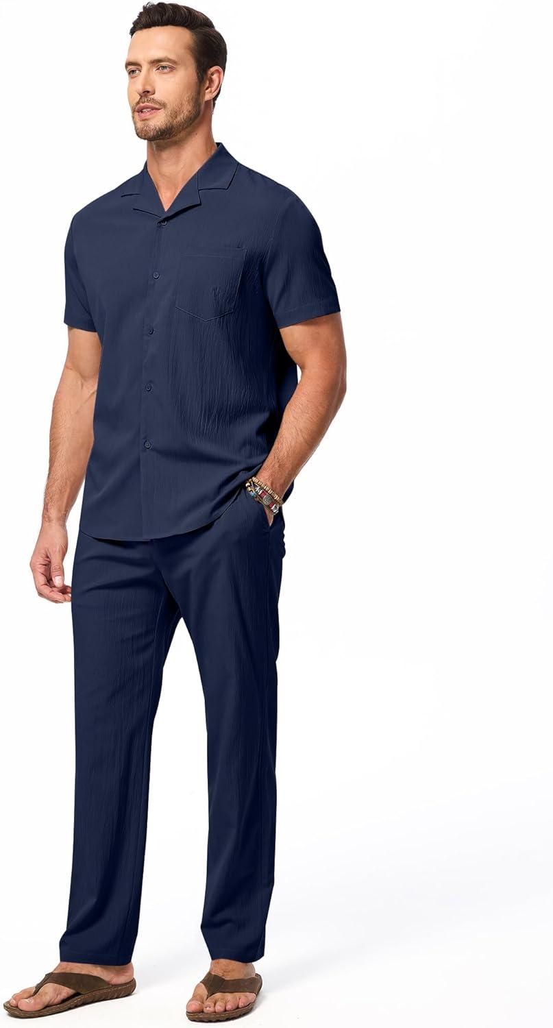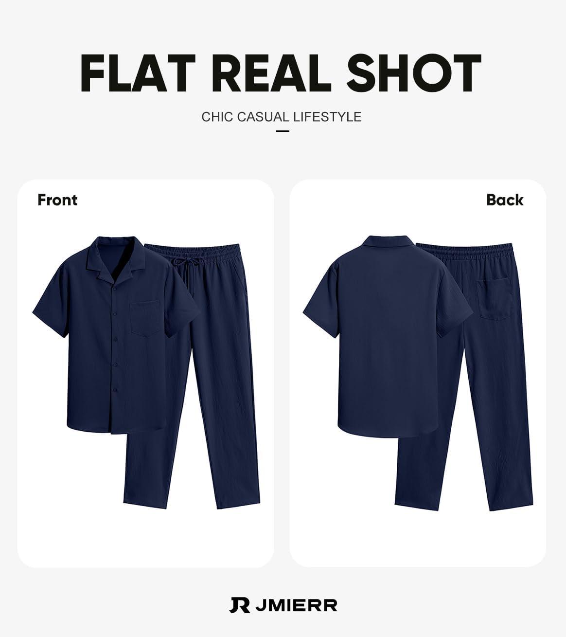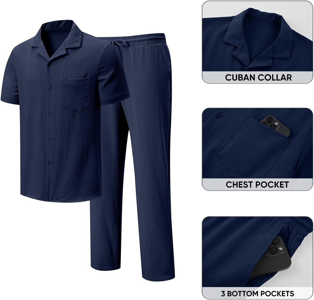 JMIERR Men 2 Piece Outfit Short Sleeve Beach Button Down Shirt Casual Loose Pant Sets with Pocket(A Blue)