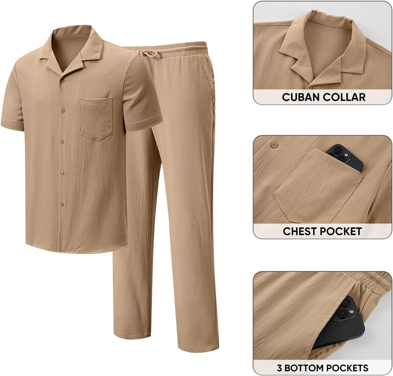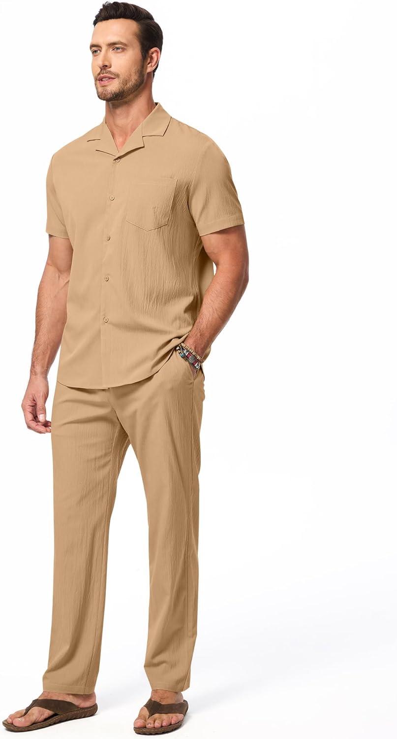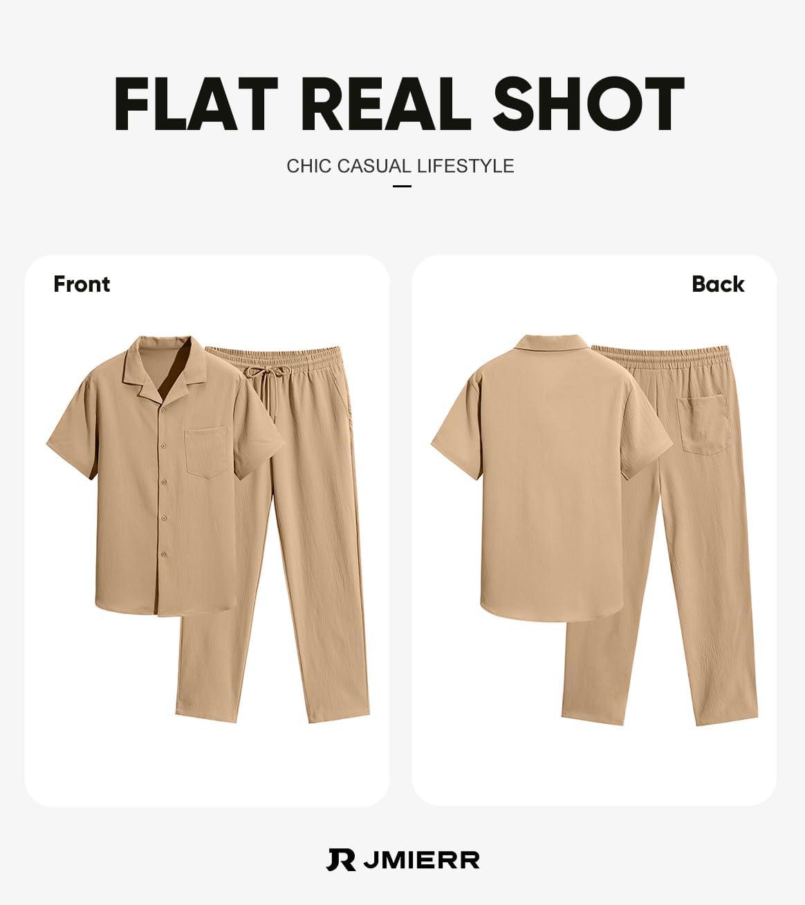 JMIERR Men 2 Piece Outfit Short Sleeve Beach Button Down Shirt Casual Loose Pant Sets with Pocket(A Khaki)