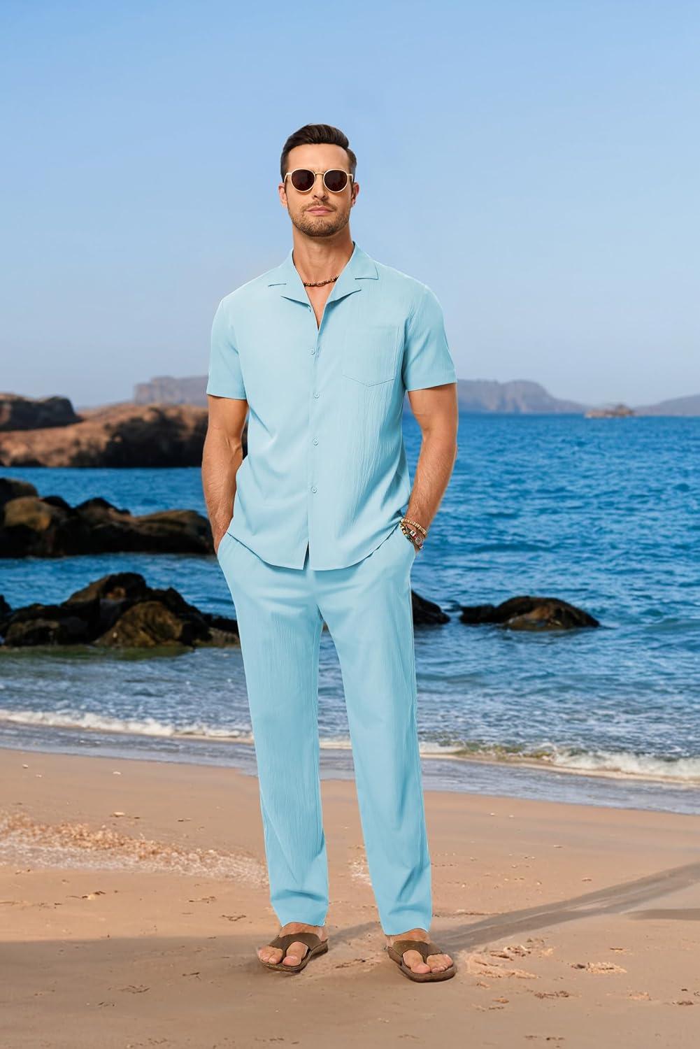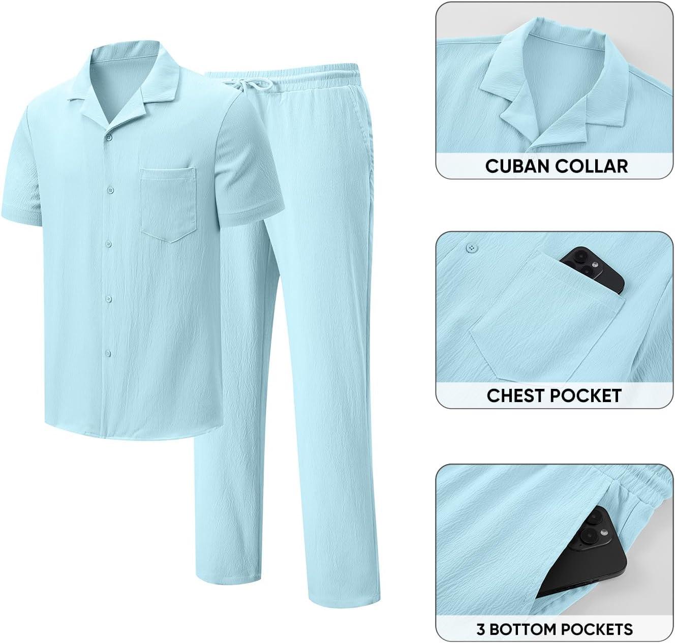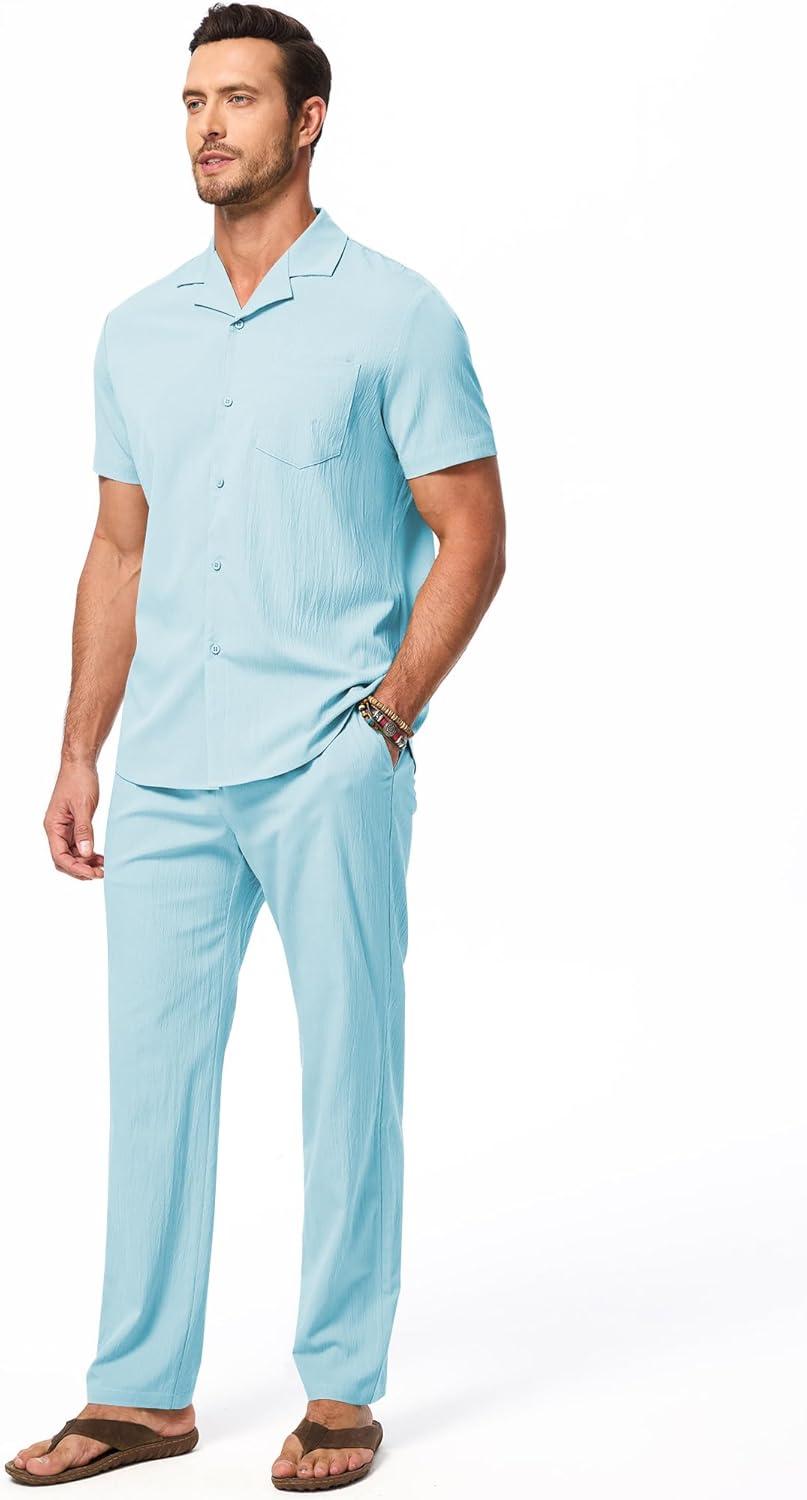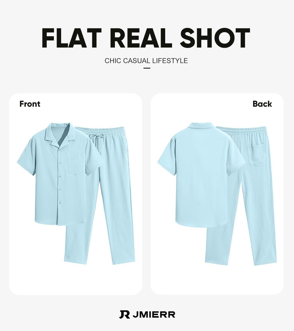 JMIERR Men 2 Piece Outfit Short Sleeve Beach Button Down Shirt Casual Loose Pant Sets with Pocket(D Light Blue)