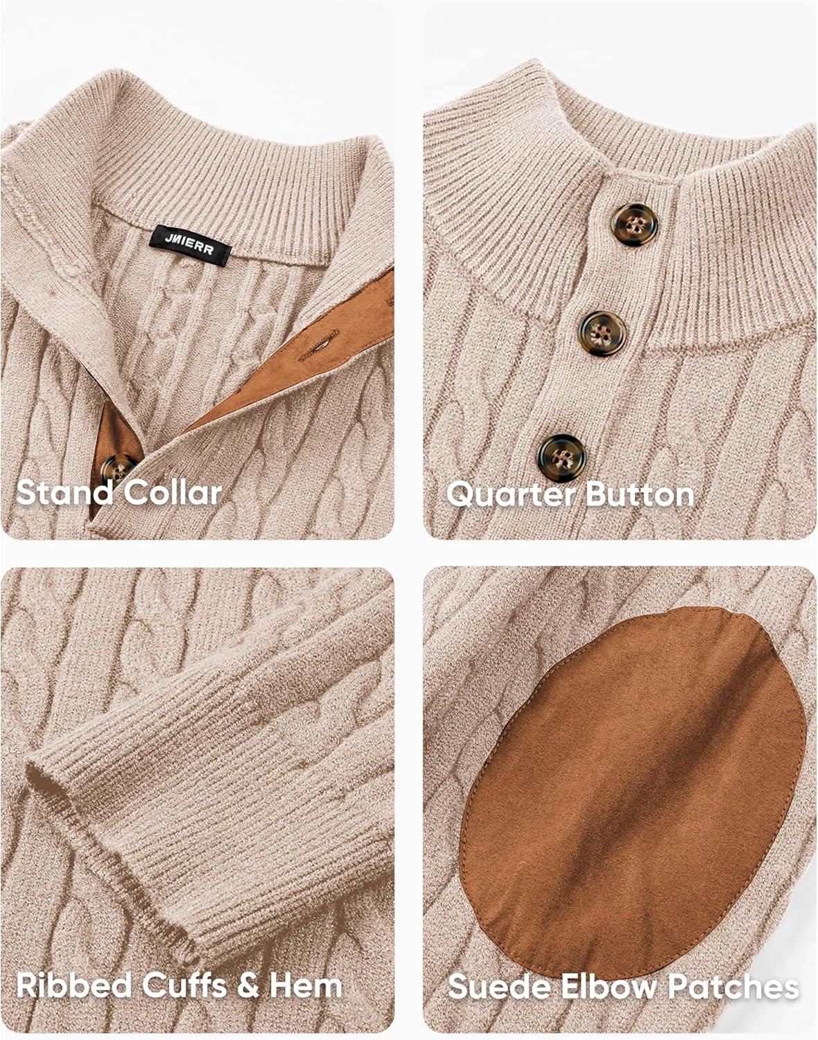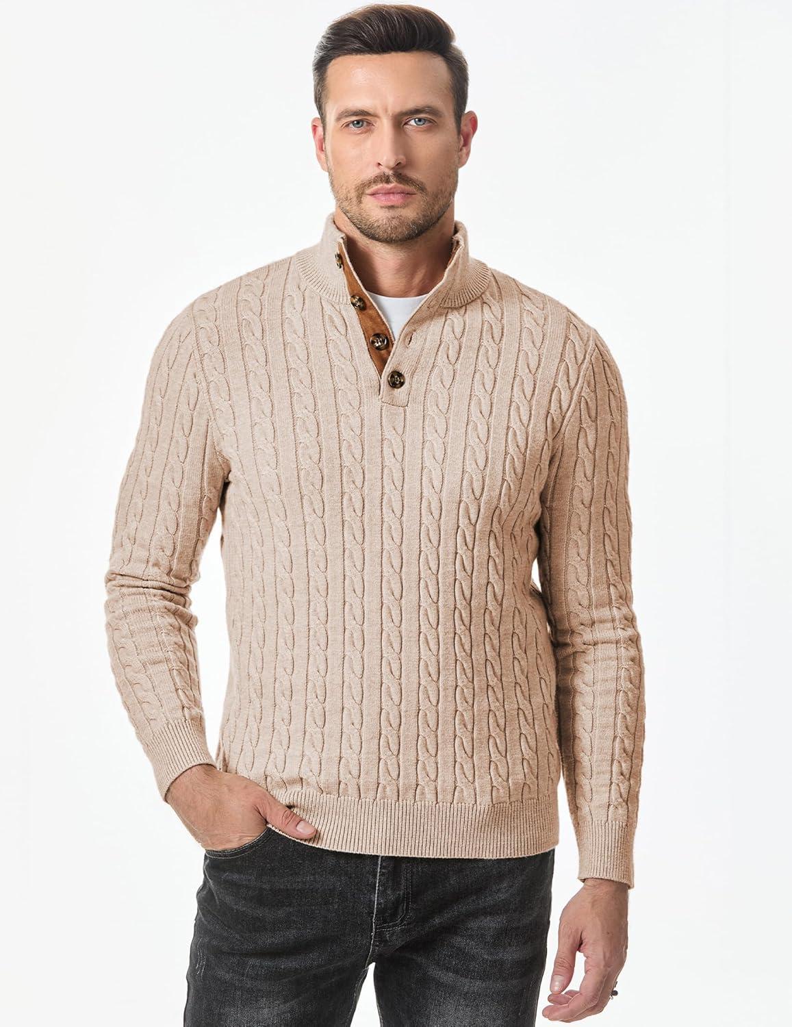 JMIERR Men’s Cable Knit Pullover Sweater Casual Long Sleeve Stand Collar Button Knitted Sweaters(02 Beige)