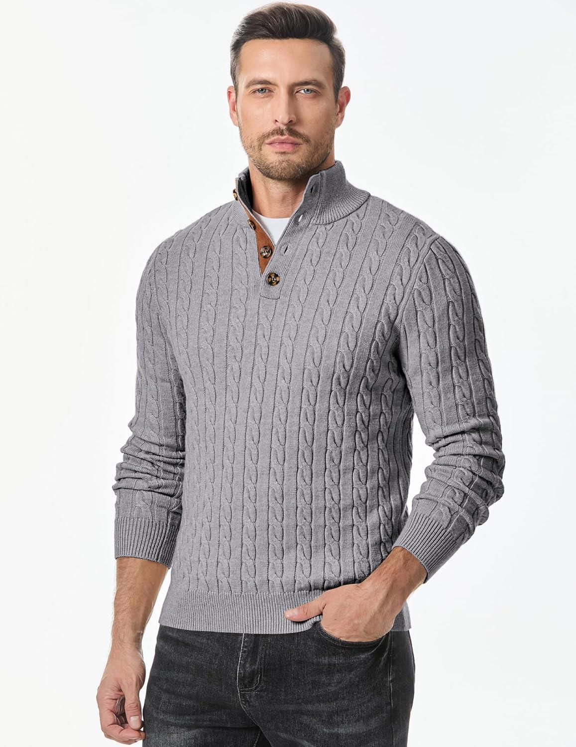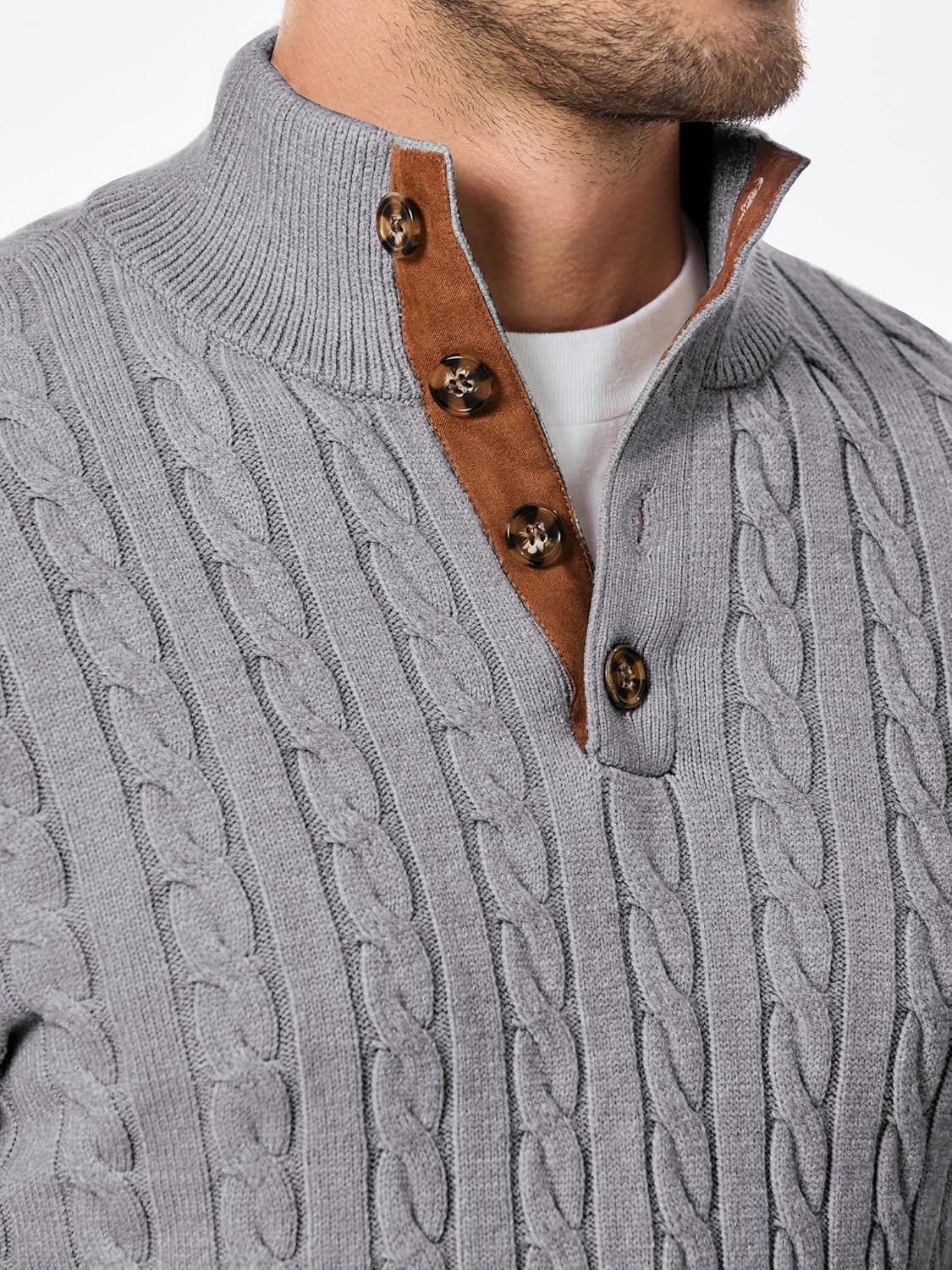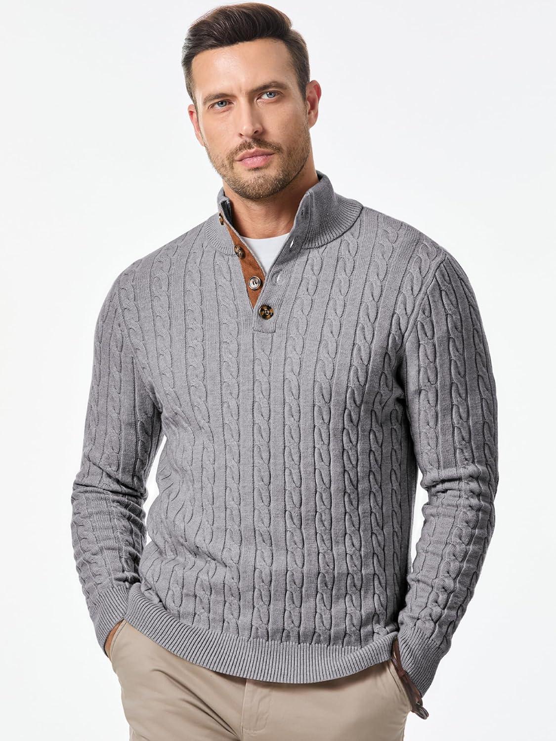 JMIERR Men’s Cable Knit Pullover Sweater Casual Long Sleeve Stand Collar Button Knitted Sweaters(Grey)