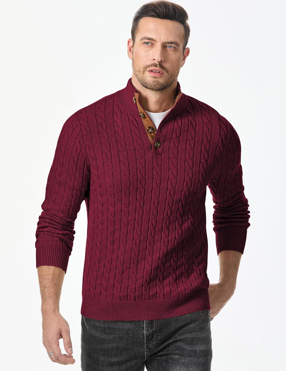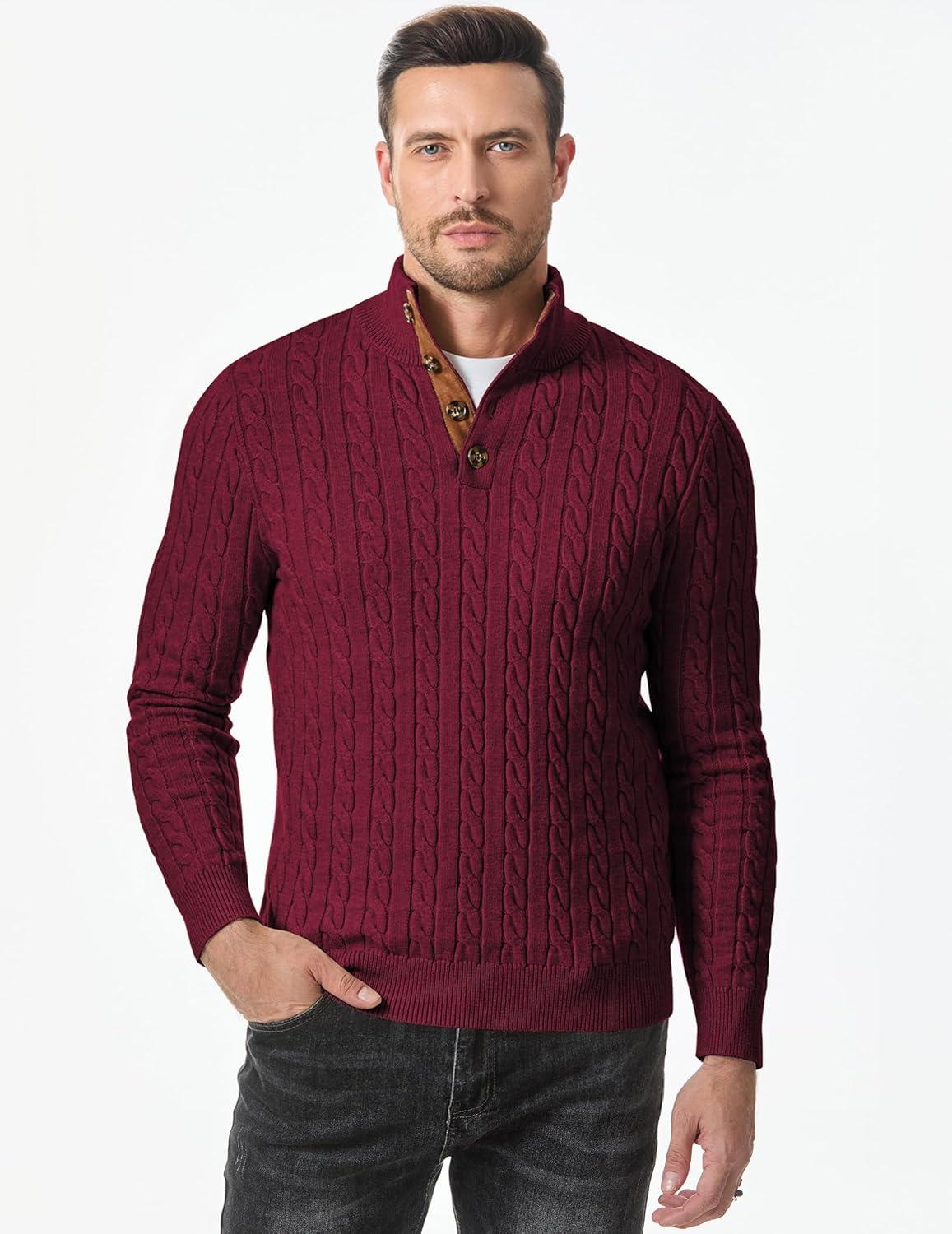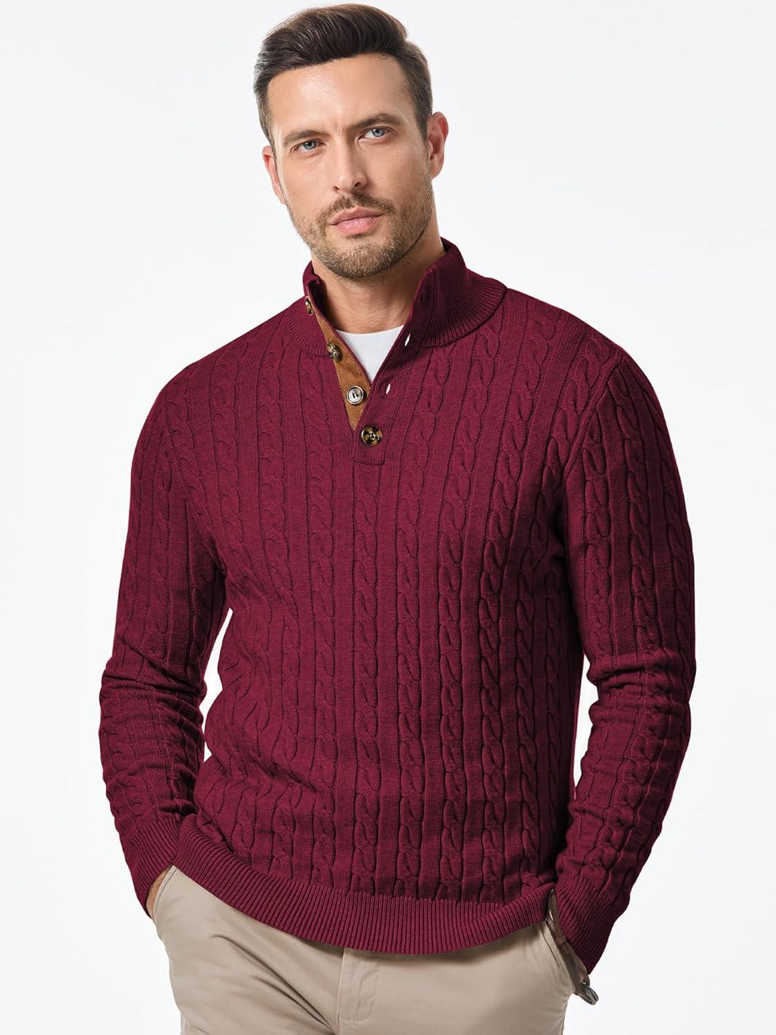JMIERR Men’s Cable Knit Pullover Sweater Casual Long Sleeve Stand Collar Button Knitted Sweaters(Red)