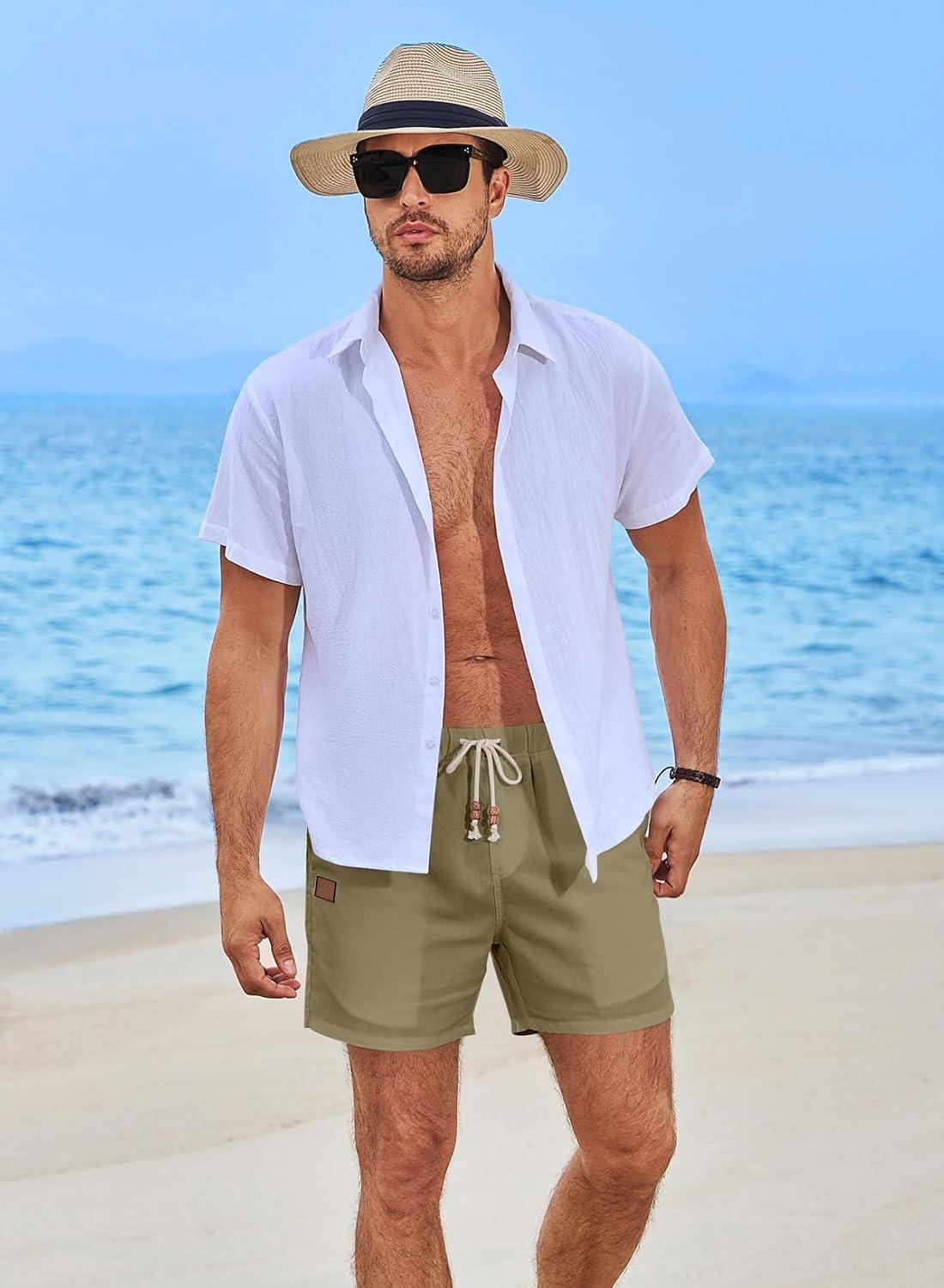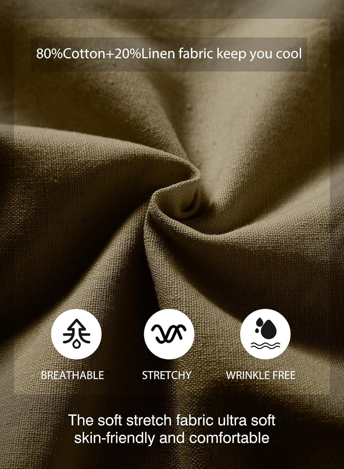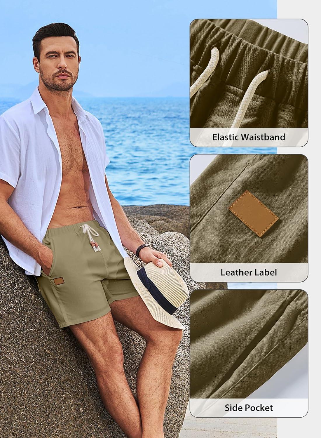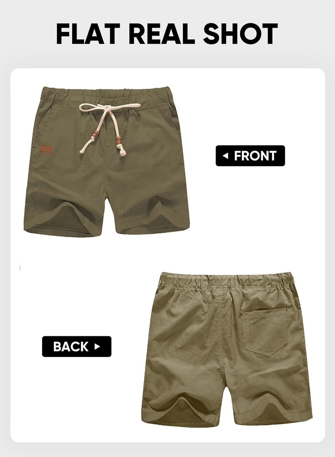 JMIERR Mens Casual 5″/ 7″ Cotton Linen Shorts – Elastic Waist Drawstring Summer Beach Shorts with Pockets(B Green)