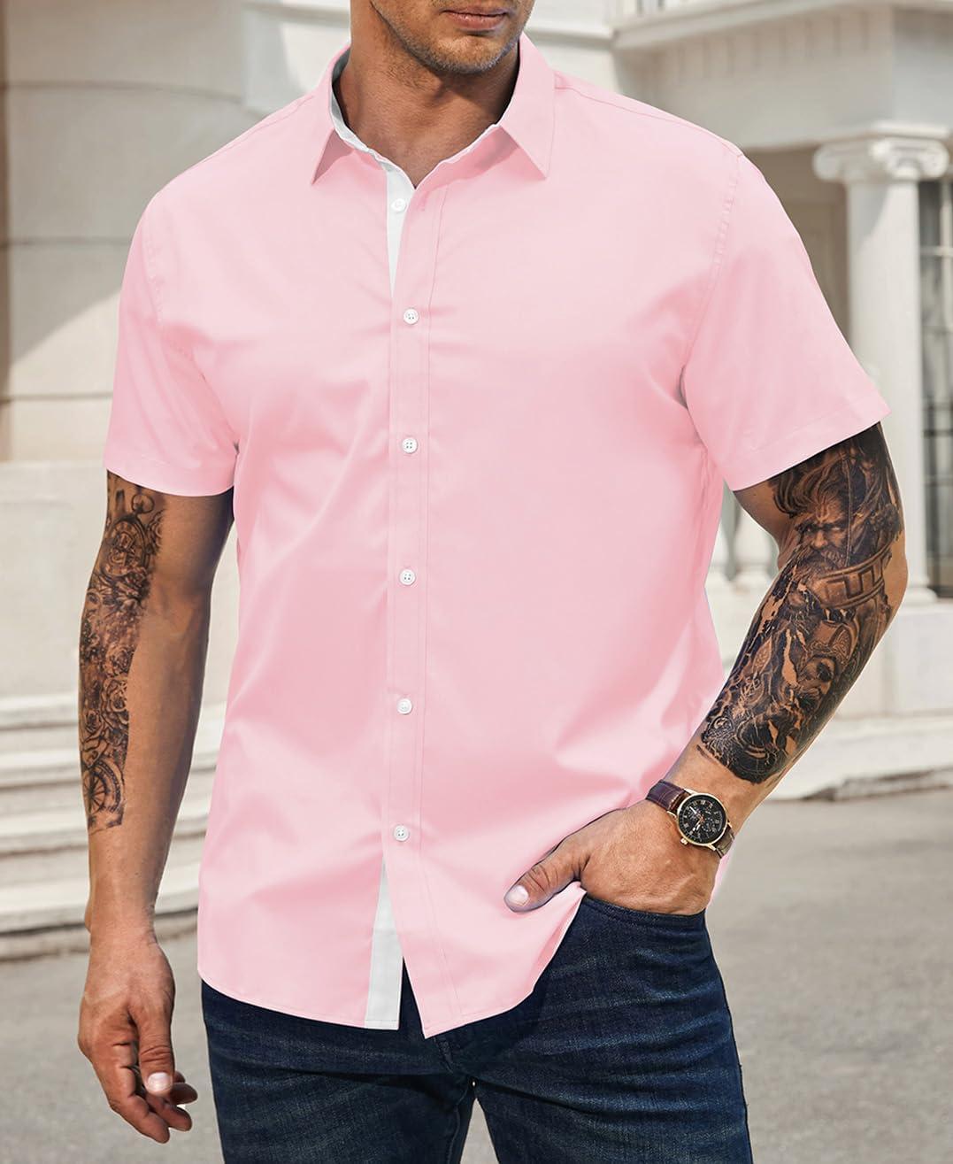 JMIERR Men’s Casual Button Down Shirts Wrinkle-Free Short Sleeve Business Dress Shirt(Pink)
