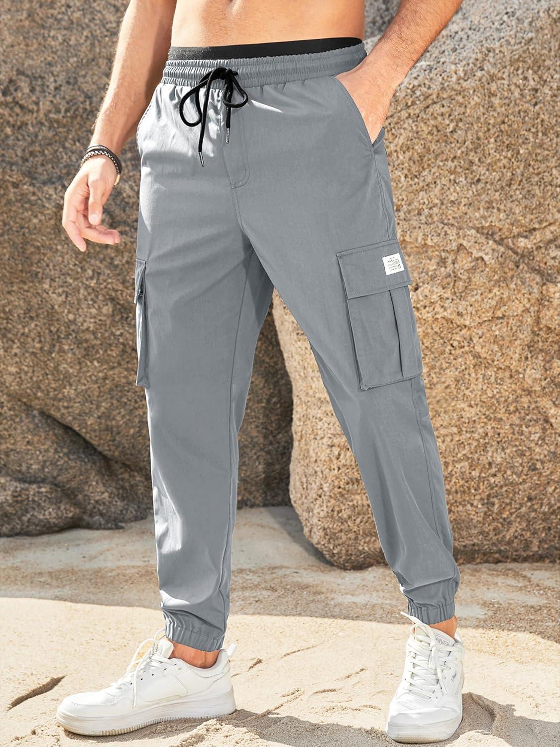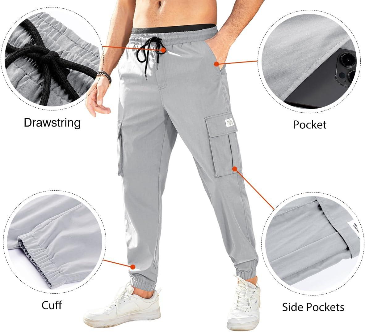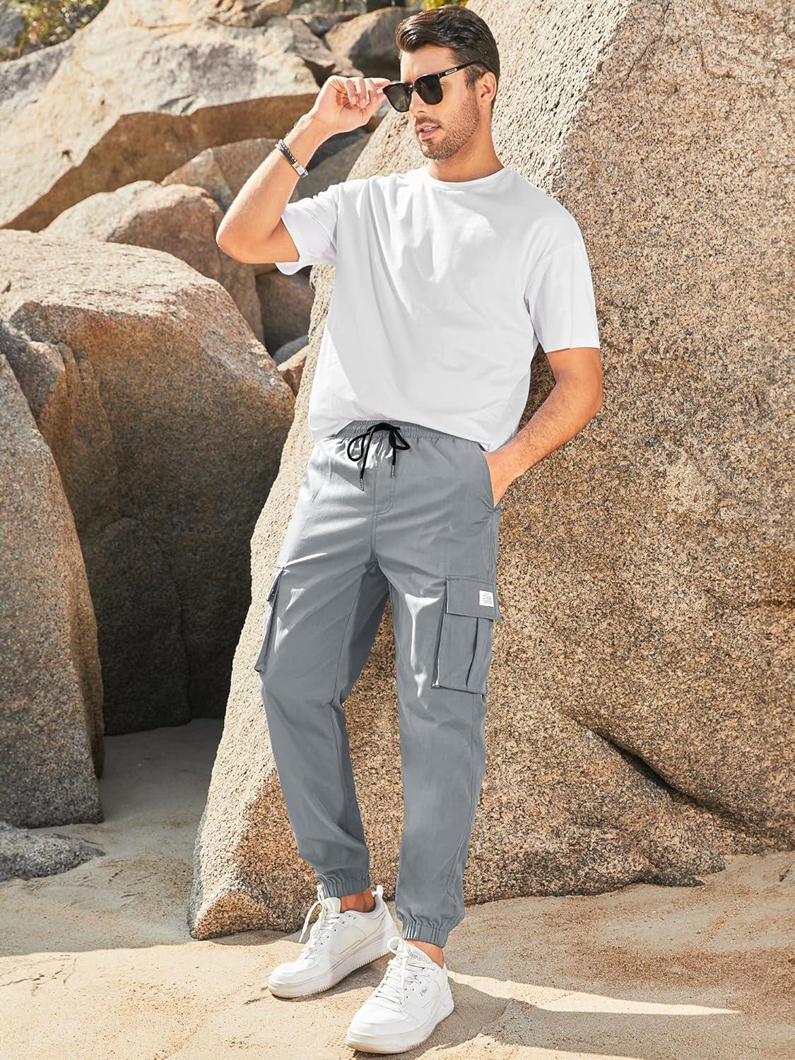 JMIERR Mens Casual Cargo Pants Stretch Elastic Waist Drawstring Joggers Pants Tapered Sweatpants for Men Multi Pockets(Light Grey)