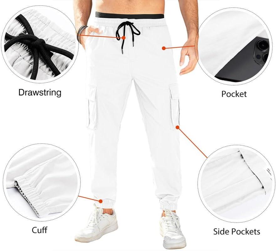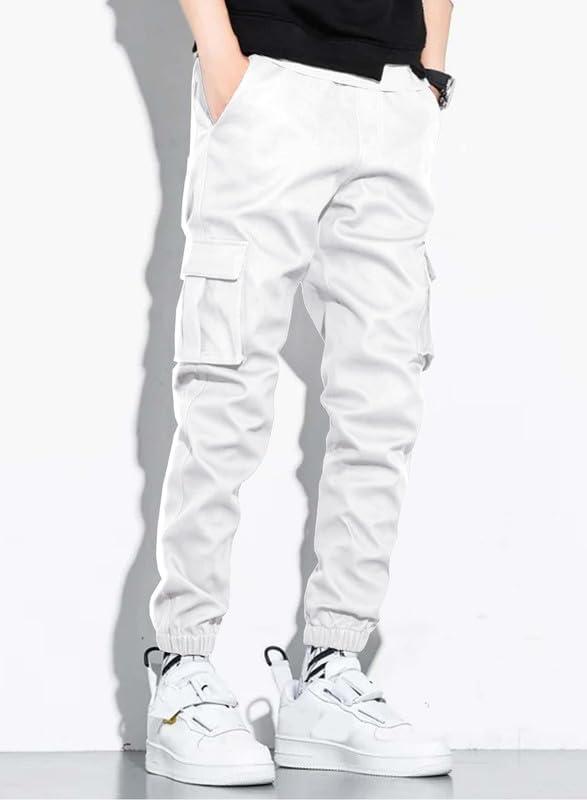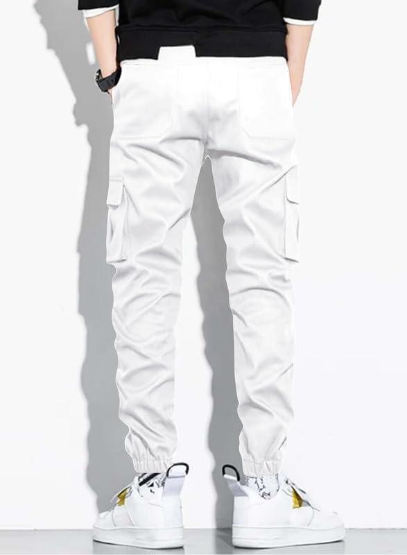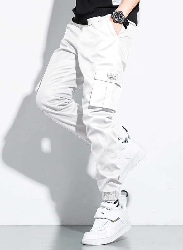 JMIERR Mens Casual Cargo Pants Stretch Elastic Waist Drawstring Joggers Pants Tapered Sweatpants for Men Multi Pockets(White)