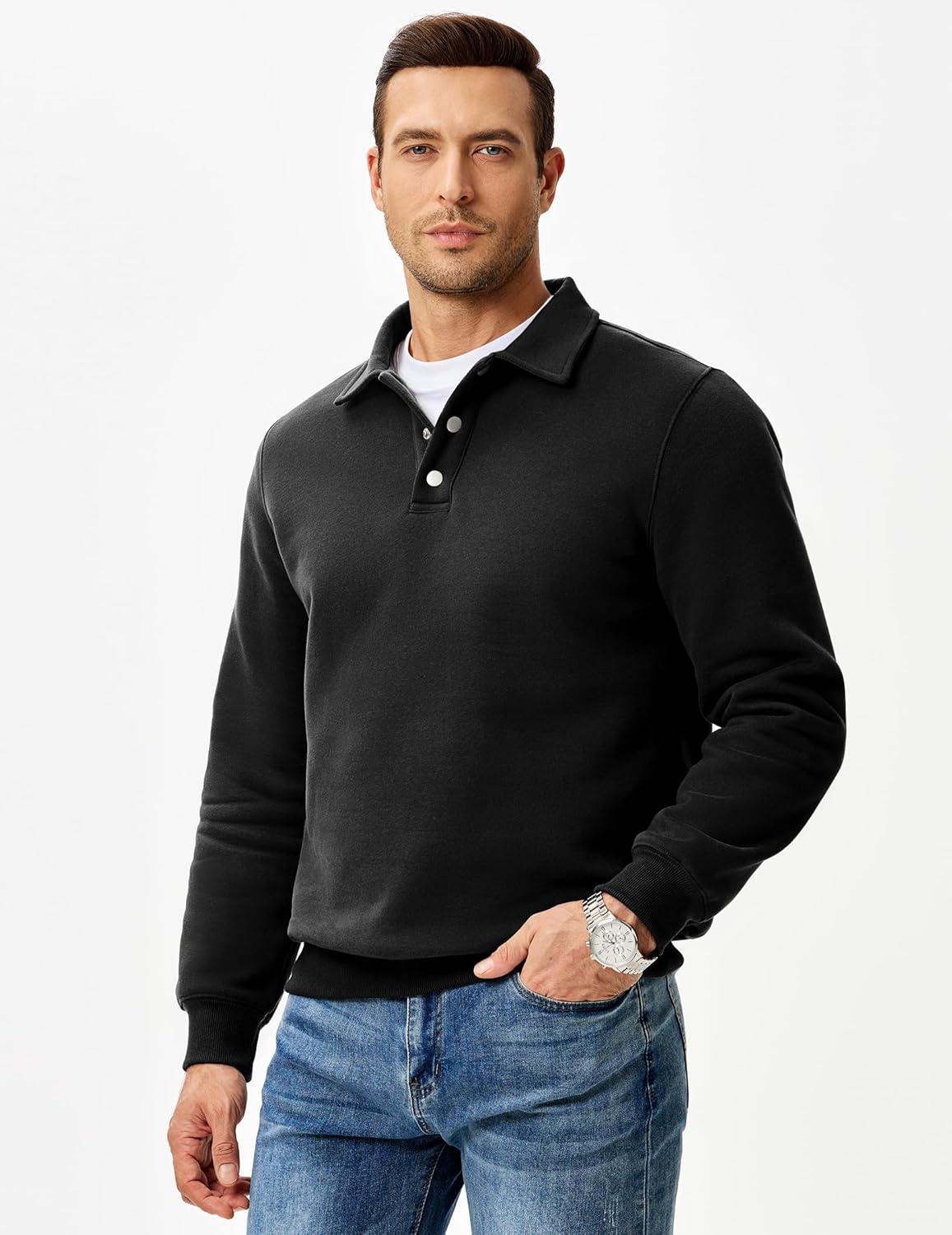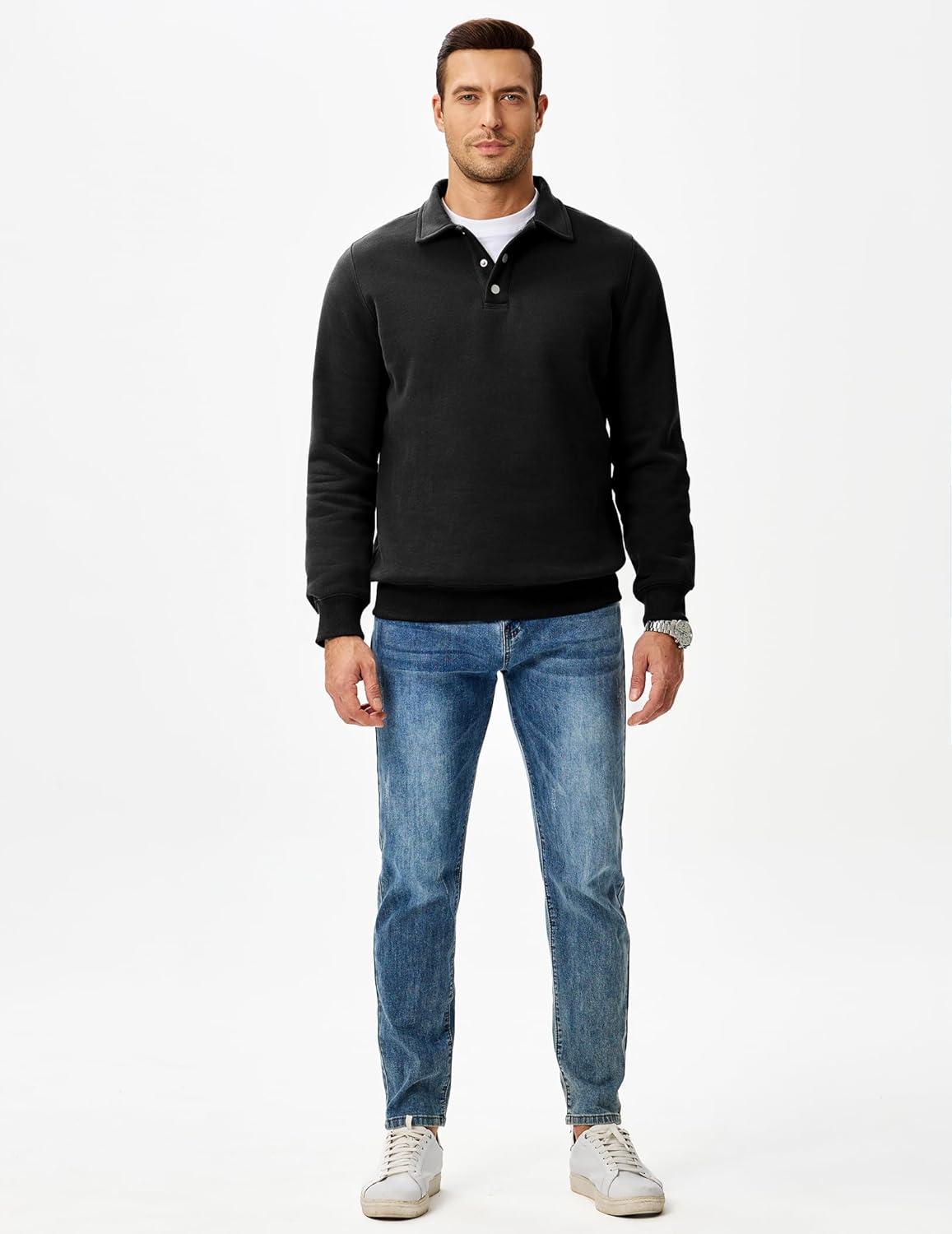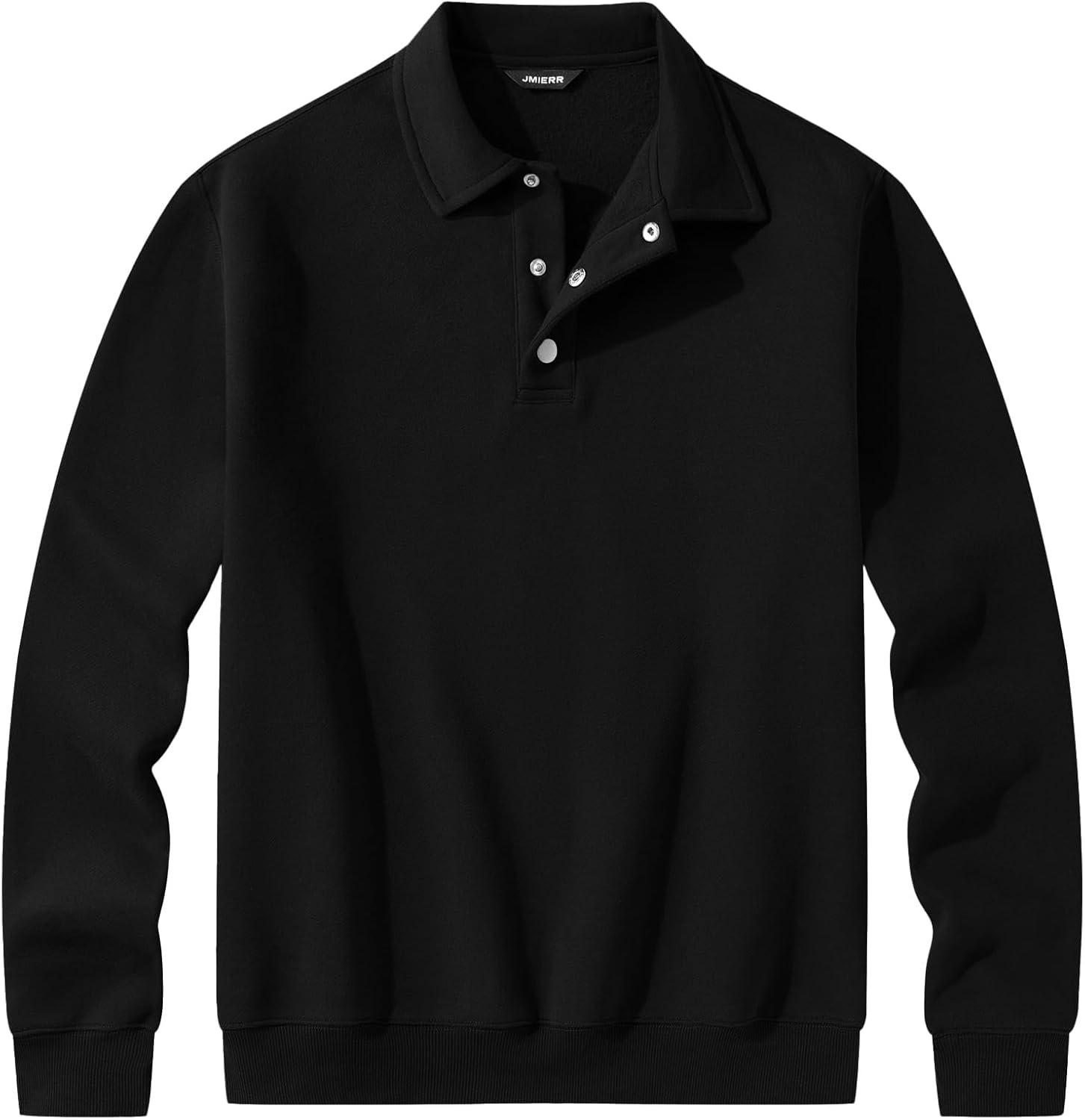 JMIERR Mens Casual Cotton Polo Sweatshirts Long Sleeve Button Collared Pullover Shirts(Black)