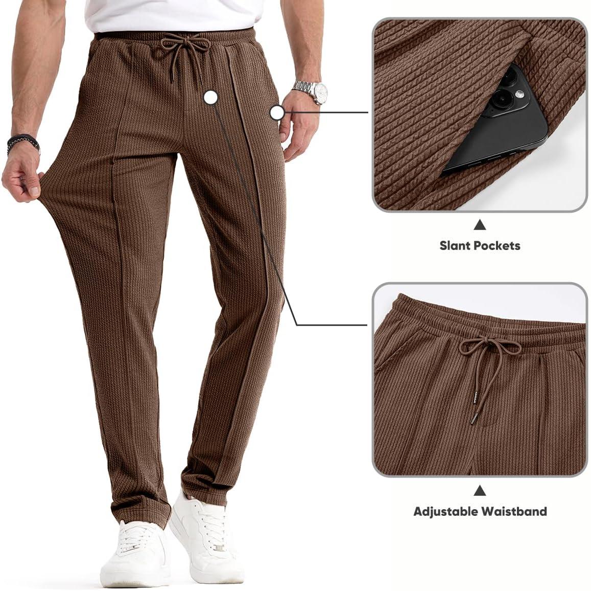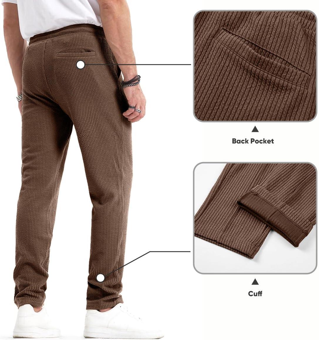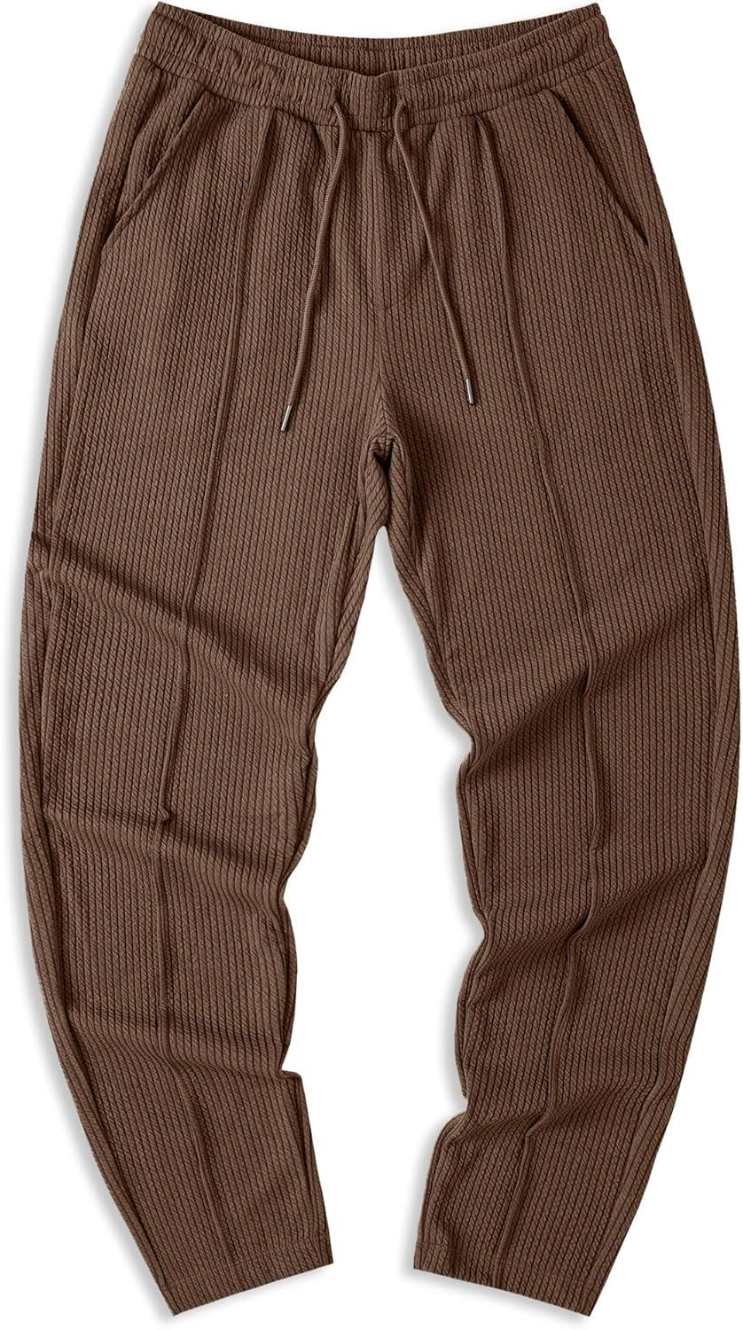 JMIERR Men’s Casual Pants Lightweight Stretch Ribbed Knit Textured Drawstring Slim Fit Tapered Pants with Pockets(Dark Brown)