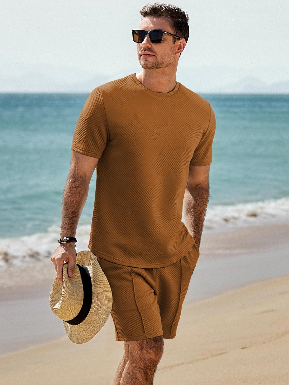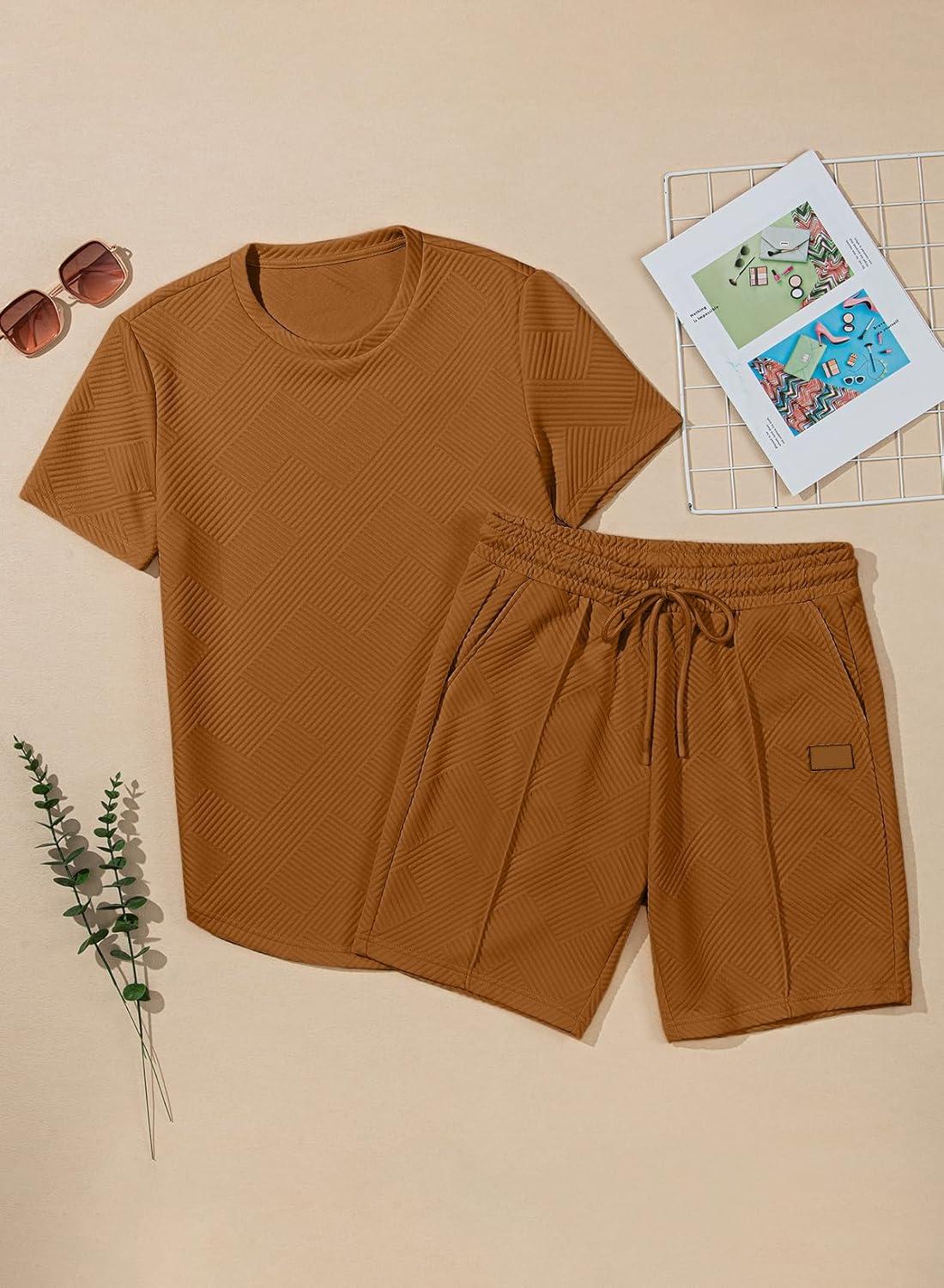 JMIERR Men’s Casual Short Sleeve T Shirts and Shorts Summer Beach Vacation 2 Piece Outfit Lounge Workout Sets(A6 Brown)