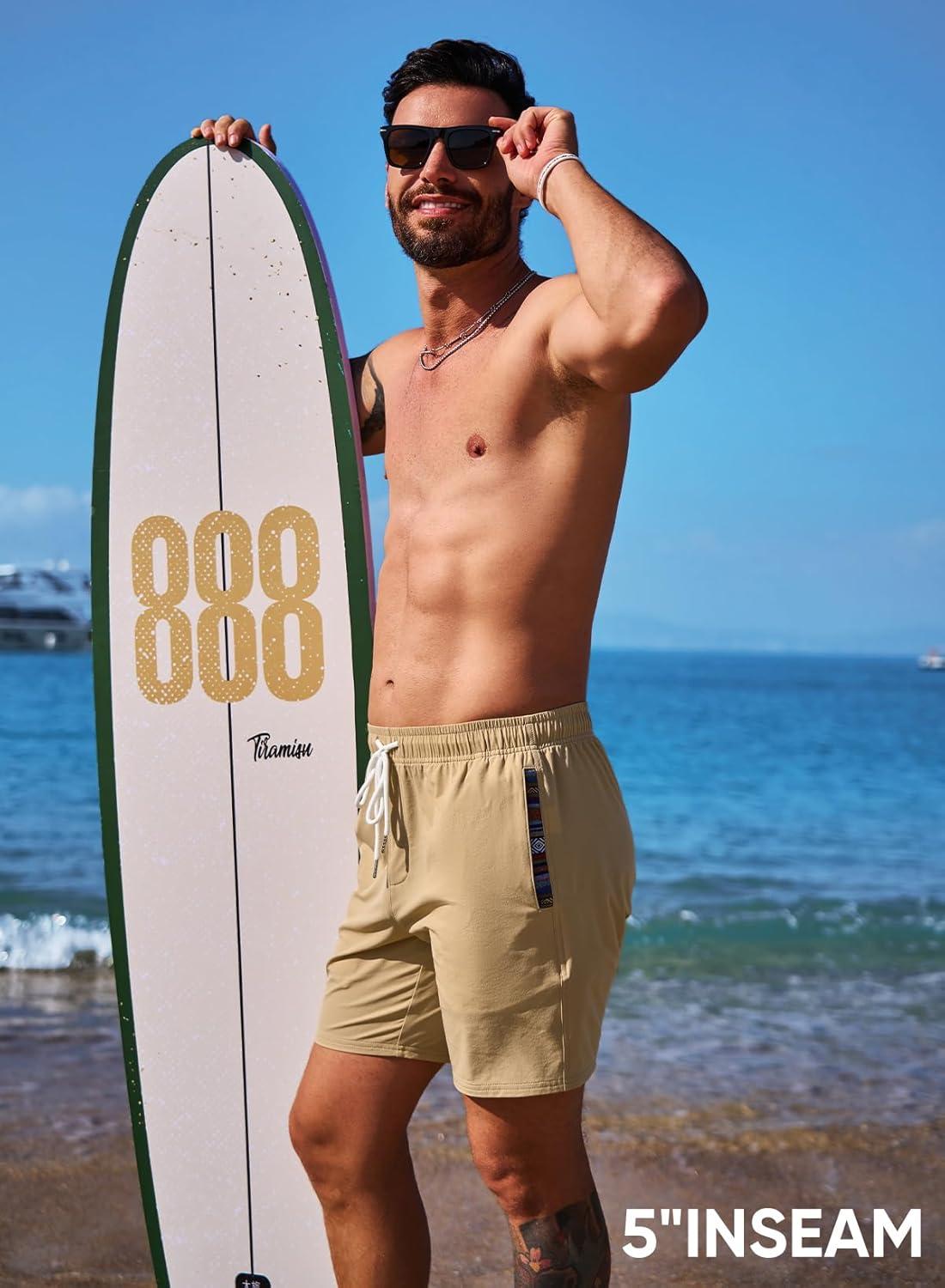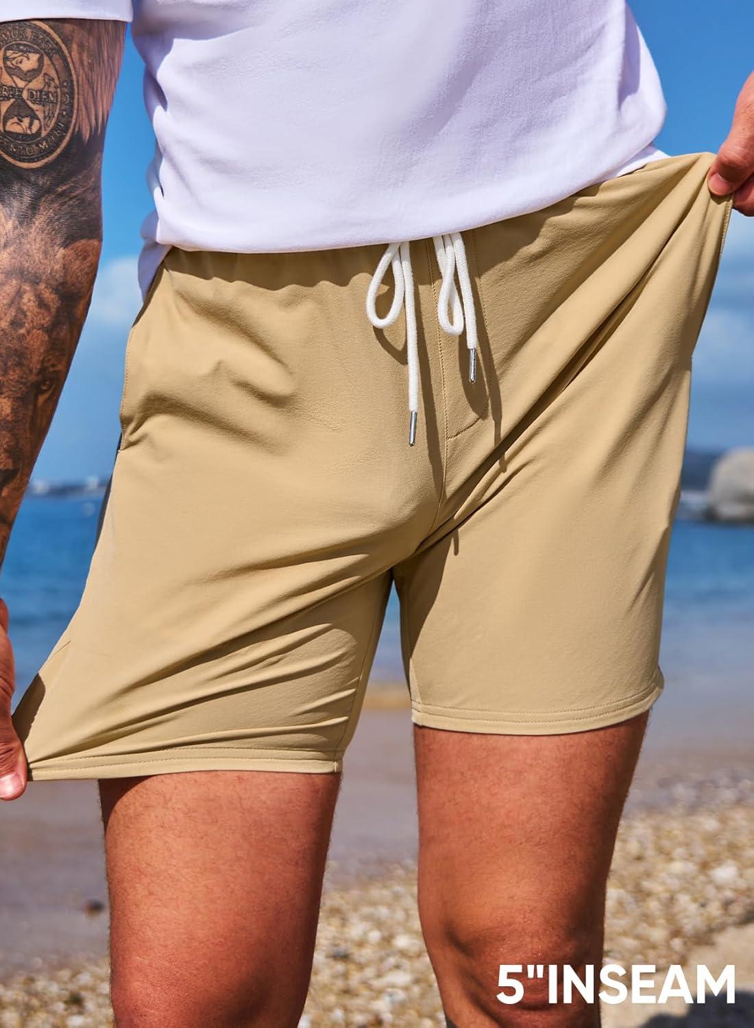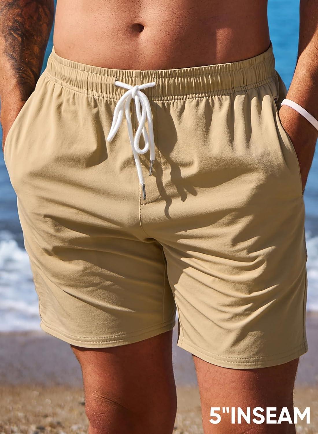 JMIERR Men’s Casual Shorts 5″/ 7″ Drawstring Summer Quick Dry Beach Stretch Waist Athletic Gym Short(5″ A2-tan)