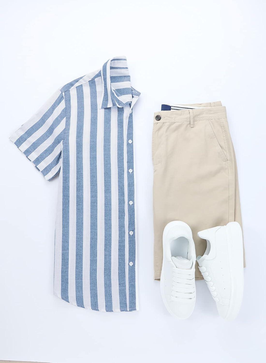 JMIERR Men’s Casual Stylish Short Sleeve Button-Up Striped Dress Shirt Cotton Beach Shirts(1 Sky Blue Stripe)