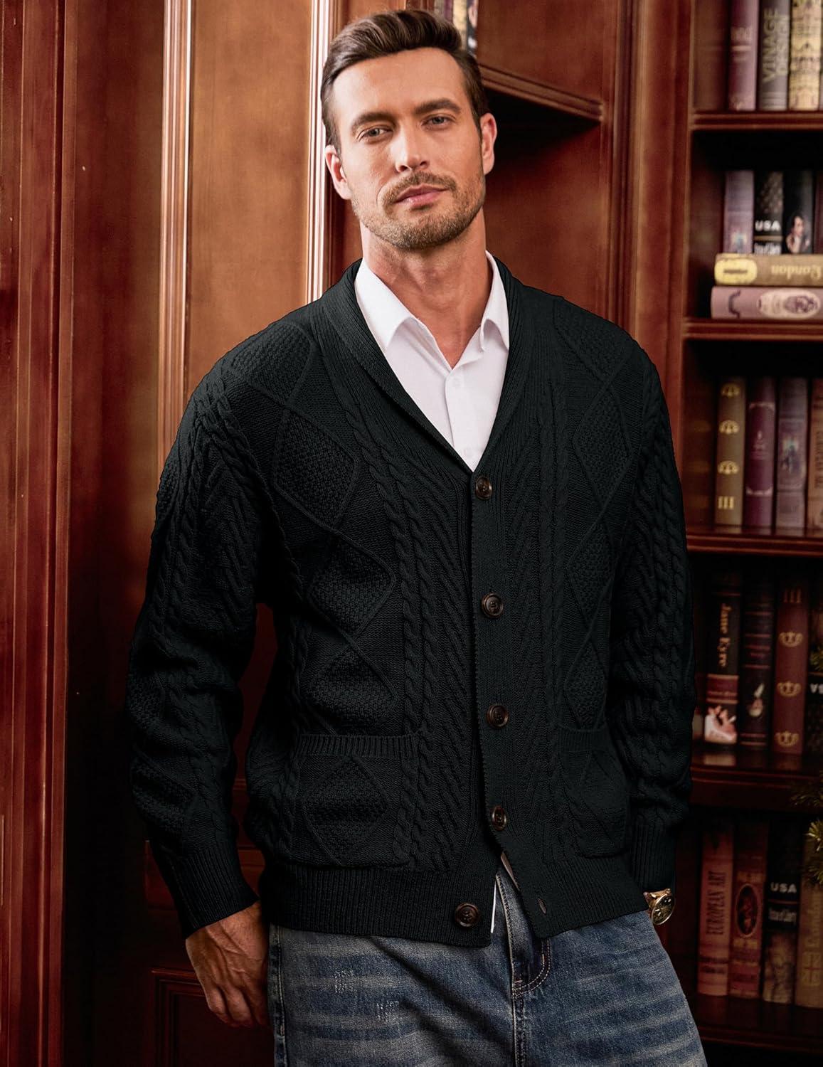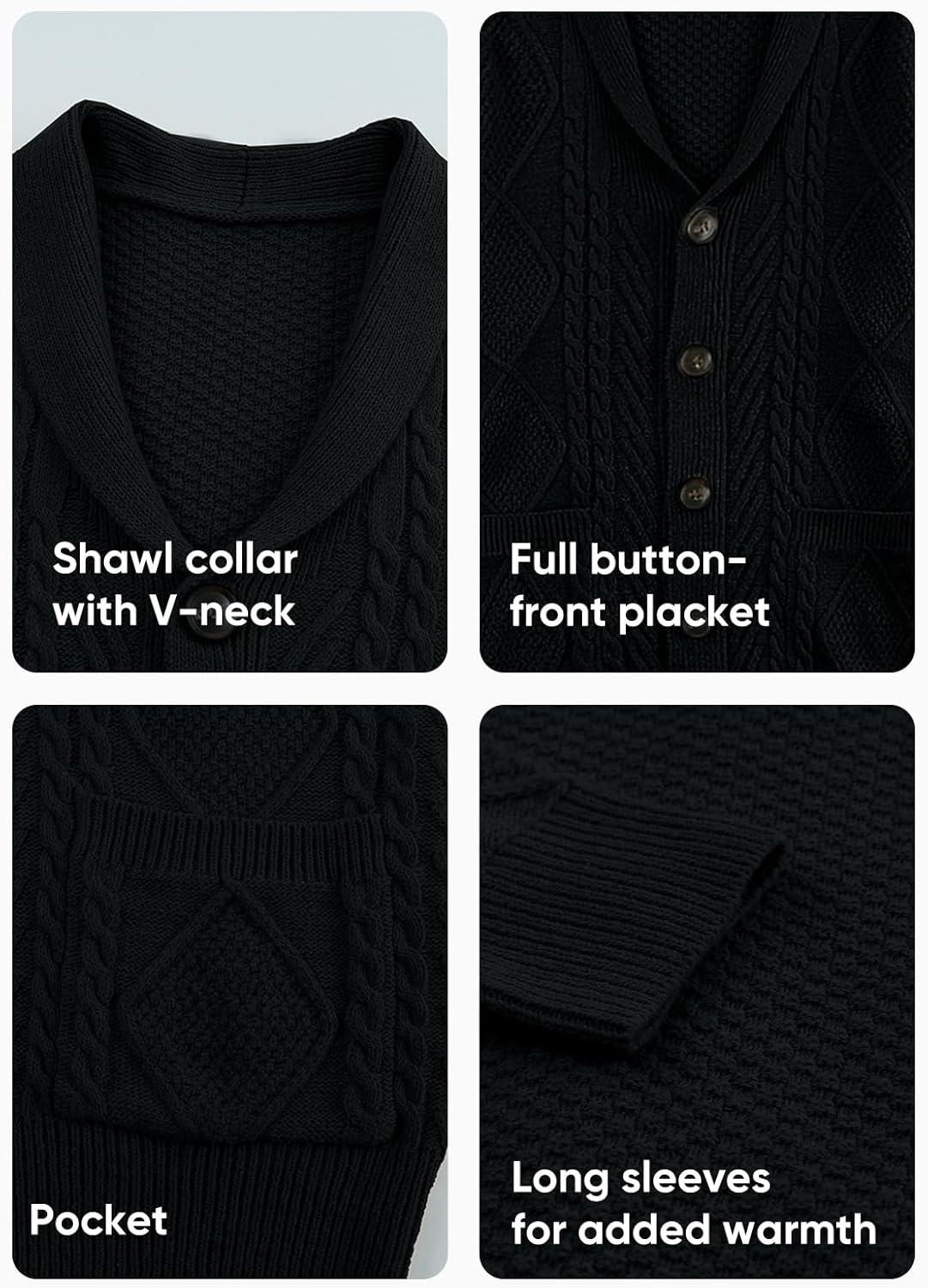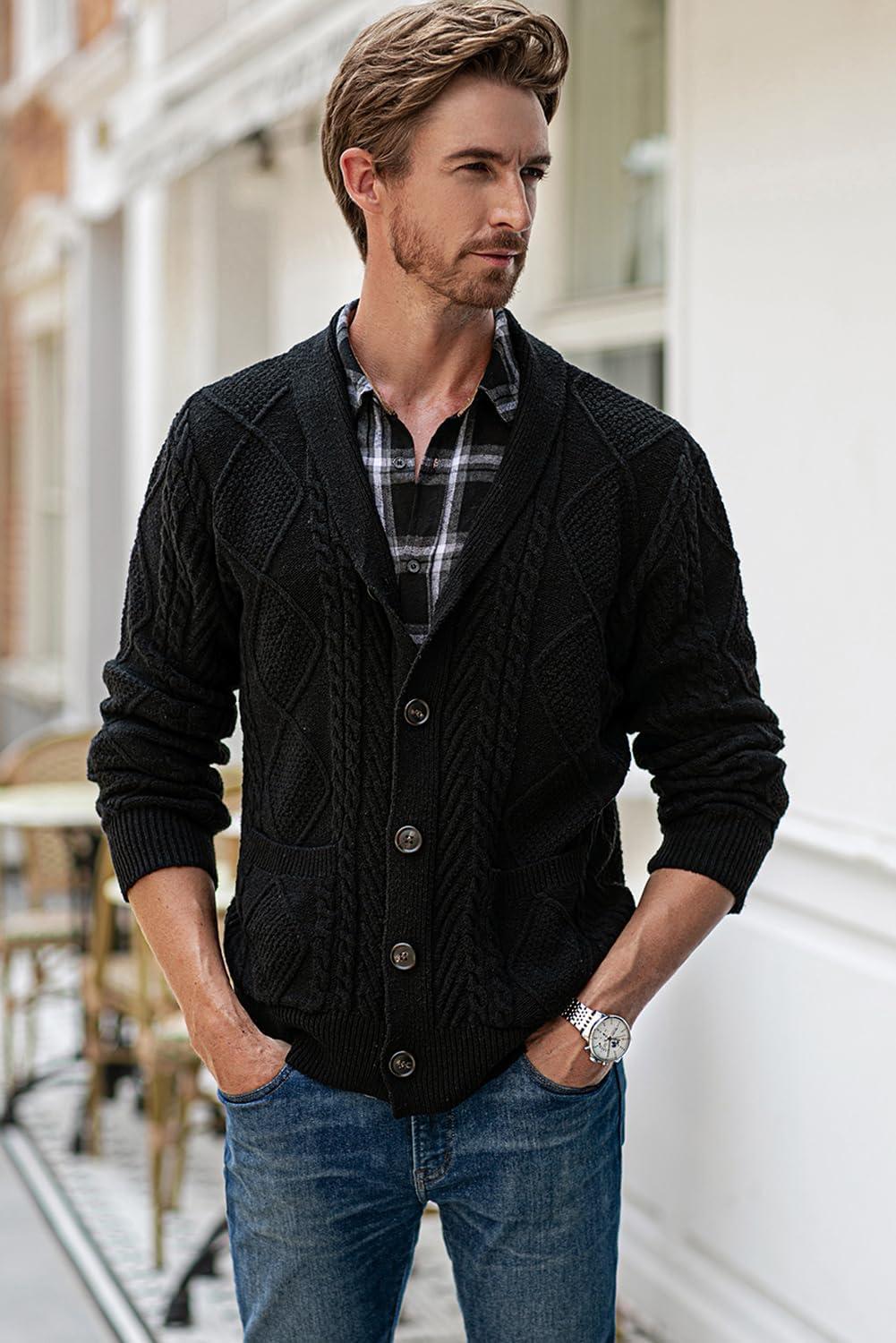 JMIERR Men’s Casual Wool Blend Cardigan Sweaters Long Sleeve Shawl Collar Buttons Down Cable Knit Sweater(1 Black)