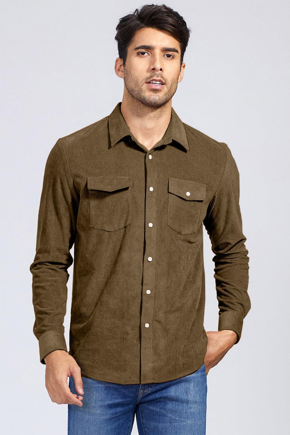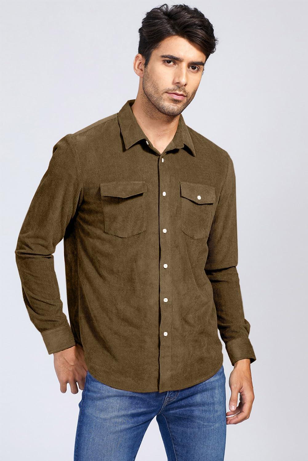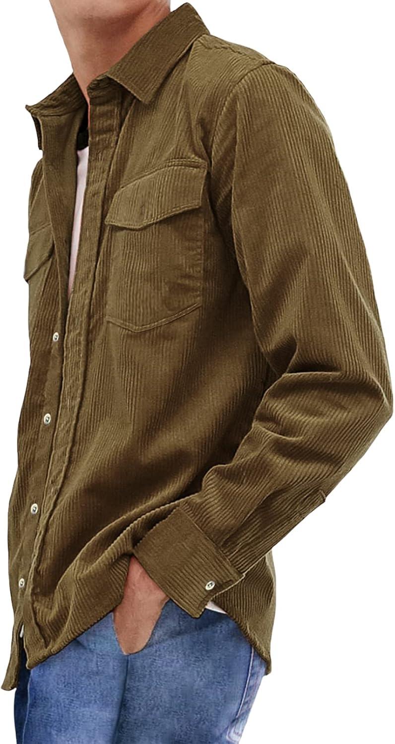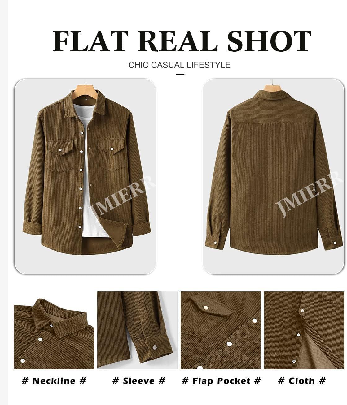 JMIERR Men’s Corduroy Button Down Shirts Casual Long Sleeve Shacket Jacket with Flap Pockets(A2 Dark Khaki)