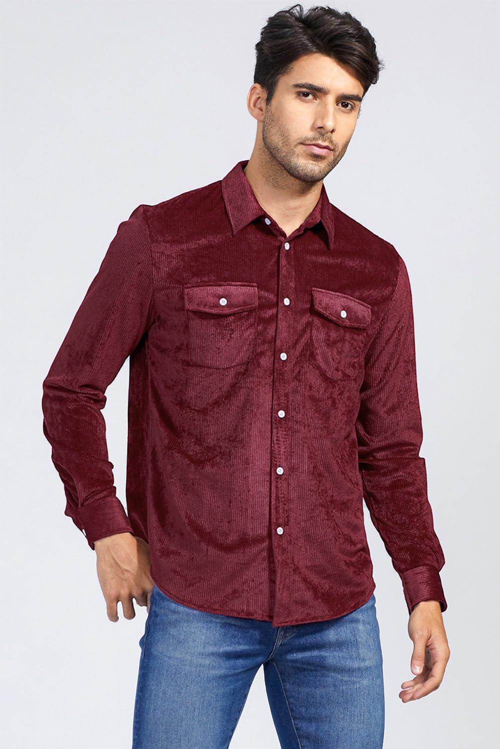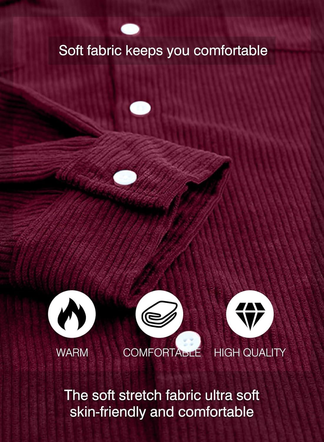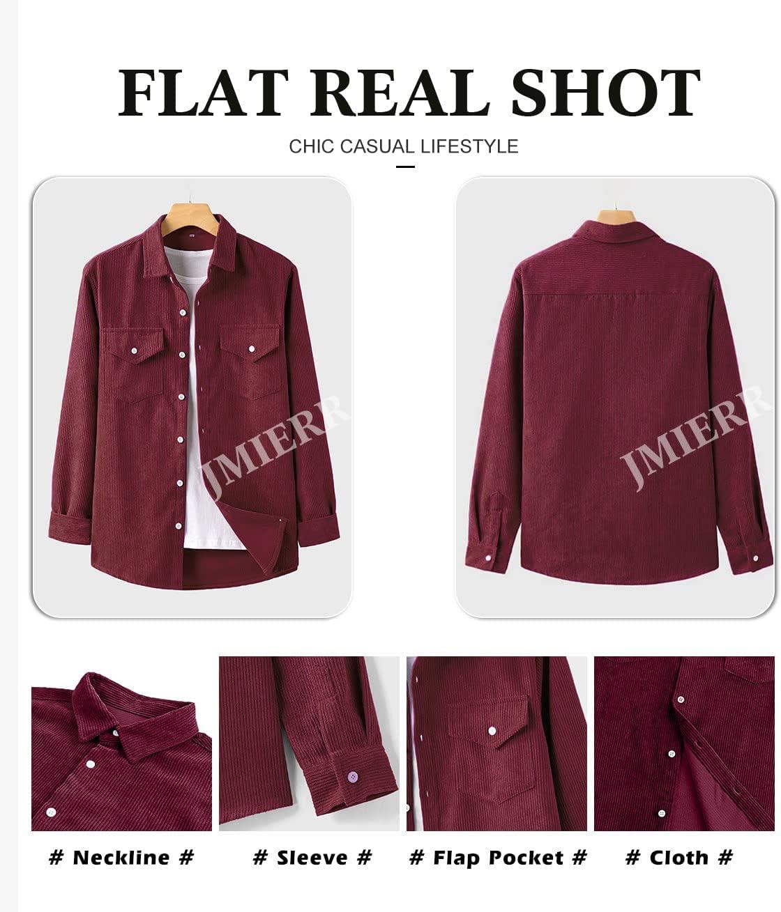 JMIERR Men’s Corduroy Button Down Shirts Casual Long Sleeve Shacket Jacket with Flap Pockets(D Red)