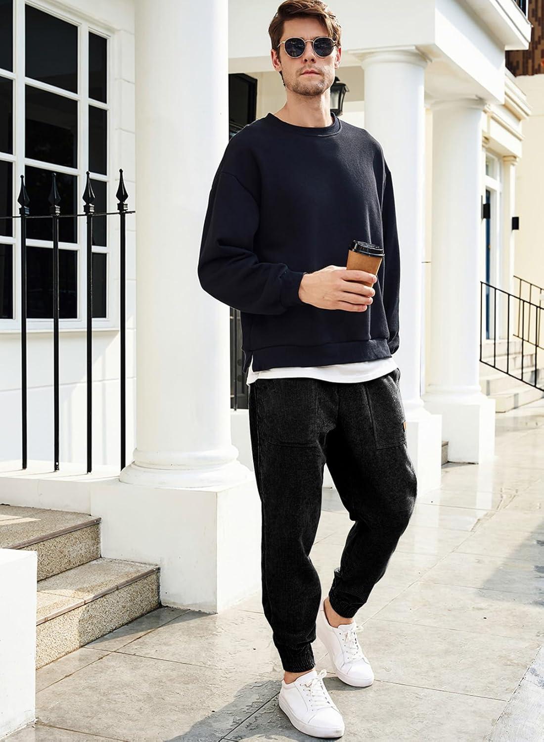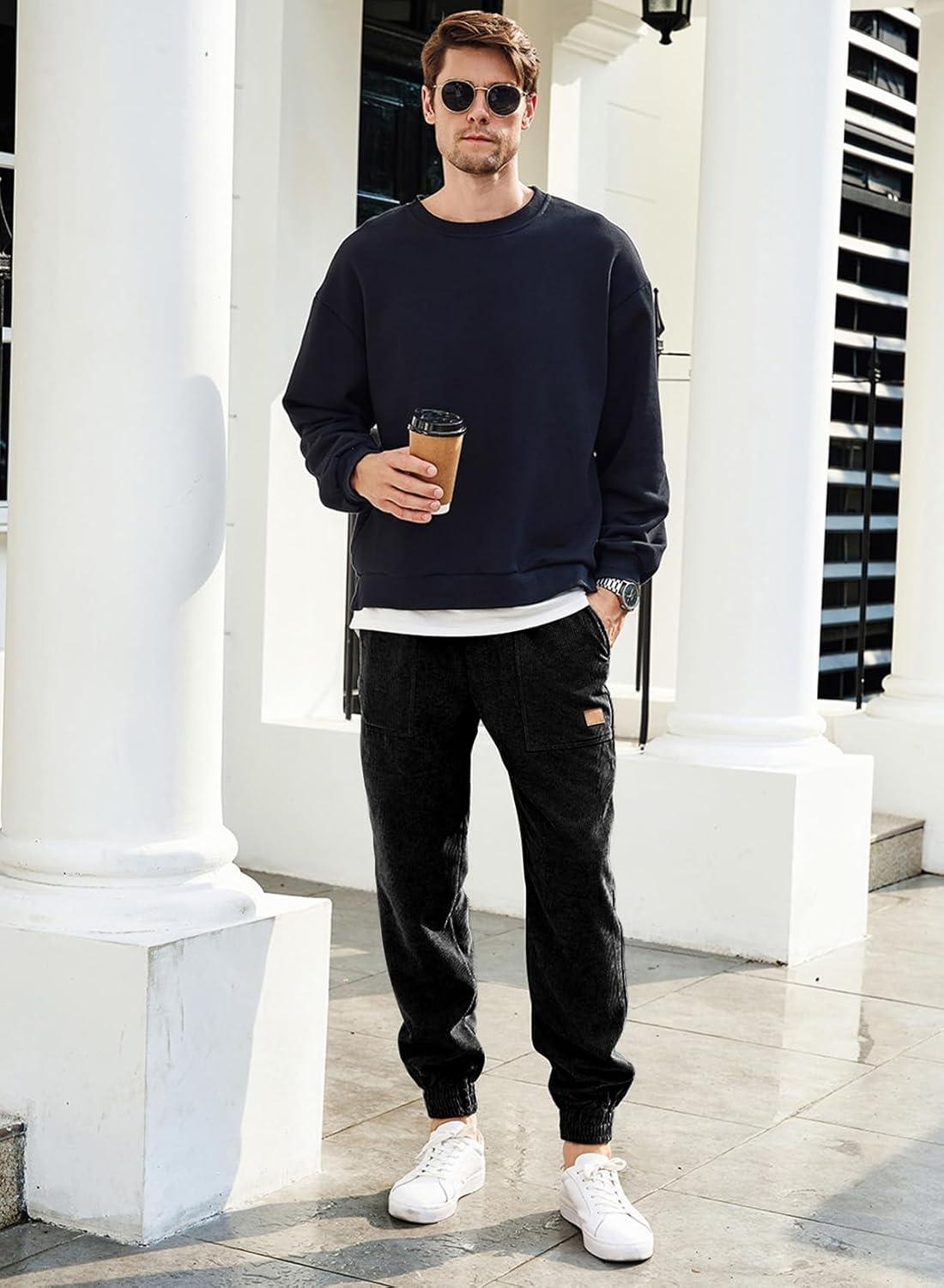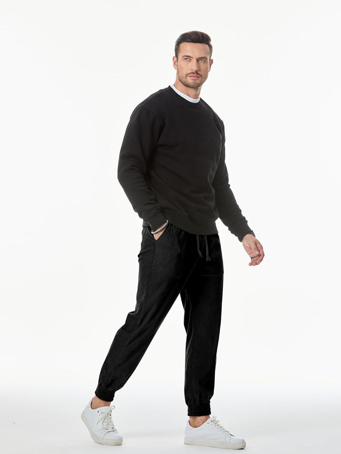 JMIERR Mens Corduroy Joggers Pants Casual Cargo Pants Drawstring Elastic Waist Baggy Tapered Sweatpants with Pockets(Black)
