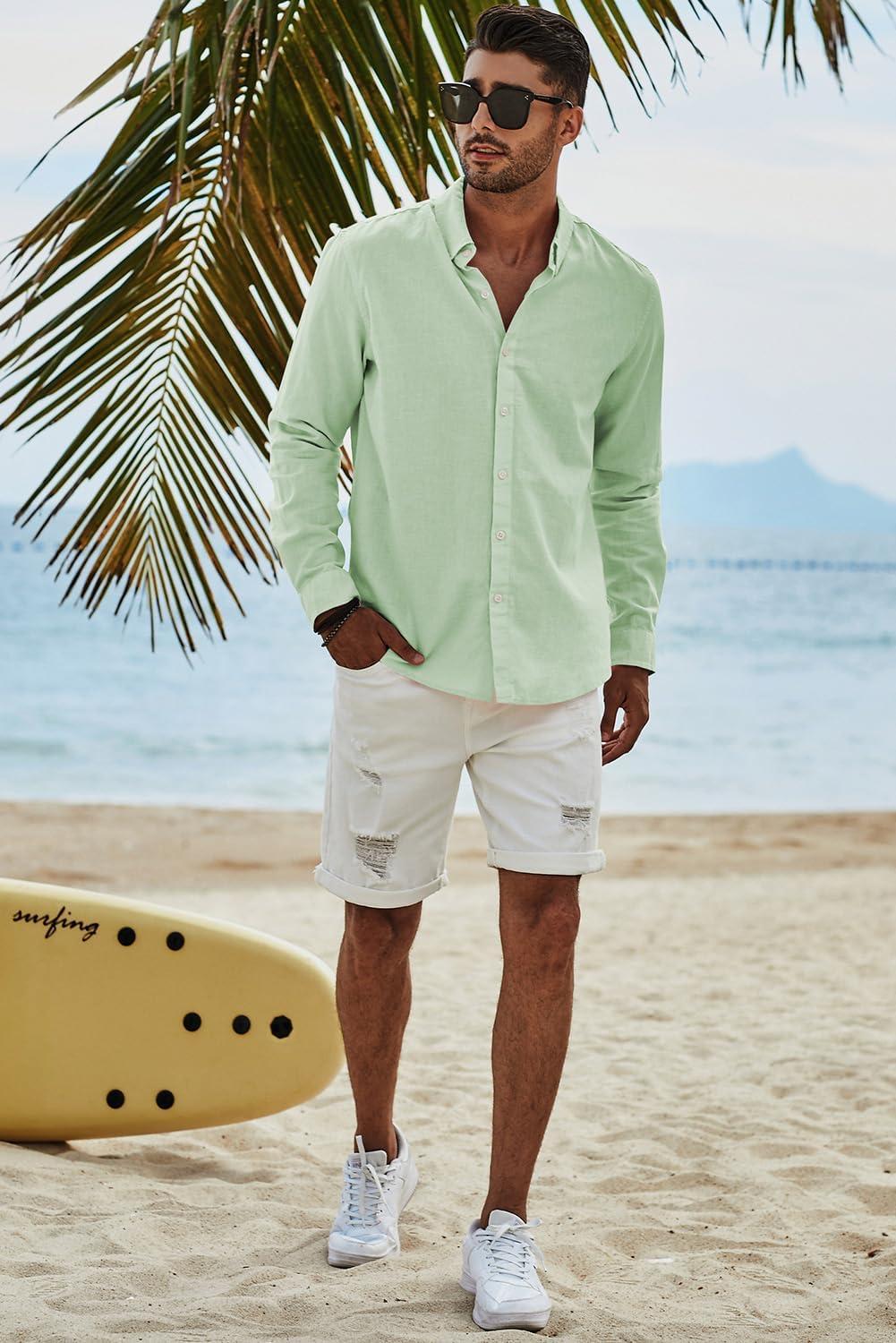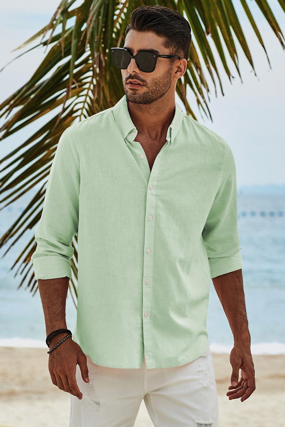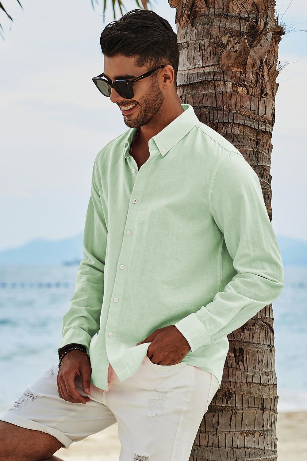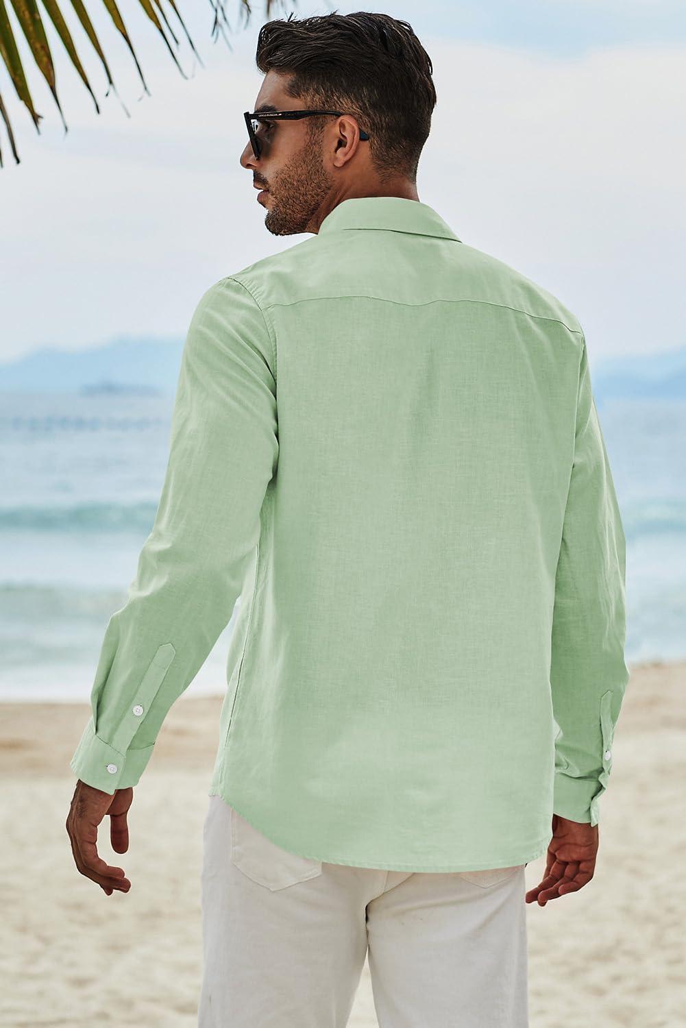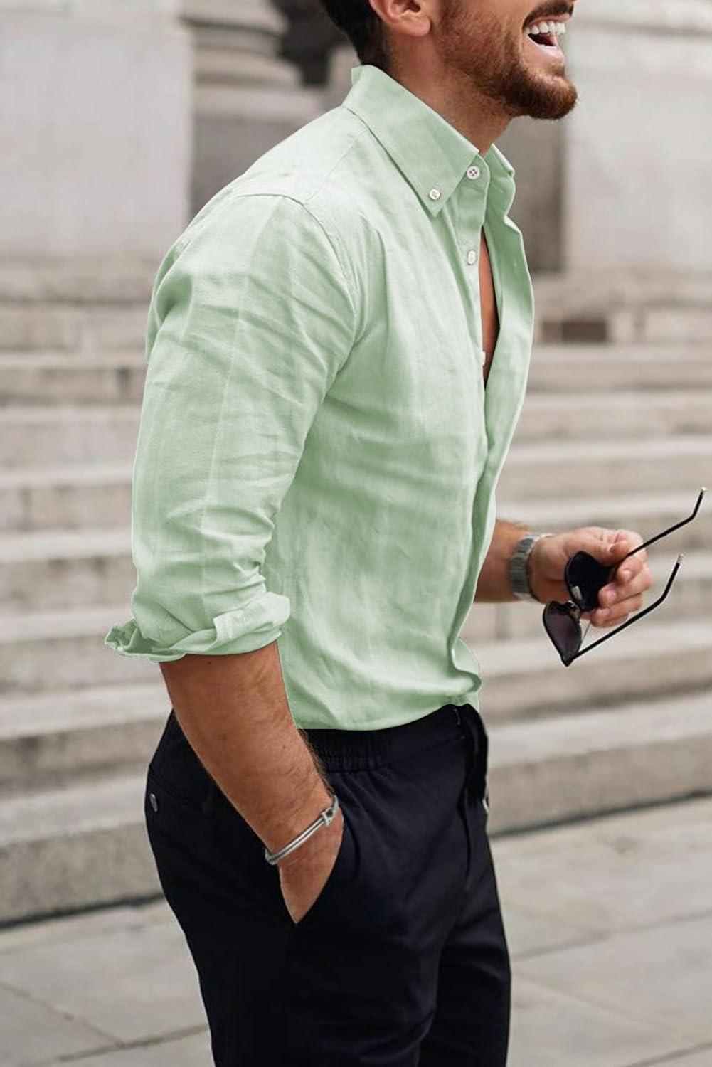 JMIERR Men’s Cotton Linen Button Down Shirt Casual Stylish Long Sleeve Business Dress Shirts(C Green7)