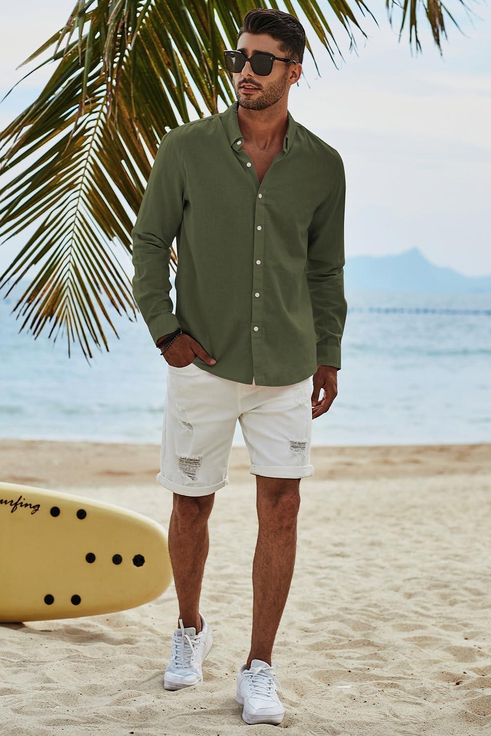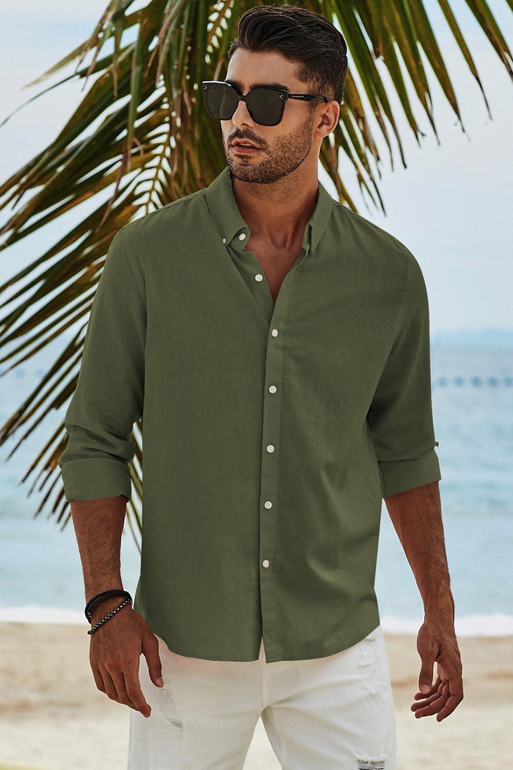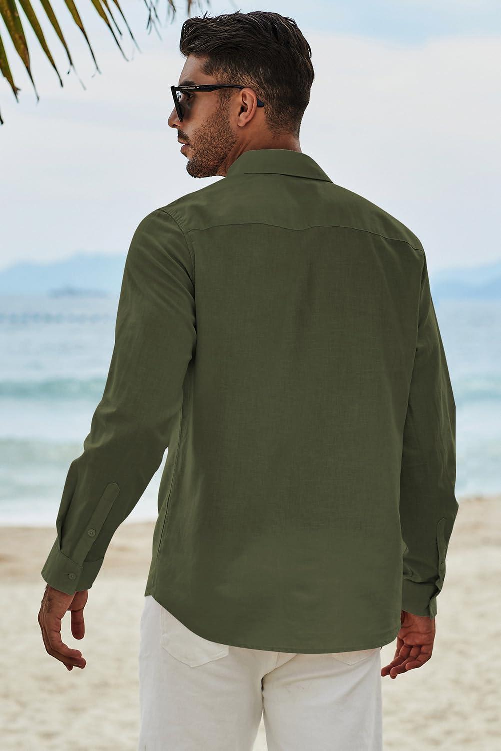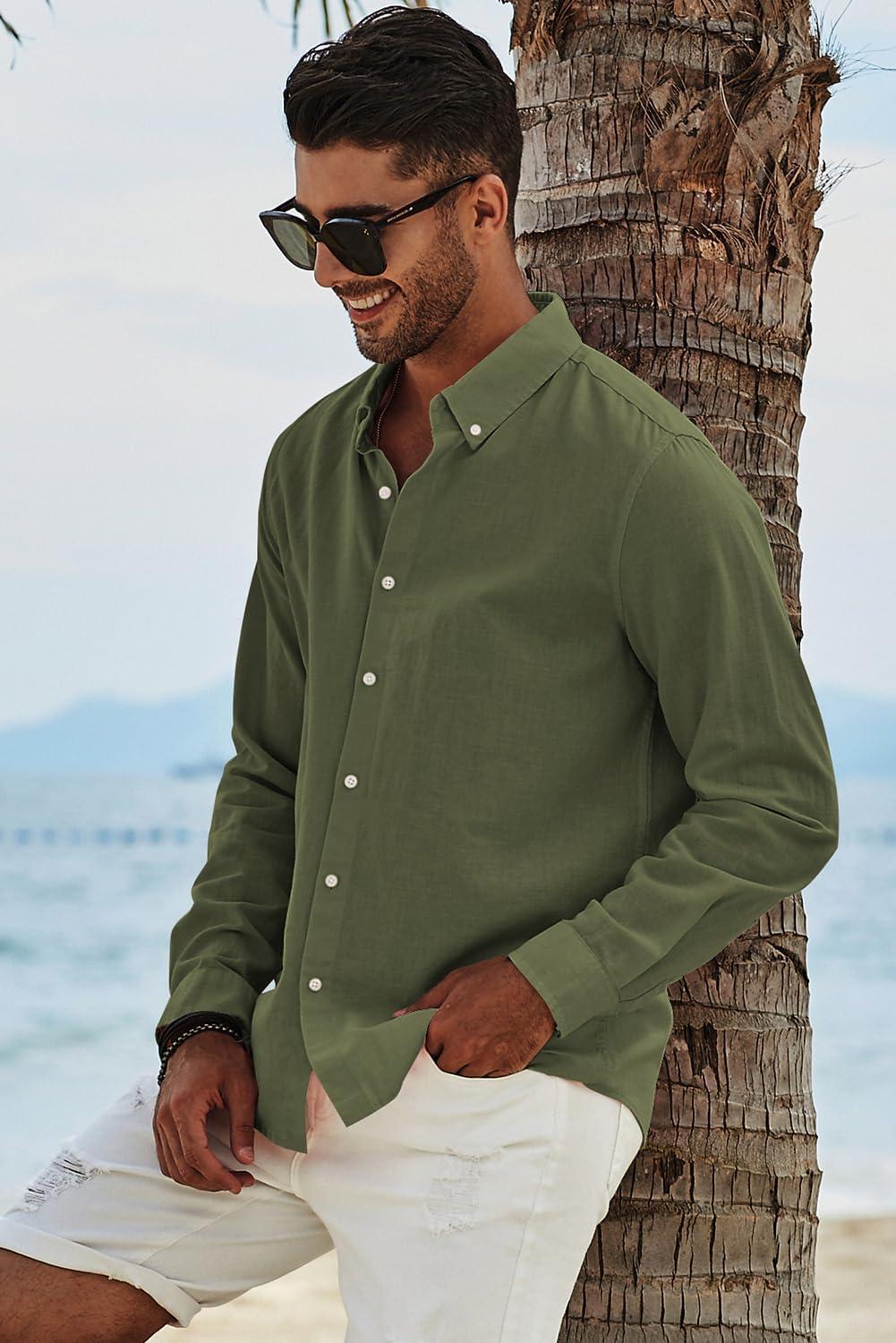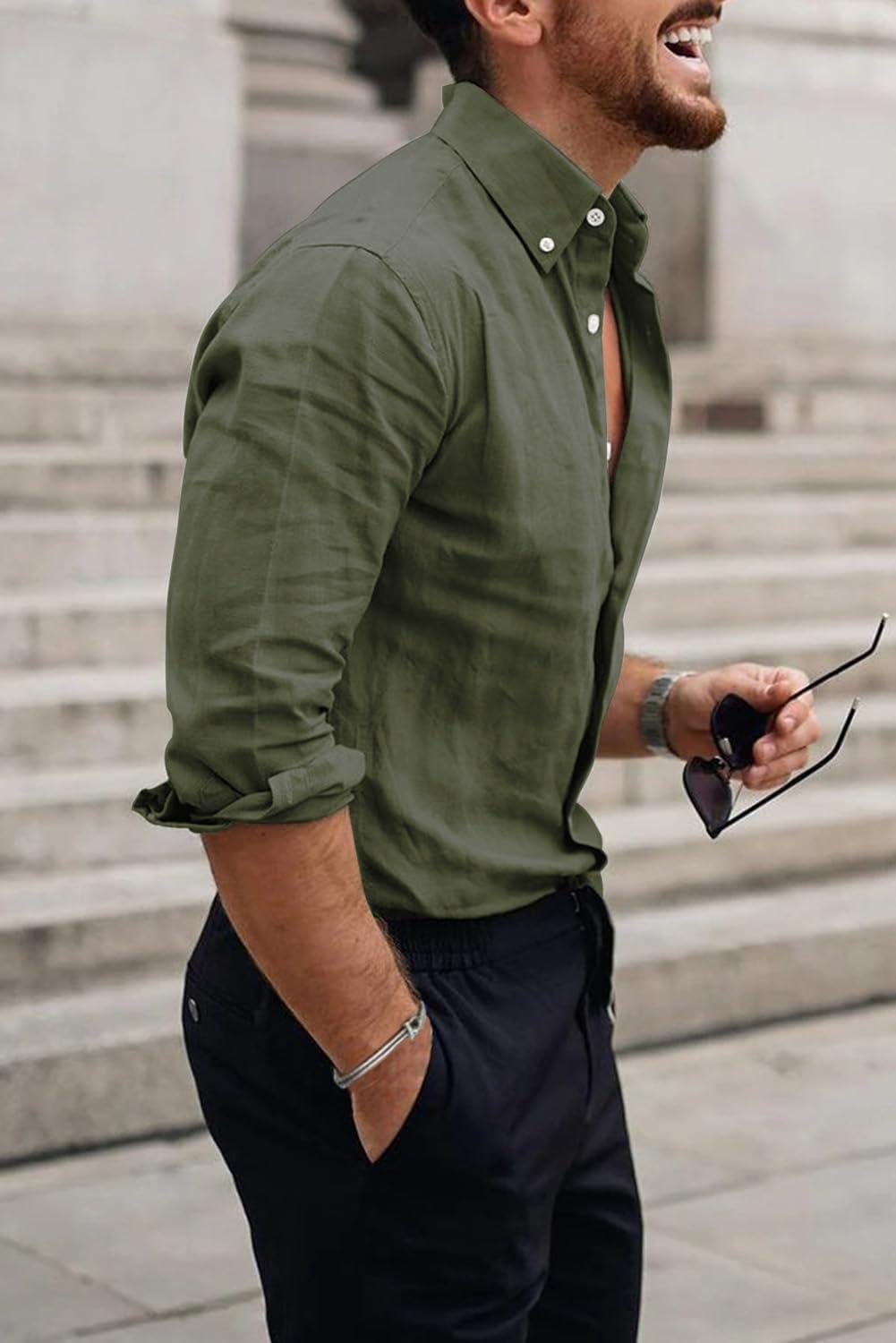 JMIERR Men’s Cotton Linen Button Down Shirt Casual Stylish Long Sleeve Business Dress Shirts(C Green8)