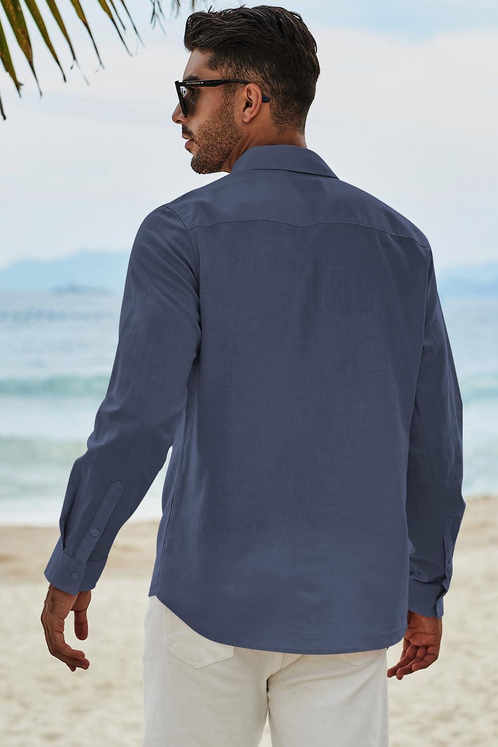 JMIERR Men’s Cotton Linen Button Down Shirt Casual Stylish Long Sleeve Business Dress Shirts(E Blue2)