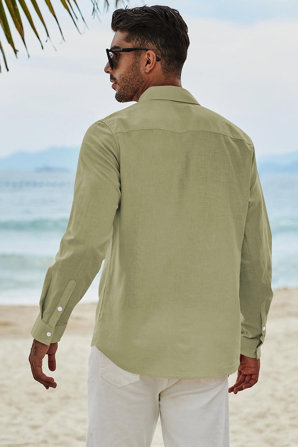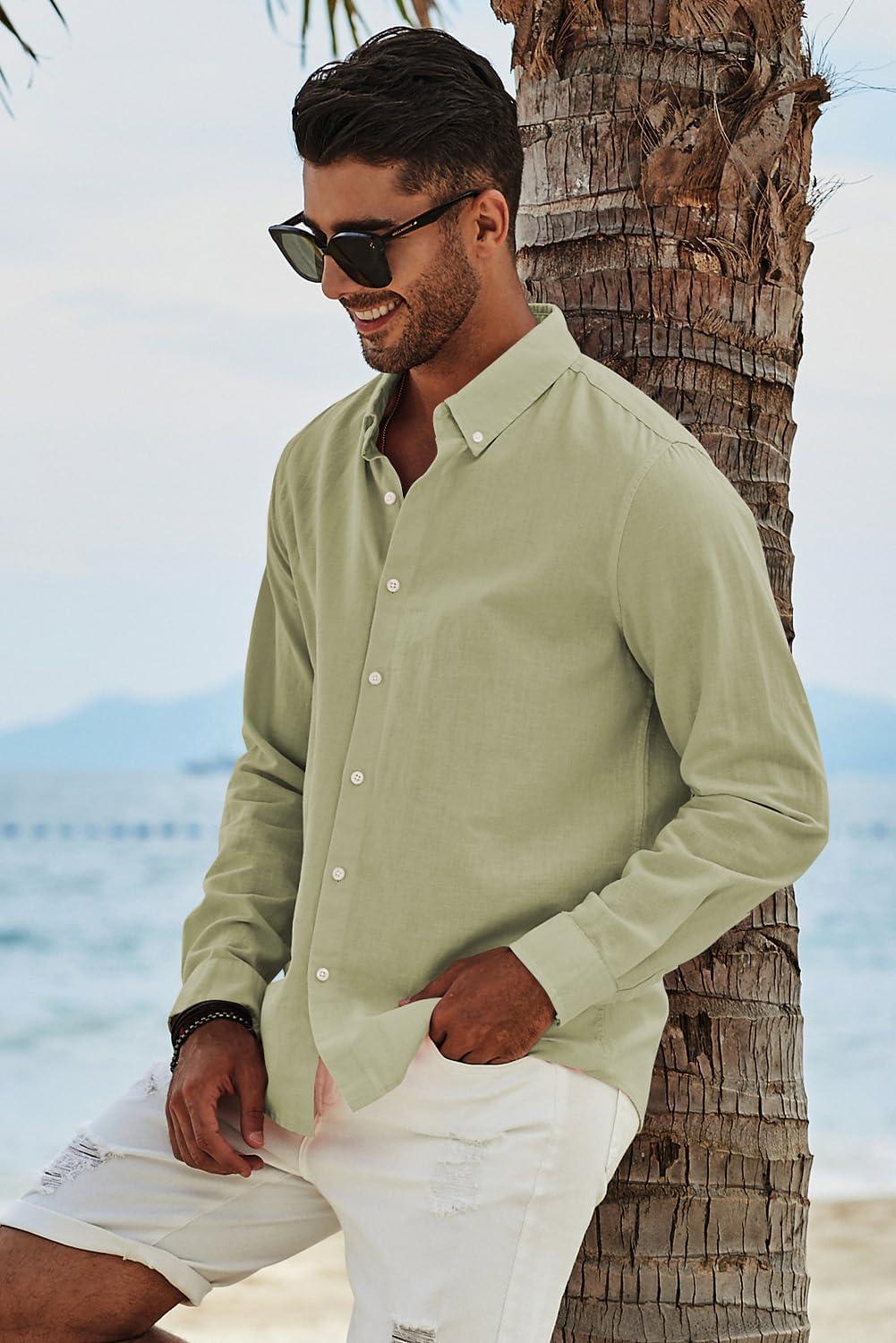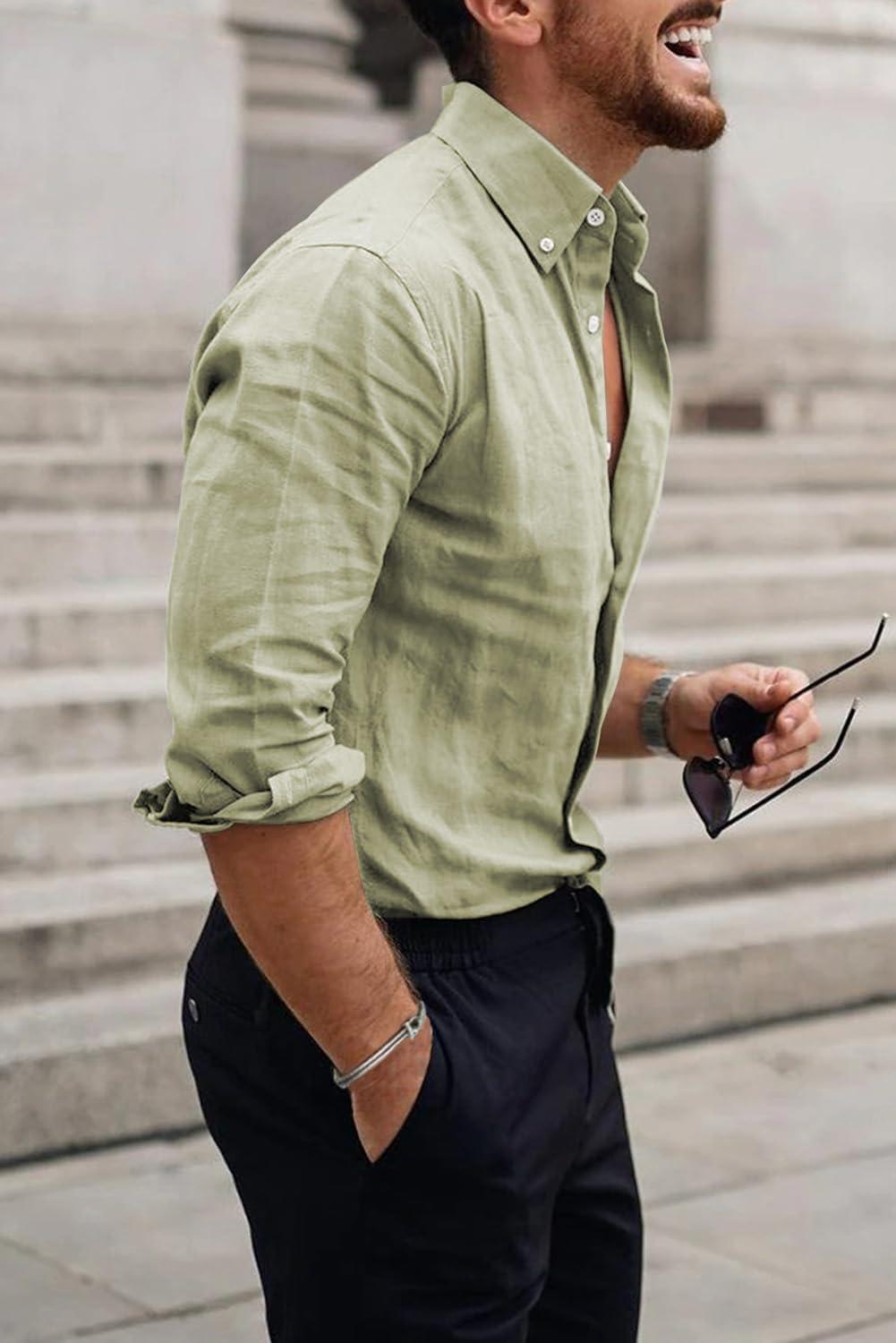 JMIERR Mens Cotton Linen Casual Stylish Button Down Shirt Long Sleeve Dress Shirts(C Green4)