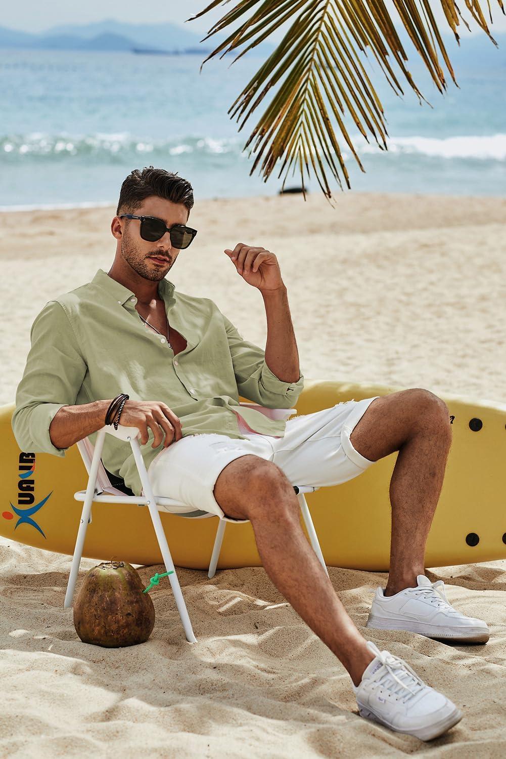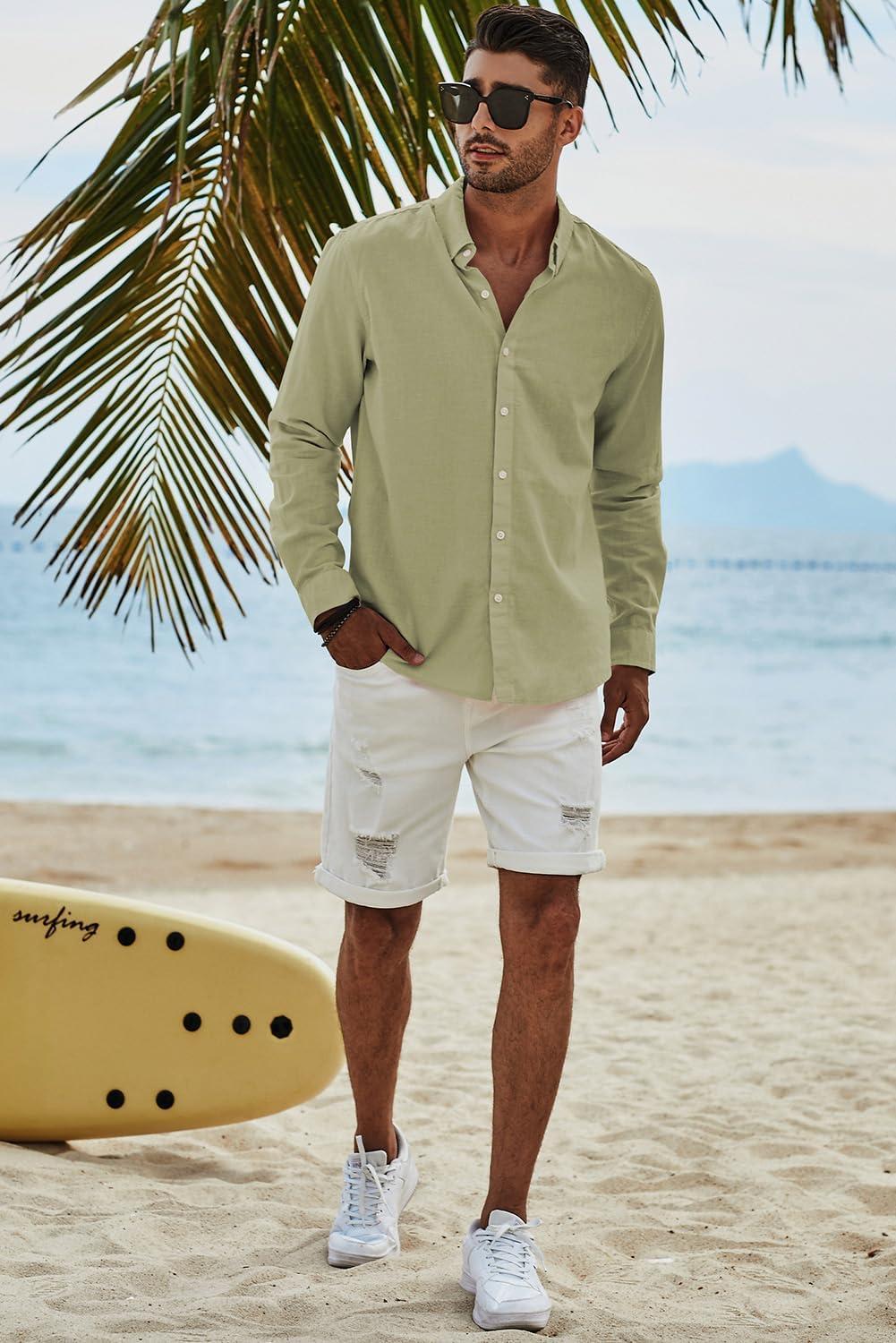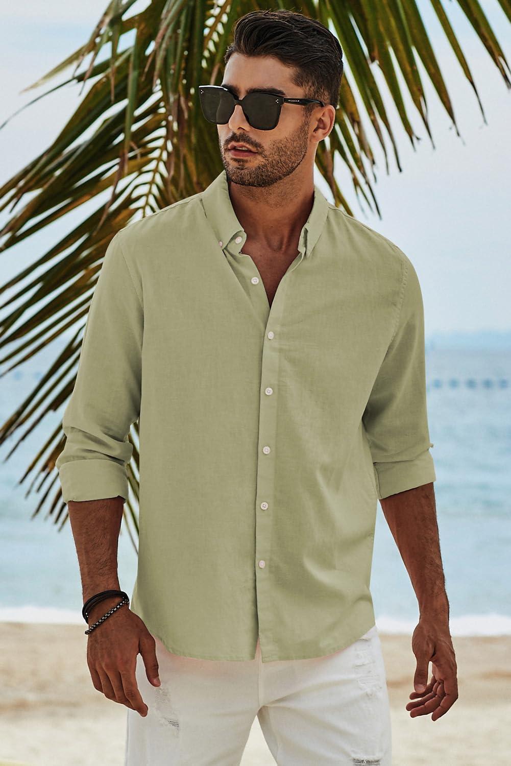 JMIERR Mens Cotton Linen Casual Stylish Button Down Shirt Long Sleeve Dress Shirts(C Green4)