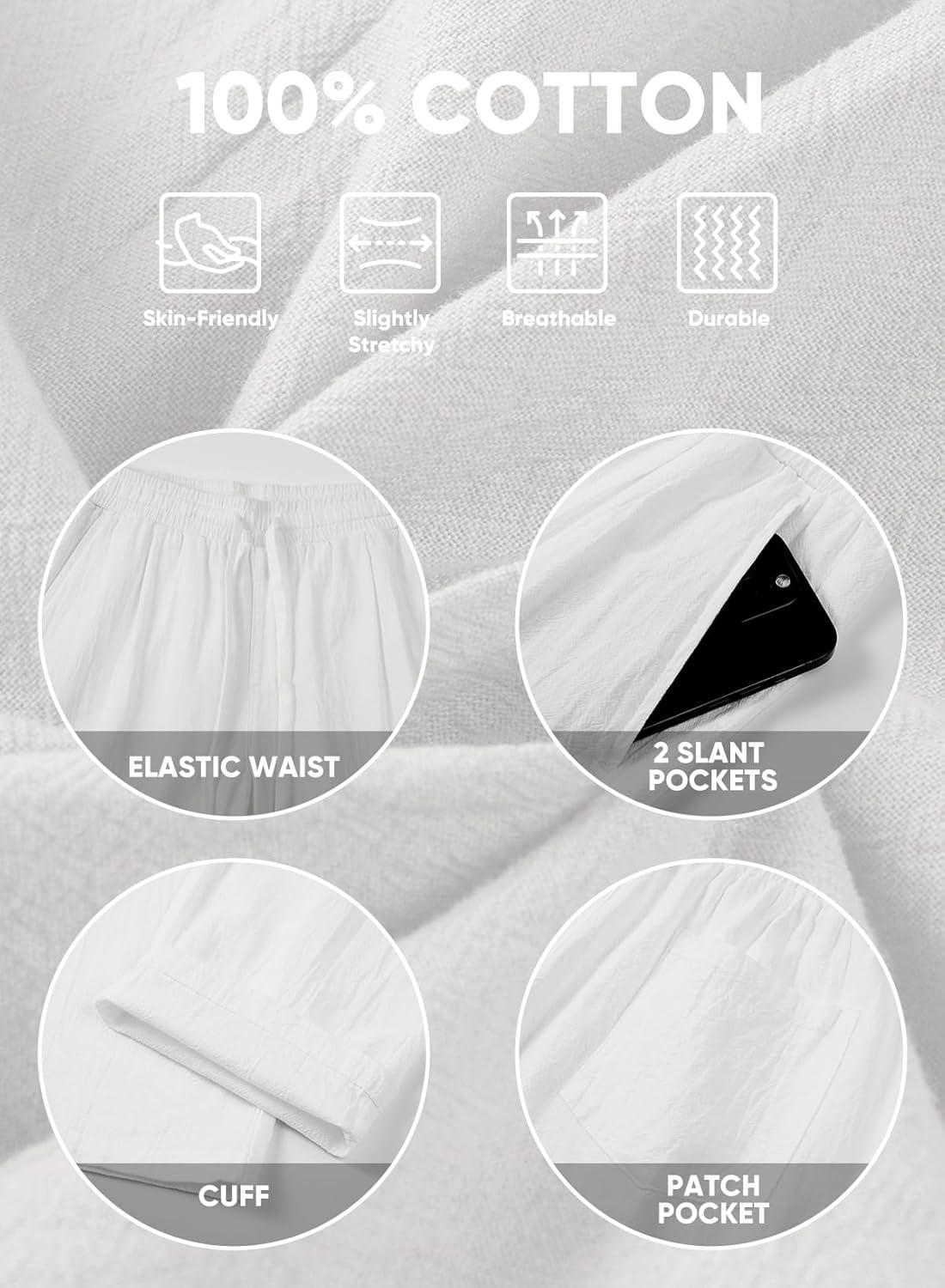 JMIERR Mens Cotton Pants Casual Elastic Waist Drawstring Lightweight Summer Beach Trousers with Pockets(1 White)