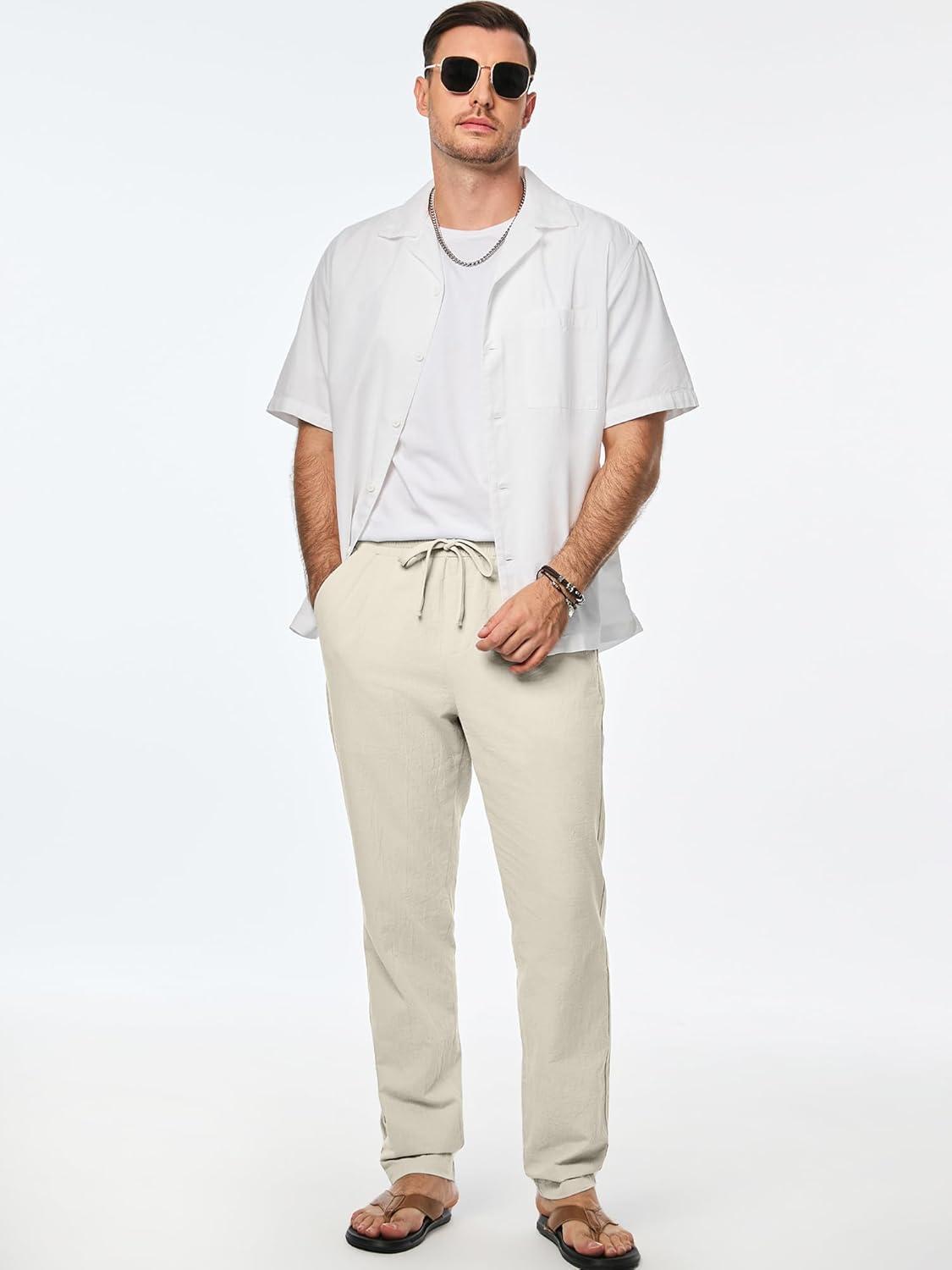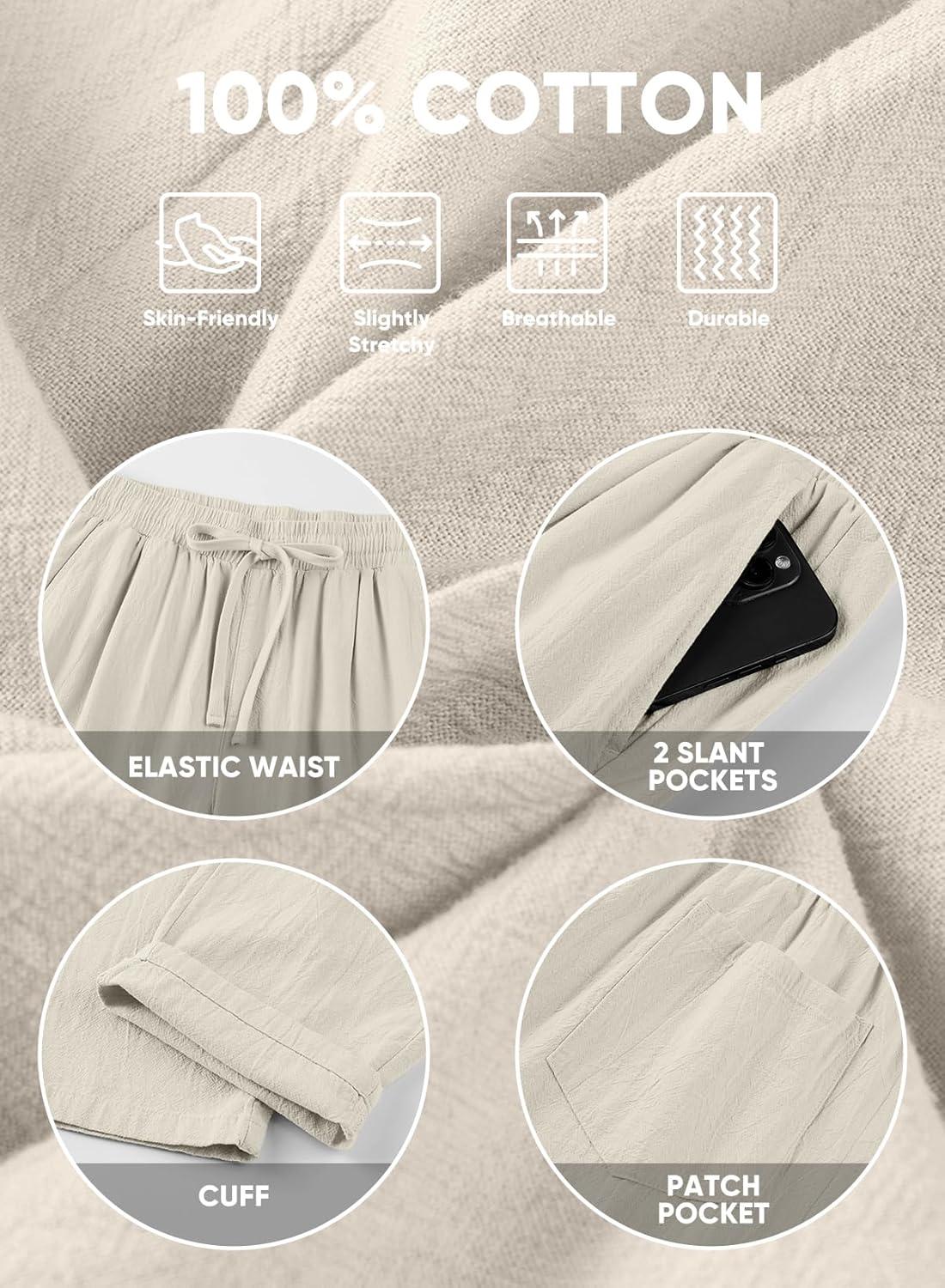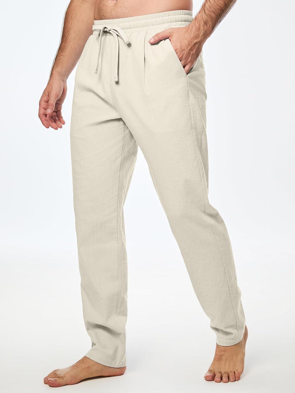 JMIERR Mens Cotton Pants Casual Elastic Waist Drawstring Lightweight Summer Beach Trousers with Pockets(2 Beige)