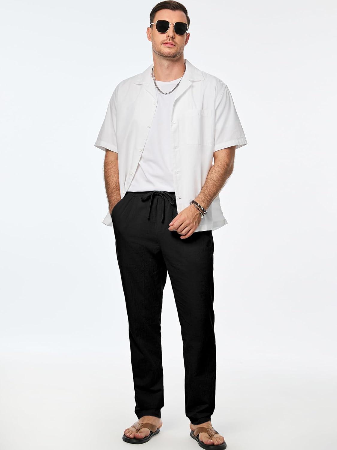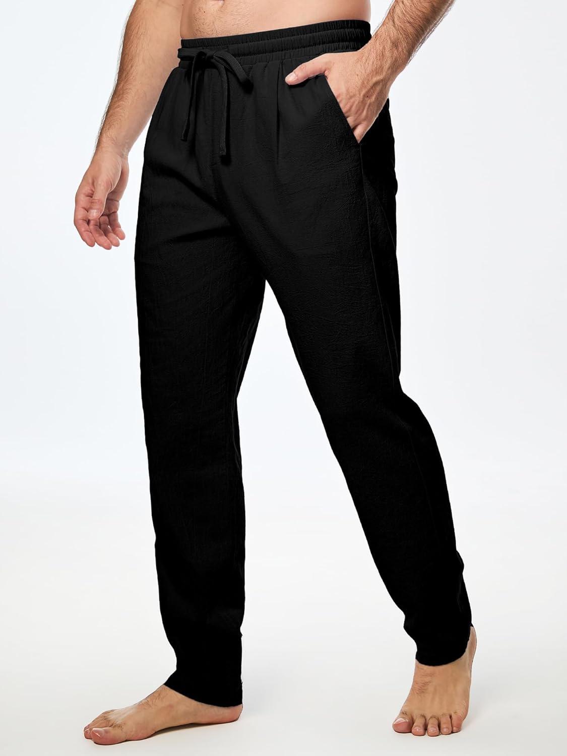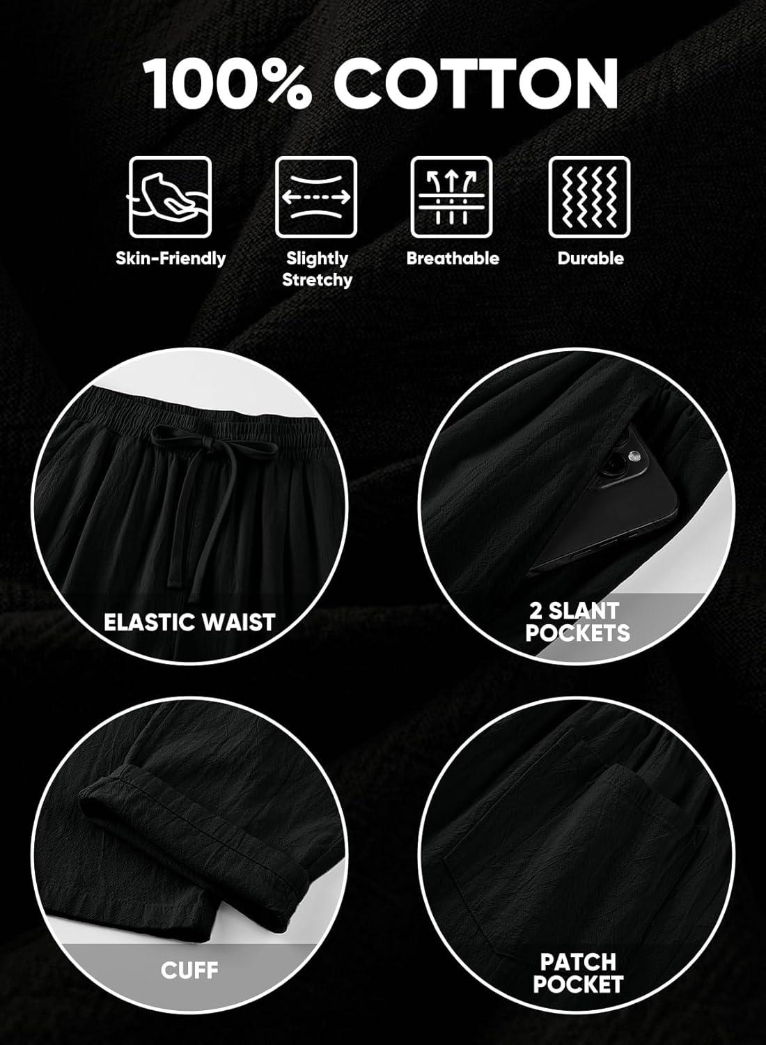 JMIERR Mens Cotton Pants Casual Elastic Waist Drawstring Lightweight Summer Beach Trousers with Pockets(3 Black)
