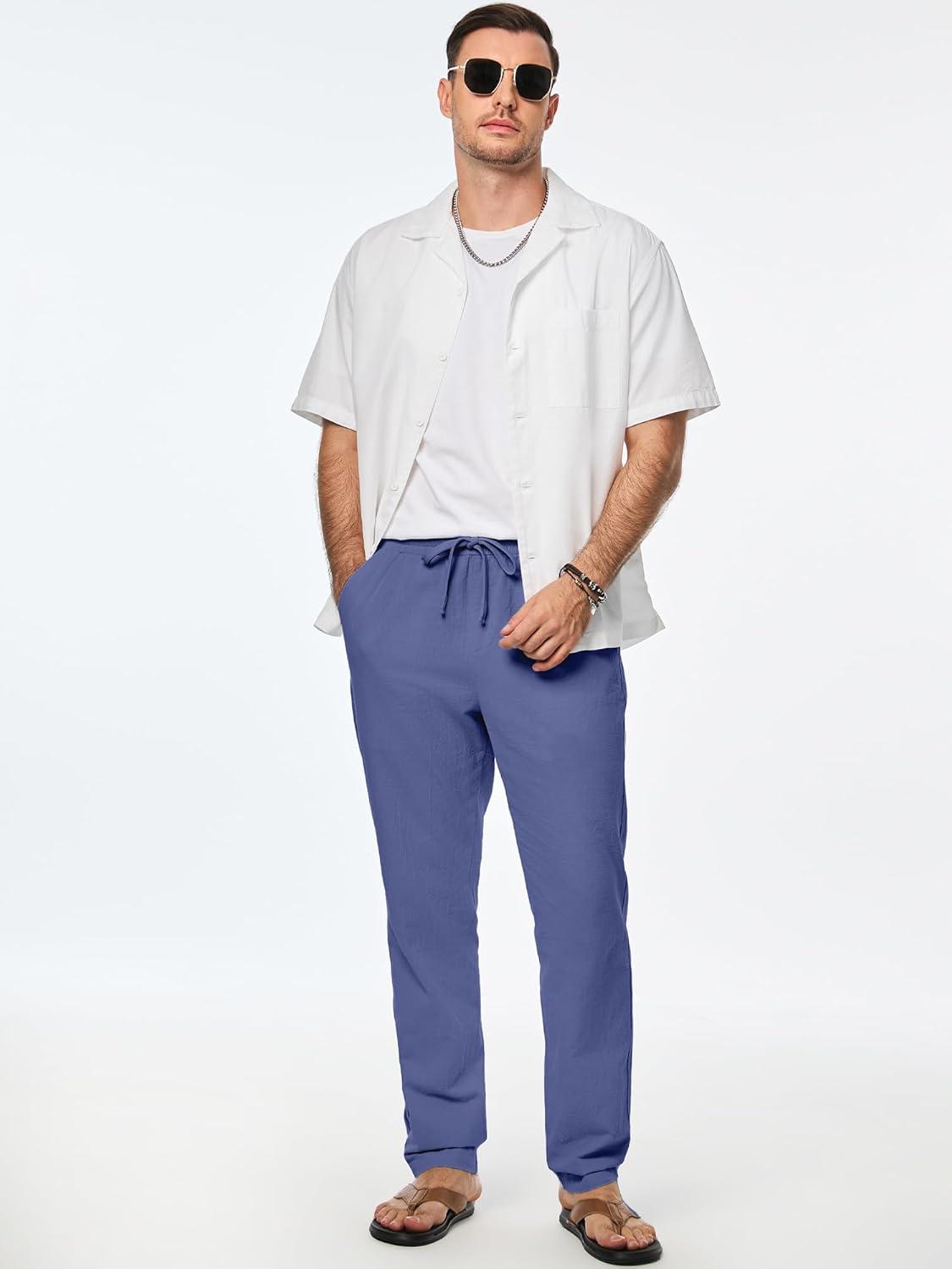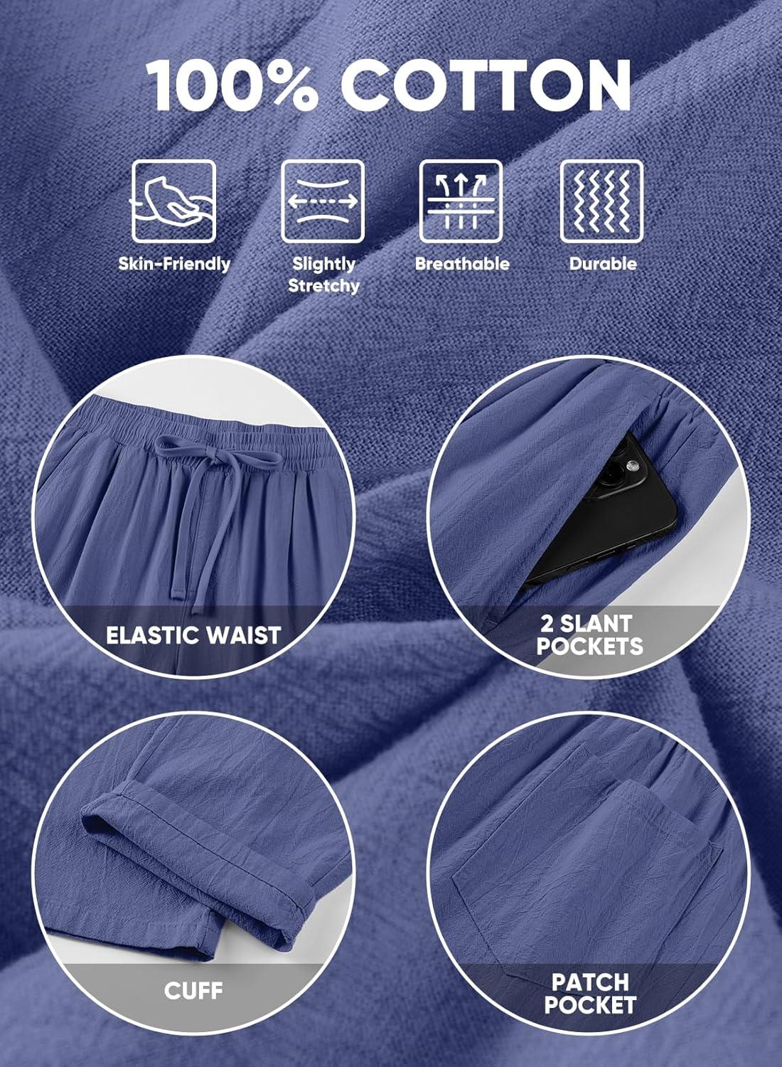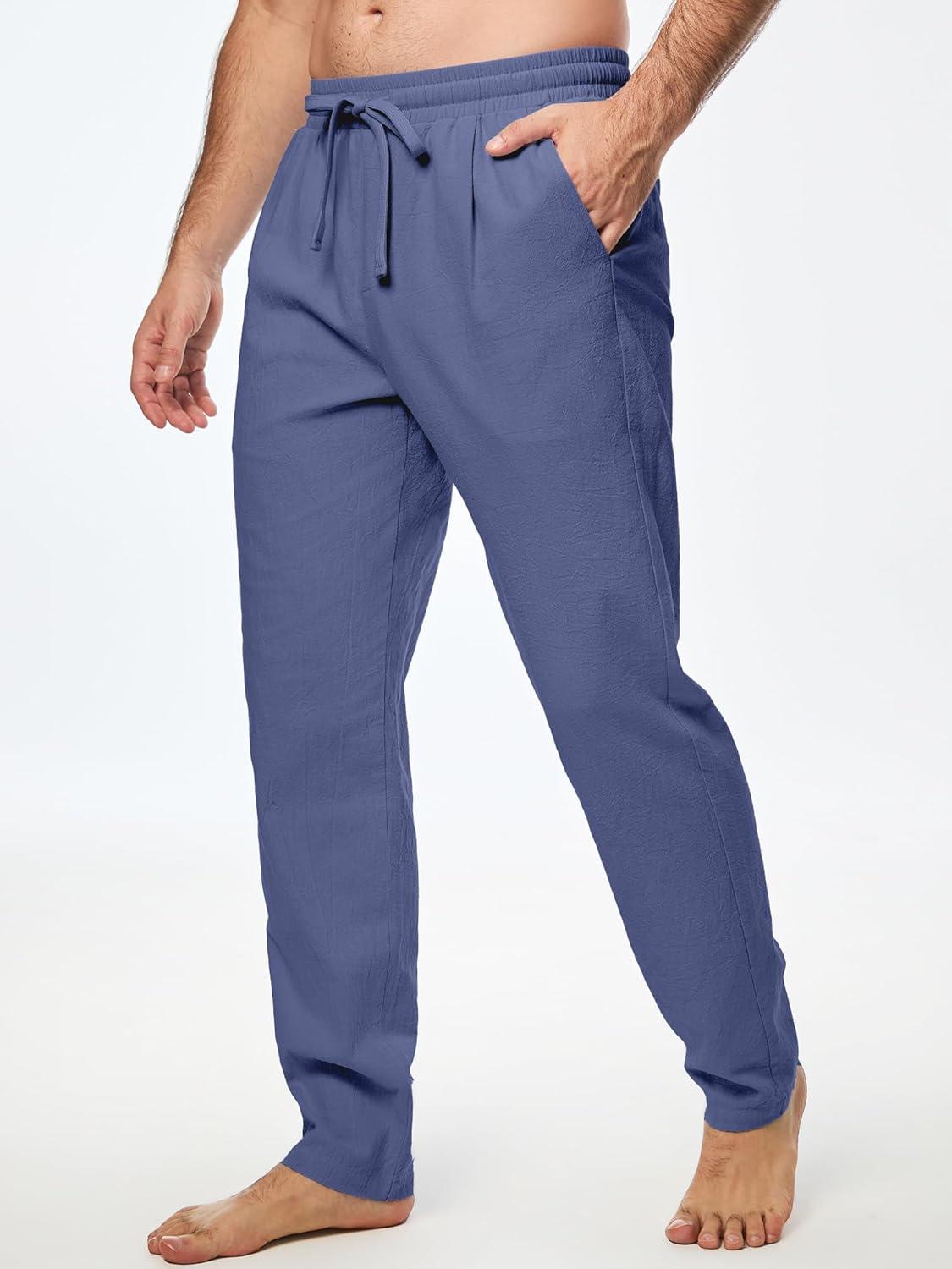 JMIERR Mens Cotton Pants Casual Elastic Waist Drawstring Lightweight Summer Beach Trousers with Pockets(Dark Blue)