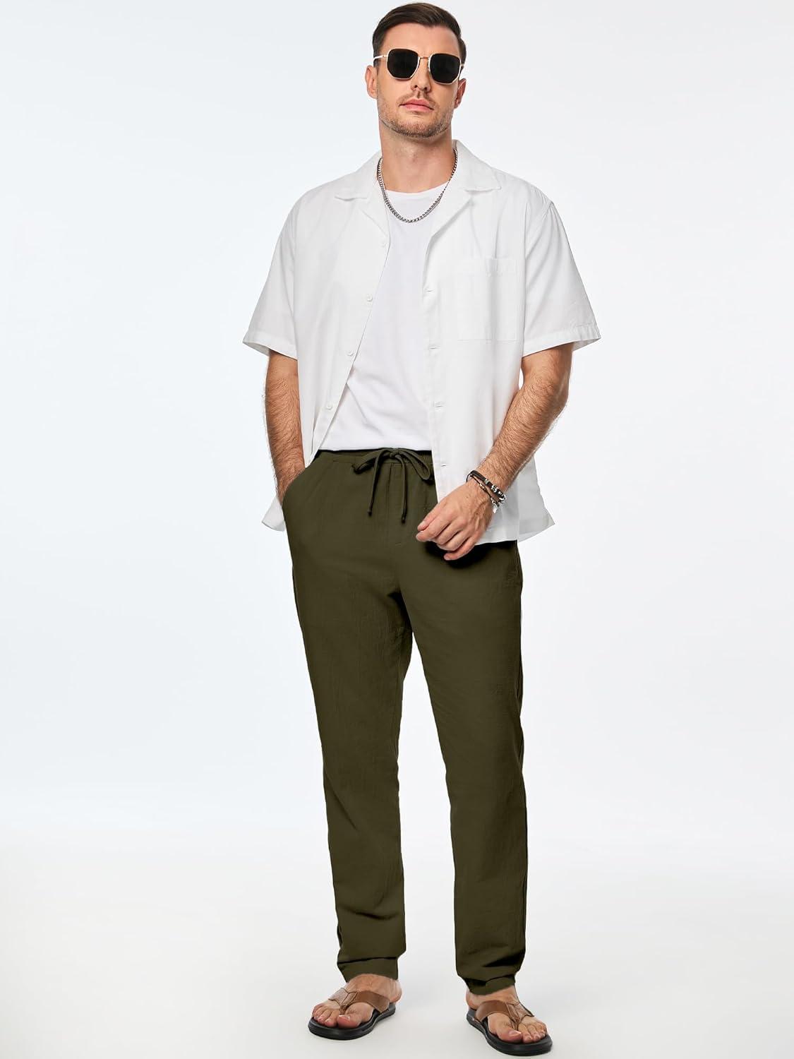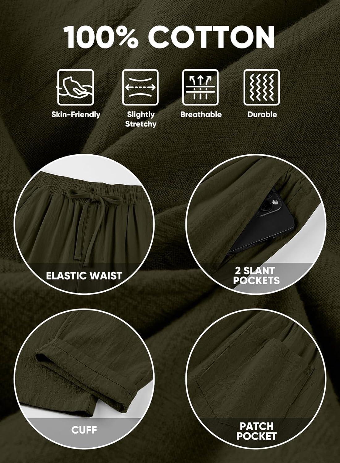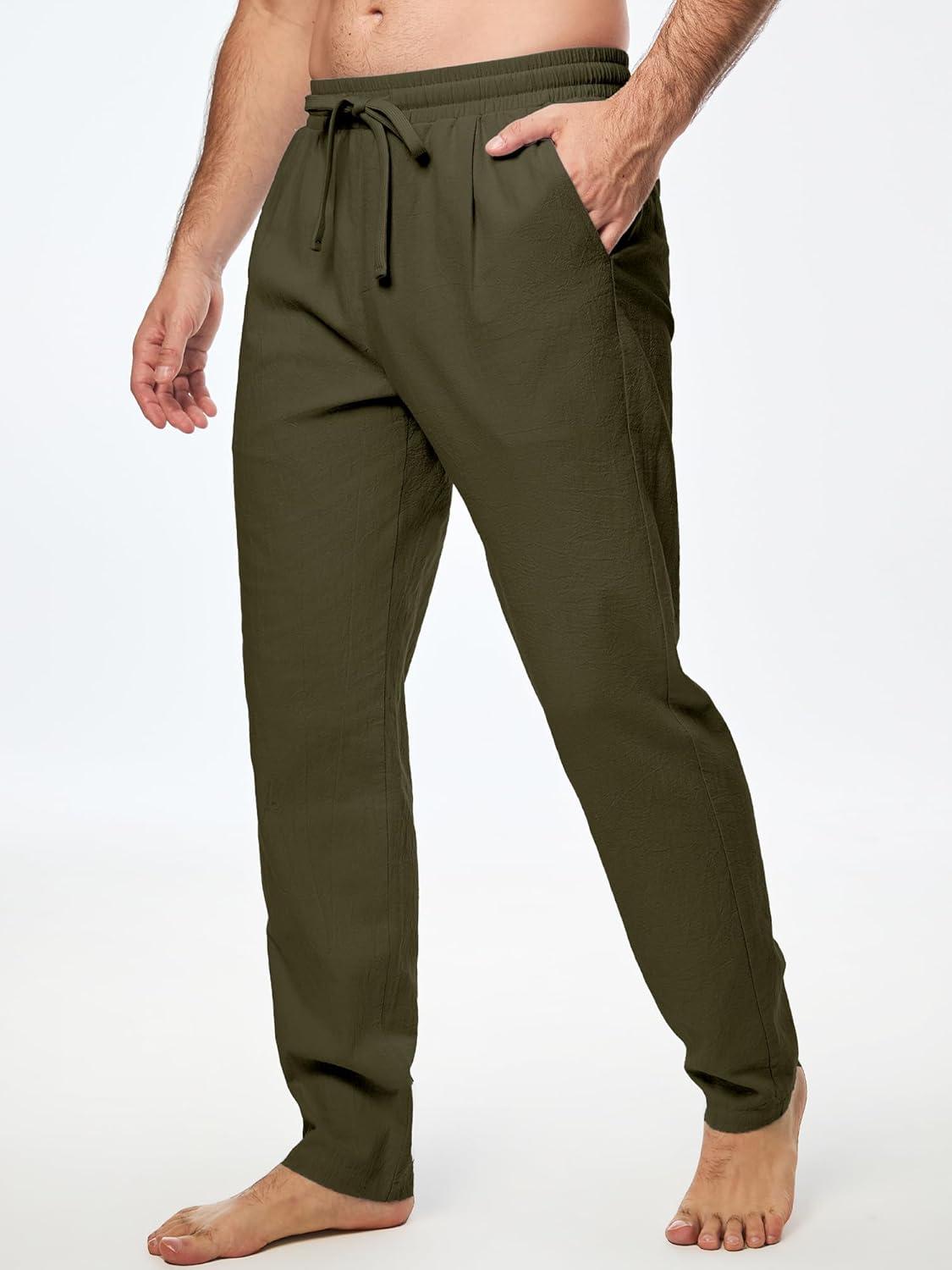 JMIERR Mens Cotton Pants Casual Elastic Waist Drawstring Lightweight Summer Beach Trousers with Pockets(Dark Green)