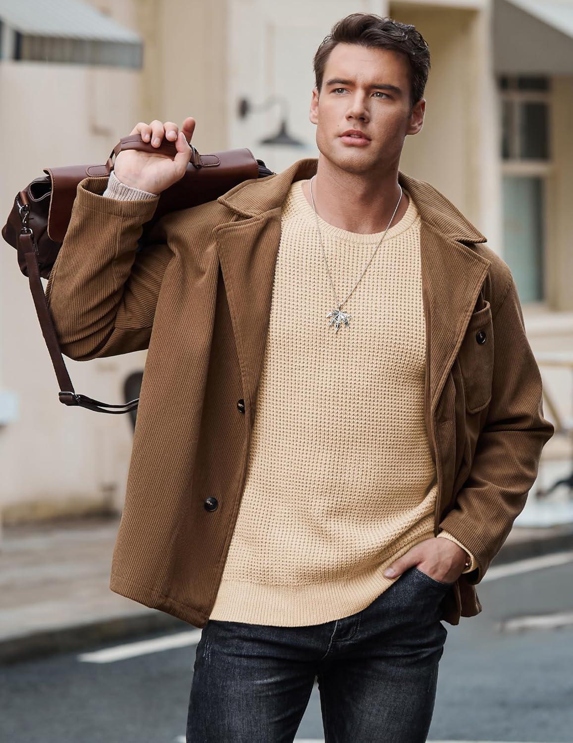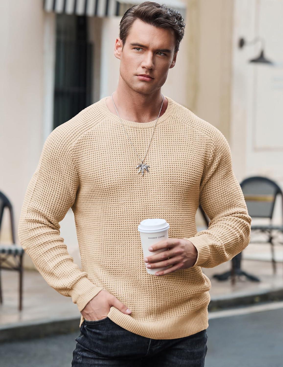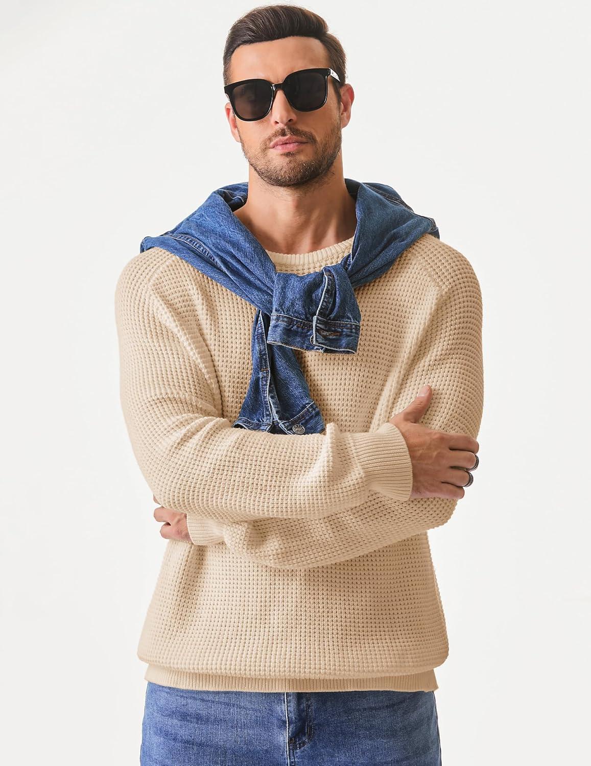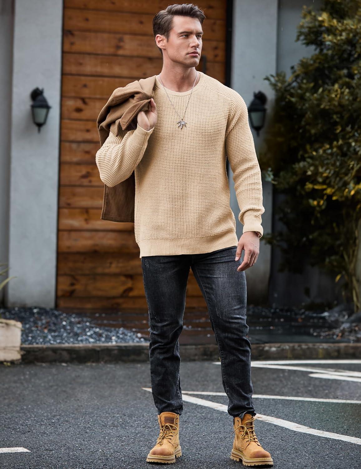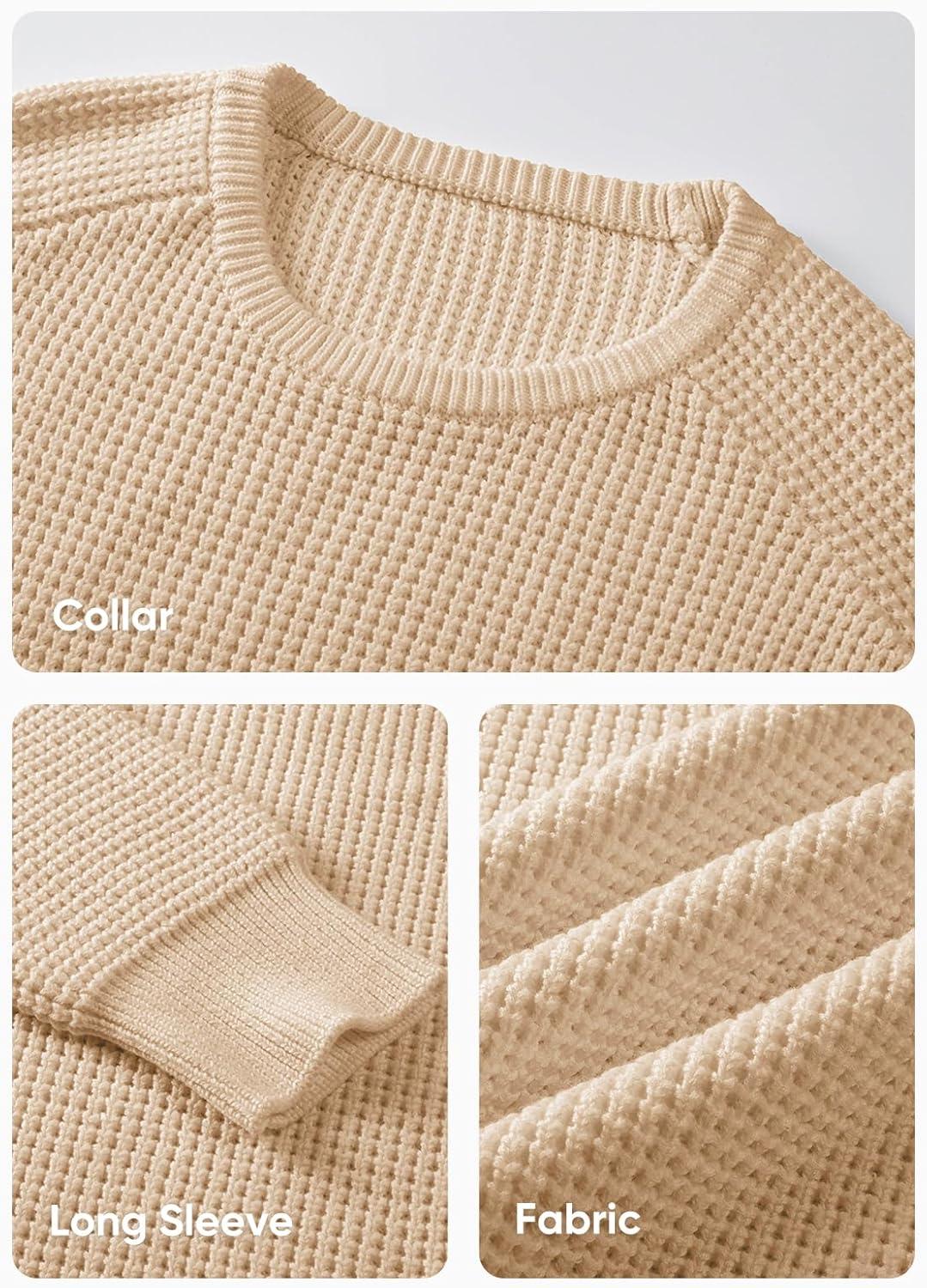 JMIERR Men’s Crewneck Pullover Sweater Waffle Textured Knitted Sweaters Casual Loose Fit Sweaters with Ribbing Edge(Cream)