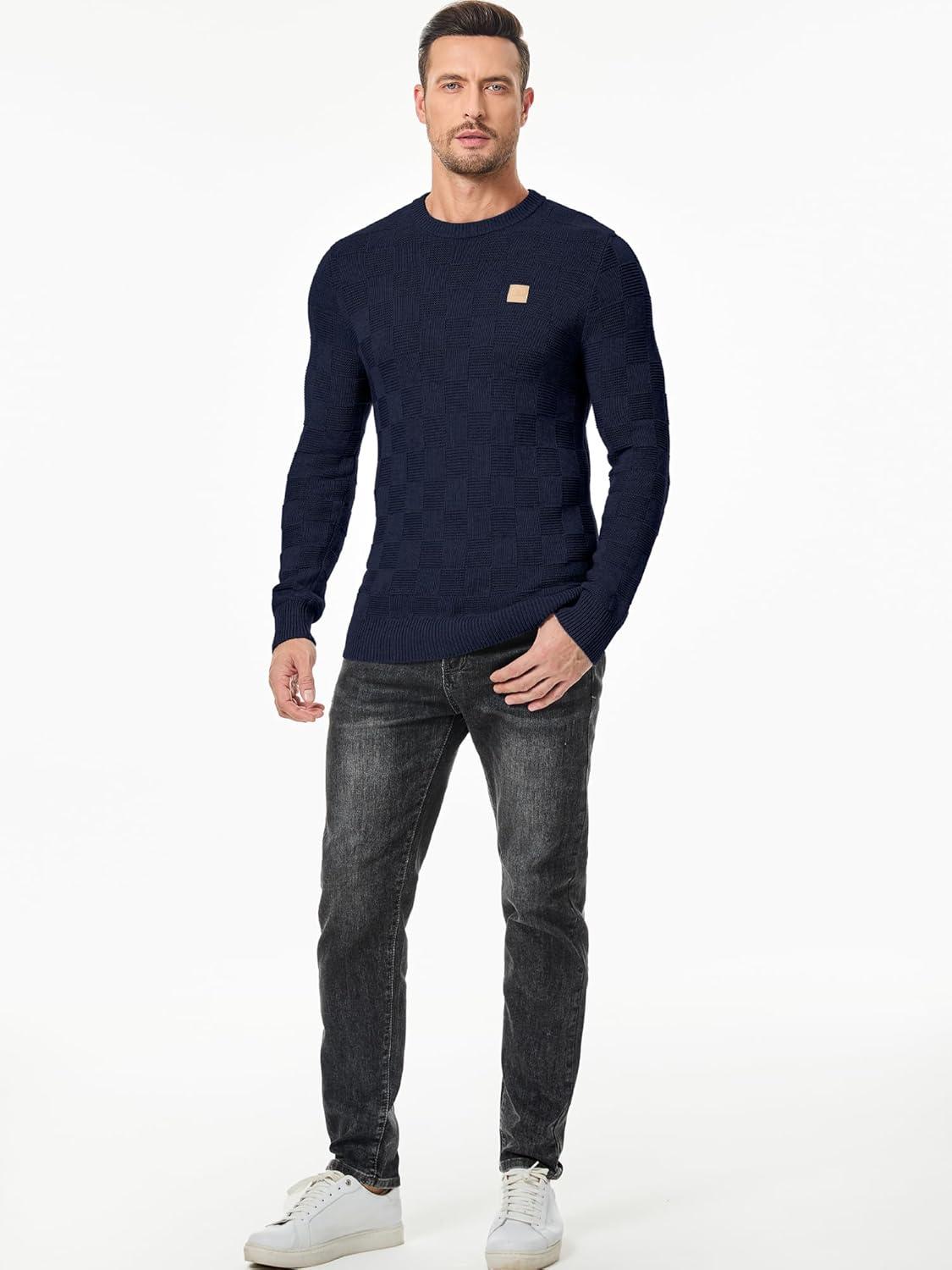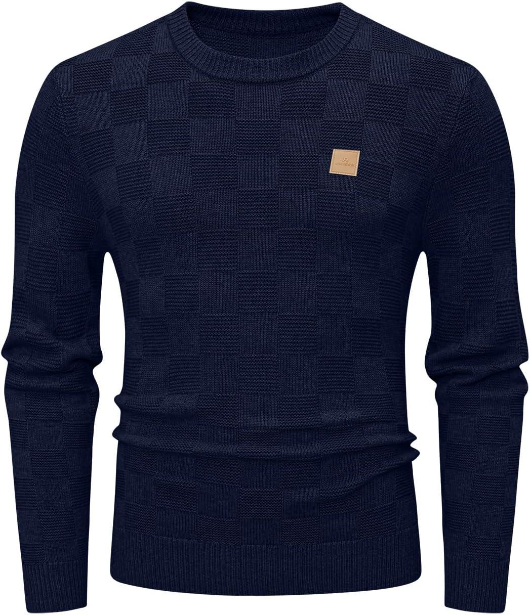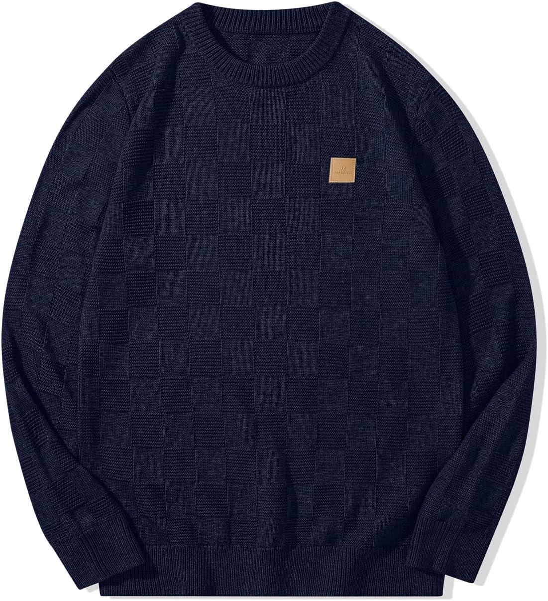 JMIERR Men’s Crewneck Sweater Casual Fall Checkered Long Sleeve Knit Pullover Sweaters(Navy Blue)