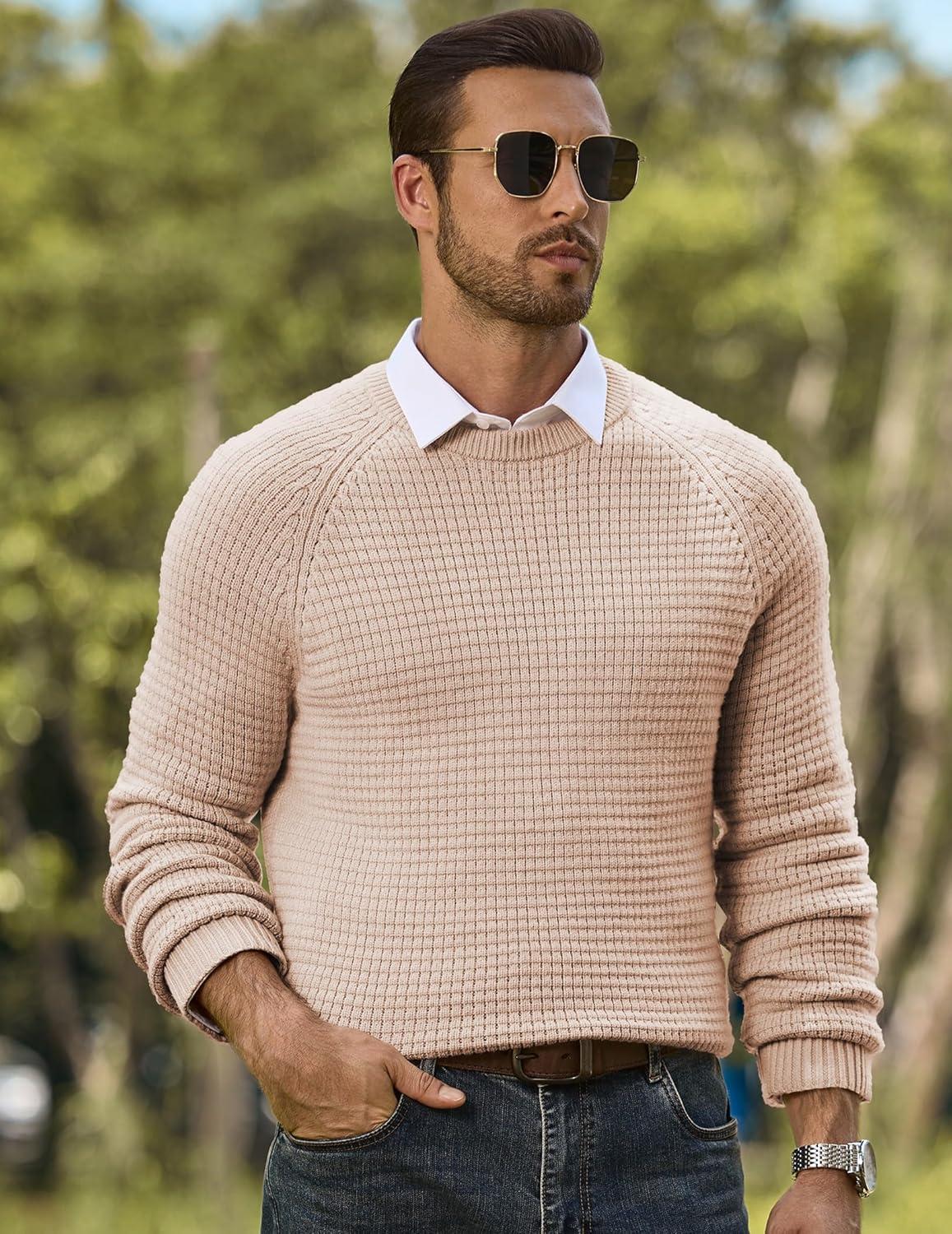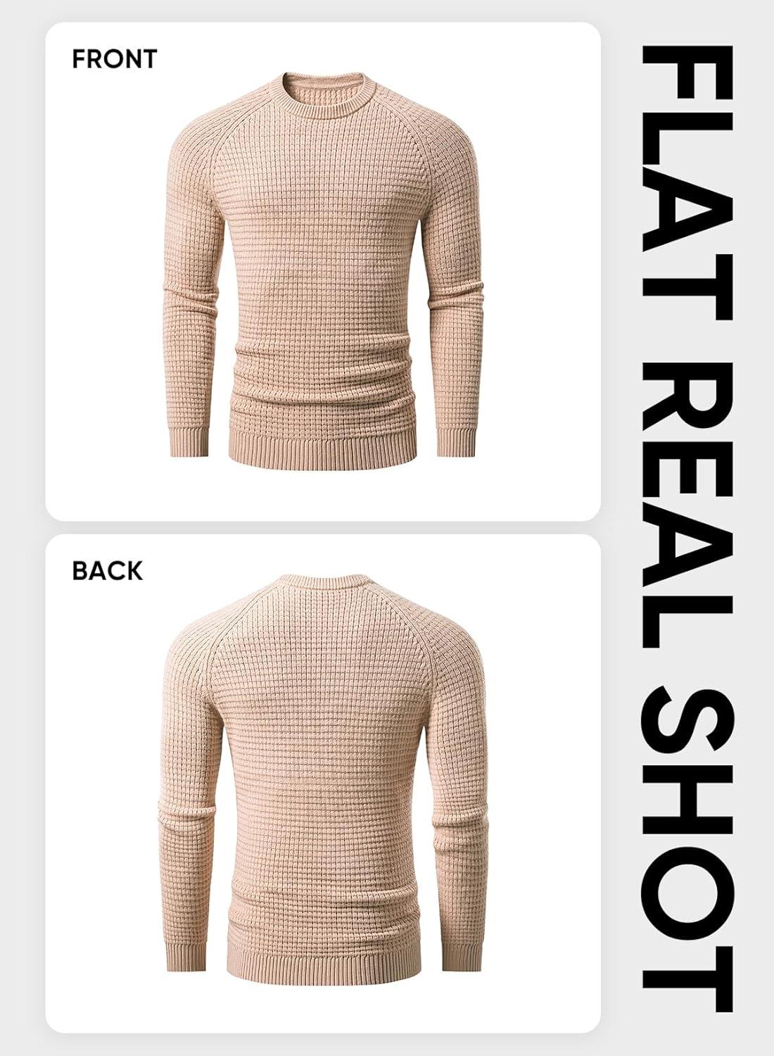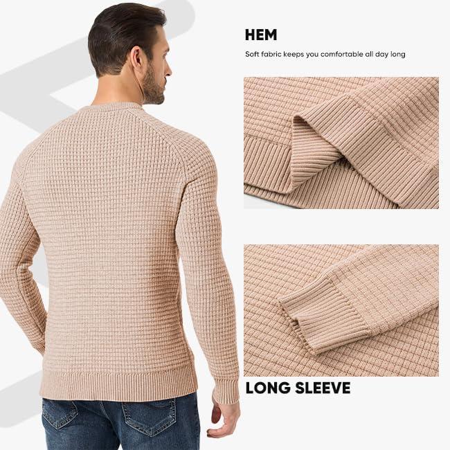 JMIERR Mens Crewneck Sweater Waffle Textured Knitted Solid Pullover Casual Daily Wear Soft 2025 Fashion Pullovers(Light French Beige)