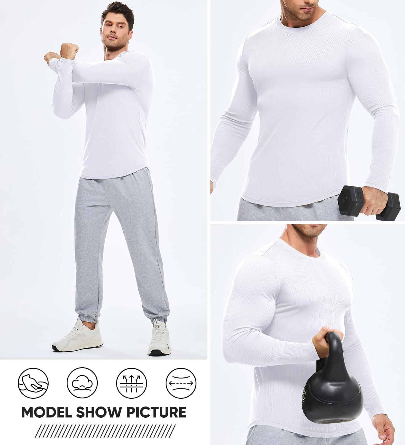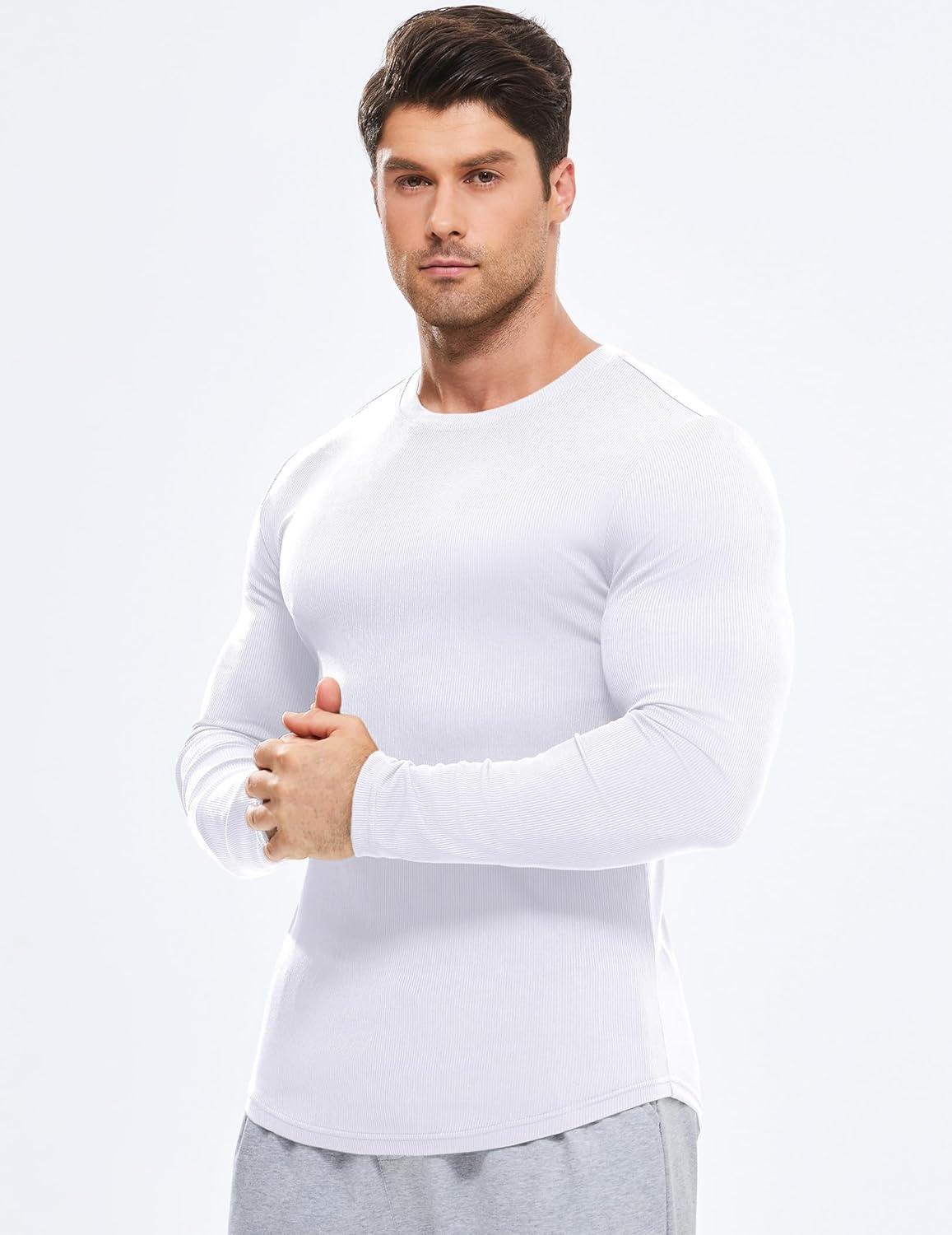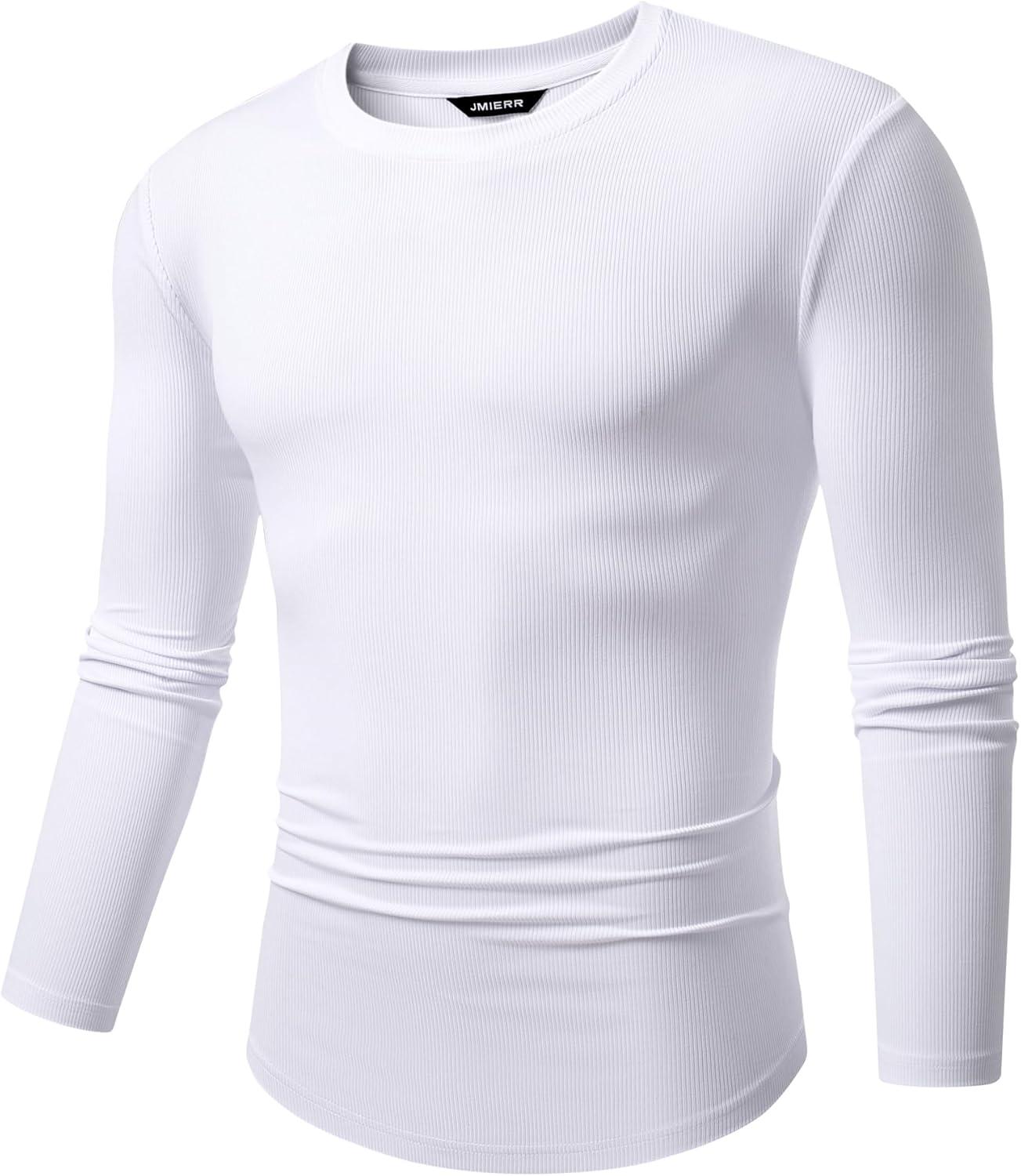 JMIERR Mens Fall Crewneck Shirt Long Sleeve Anti-Wrinkle Casual Muscle T Shirts Longline Ribbed Shirts(01 White)