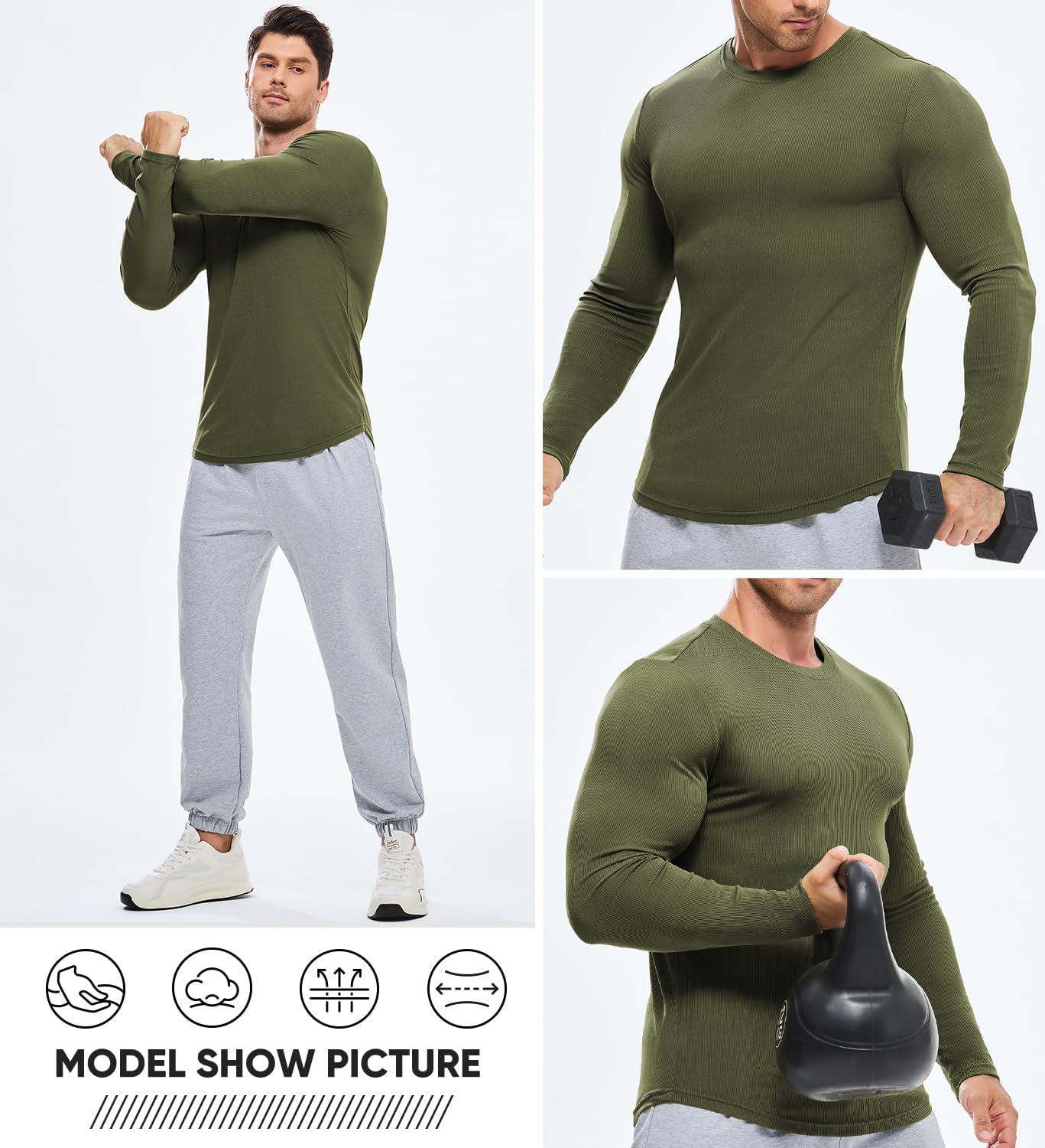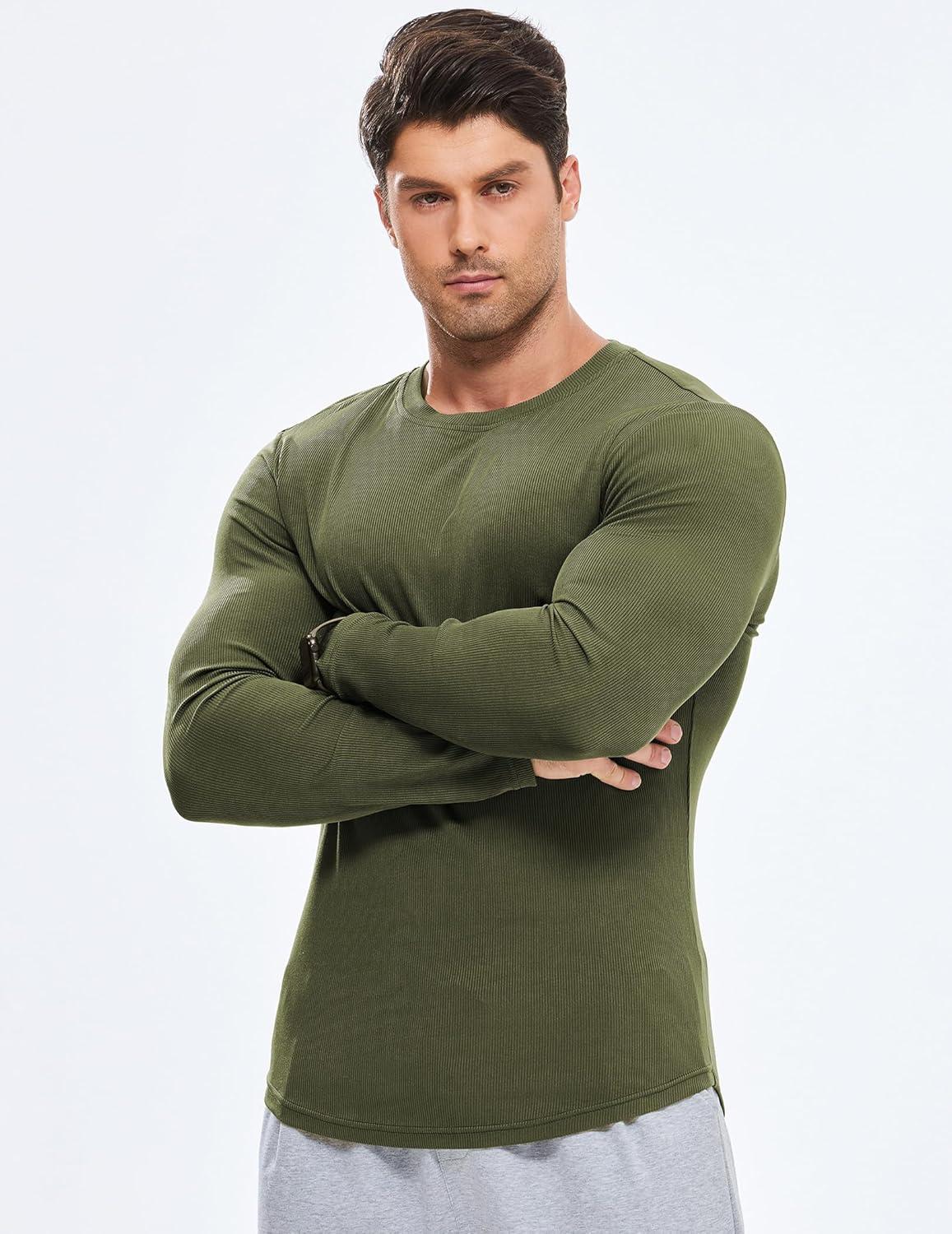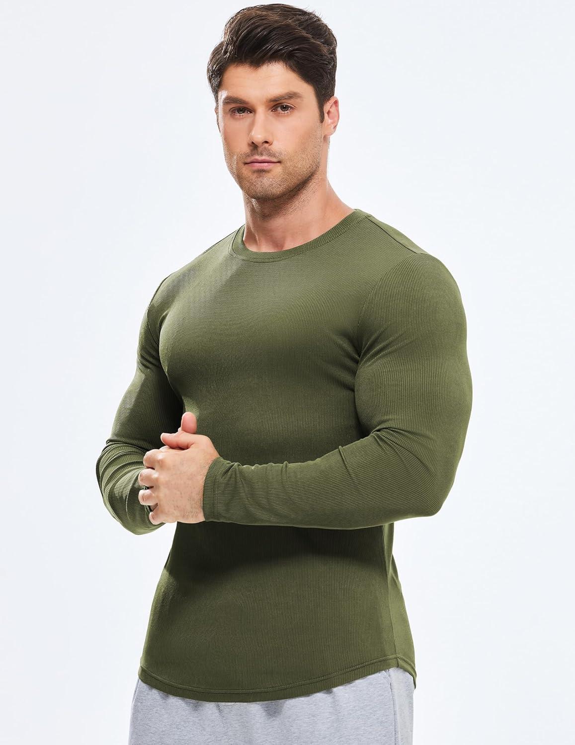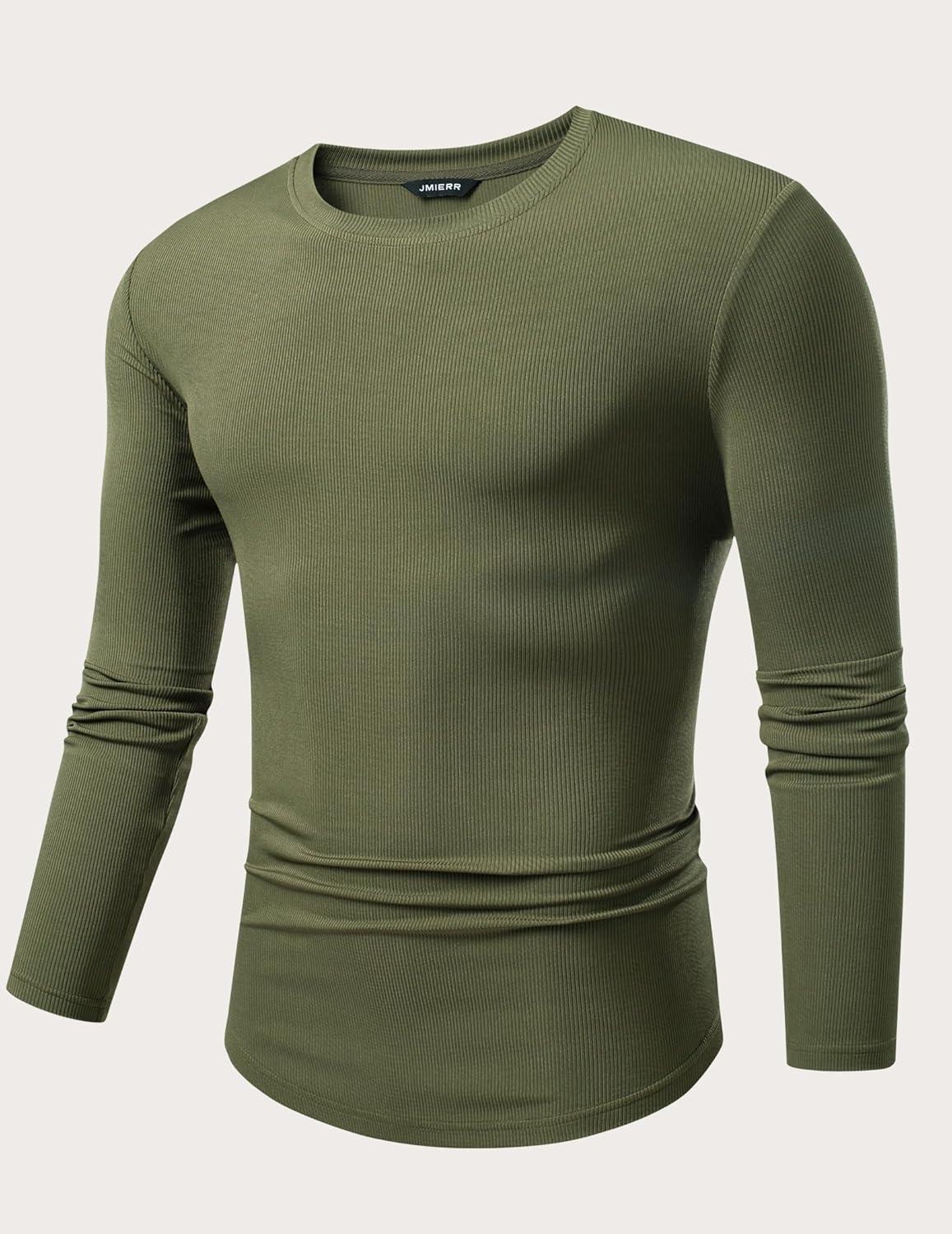 JMIERR Mens Fall Crewneck Shirt Long Sleeve Anti-Wrinkle Casual Muscle T Shirts Longline Ribbed Shirts(03 Army Green)