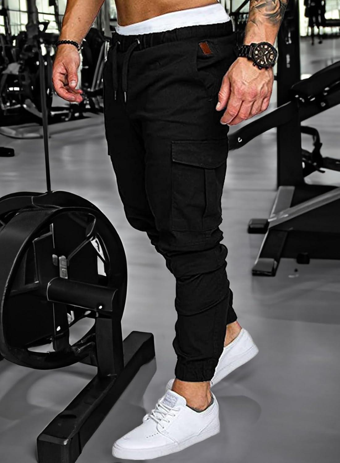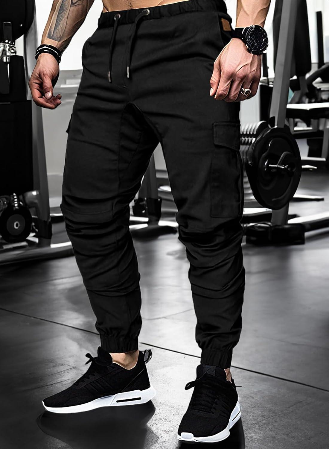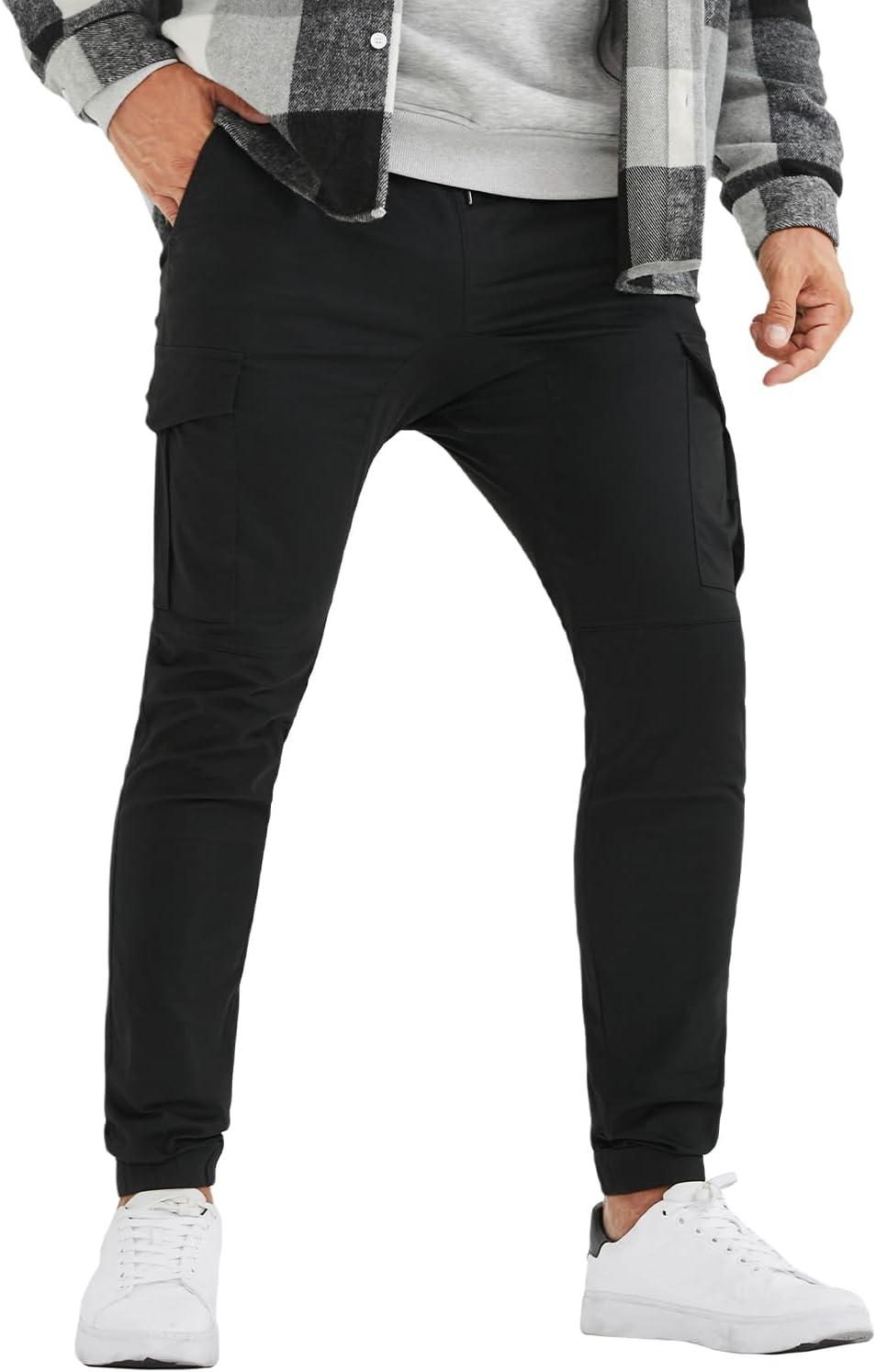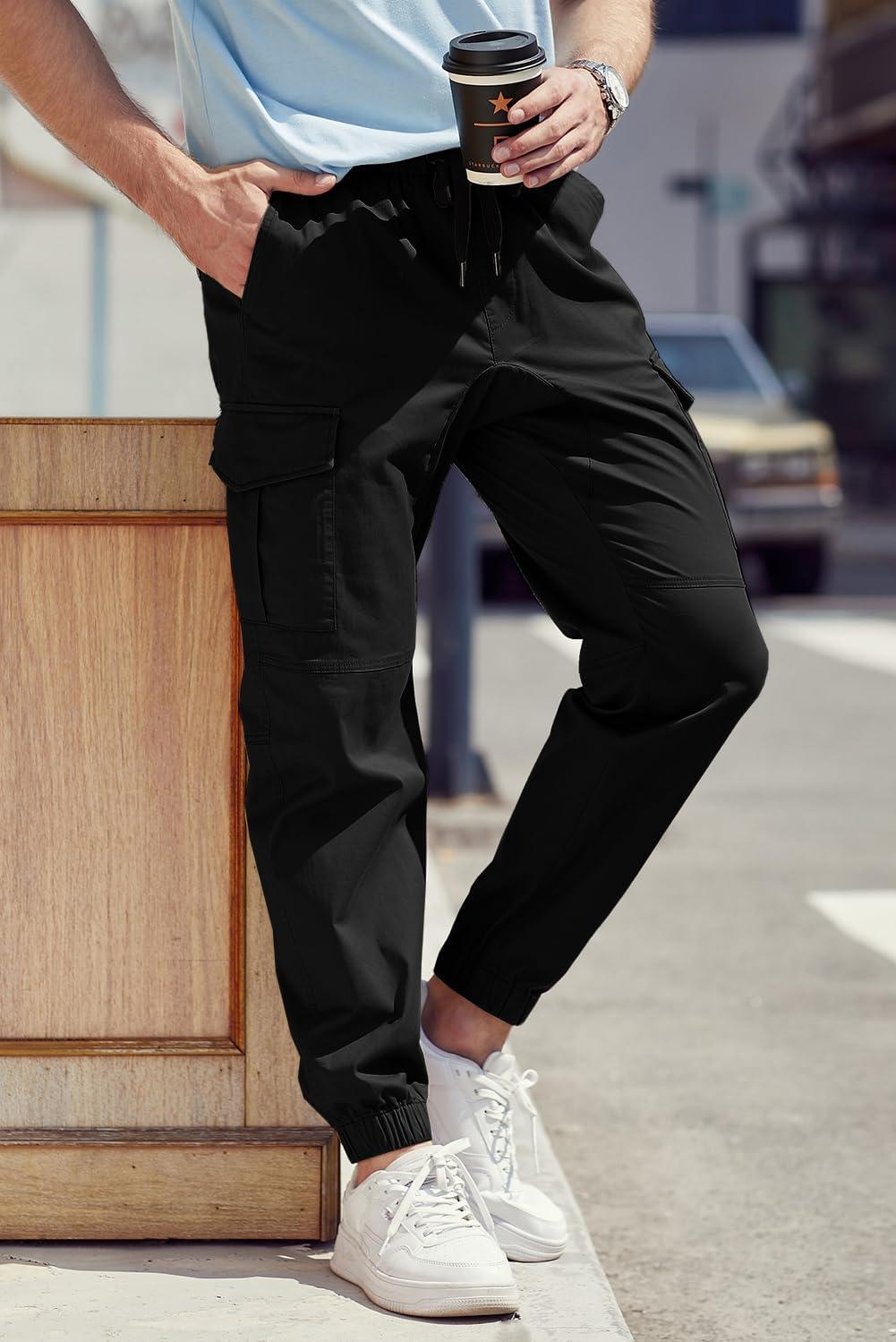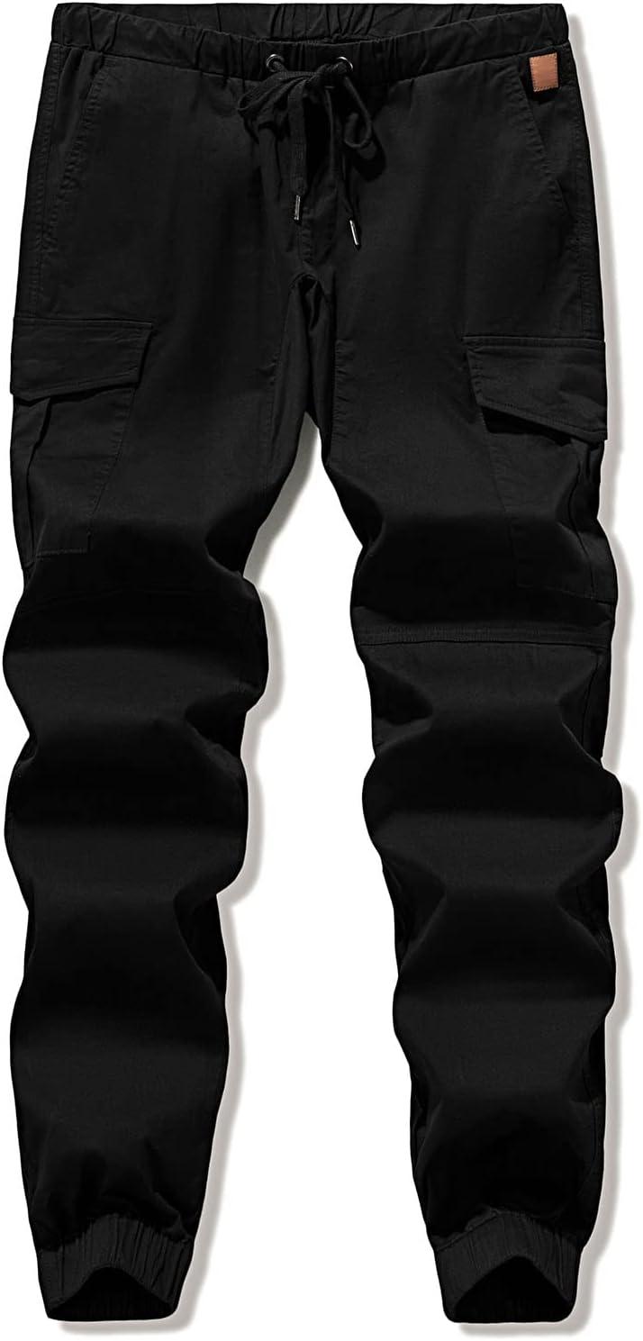 JMIERR Mens Fashion Cargo Pants – Casual Cotton Tapered Stretch Twill Drawstring Athletic Joggers Sweatpants with 6 Pockets(1 Black)