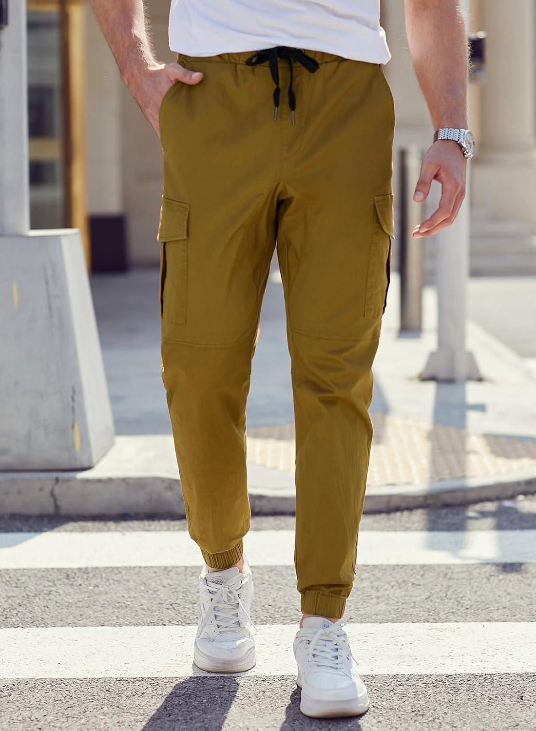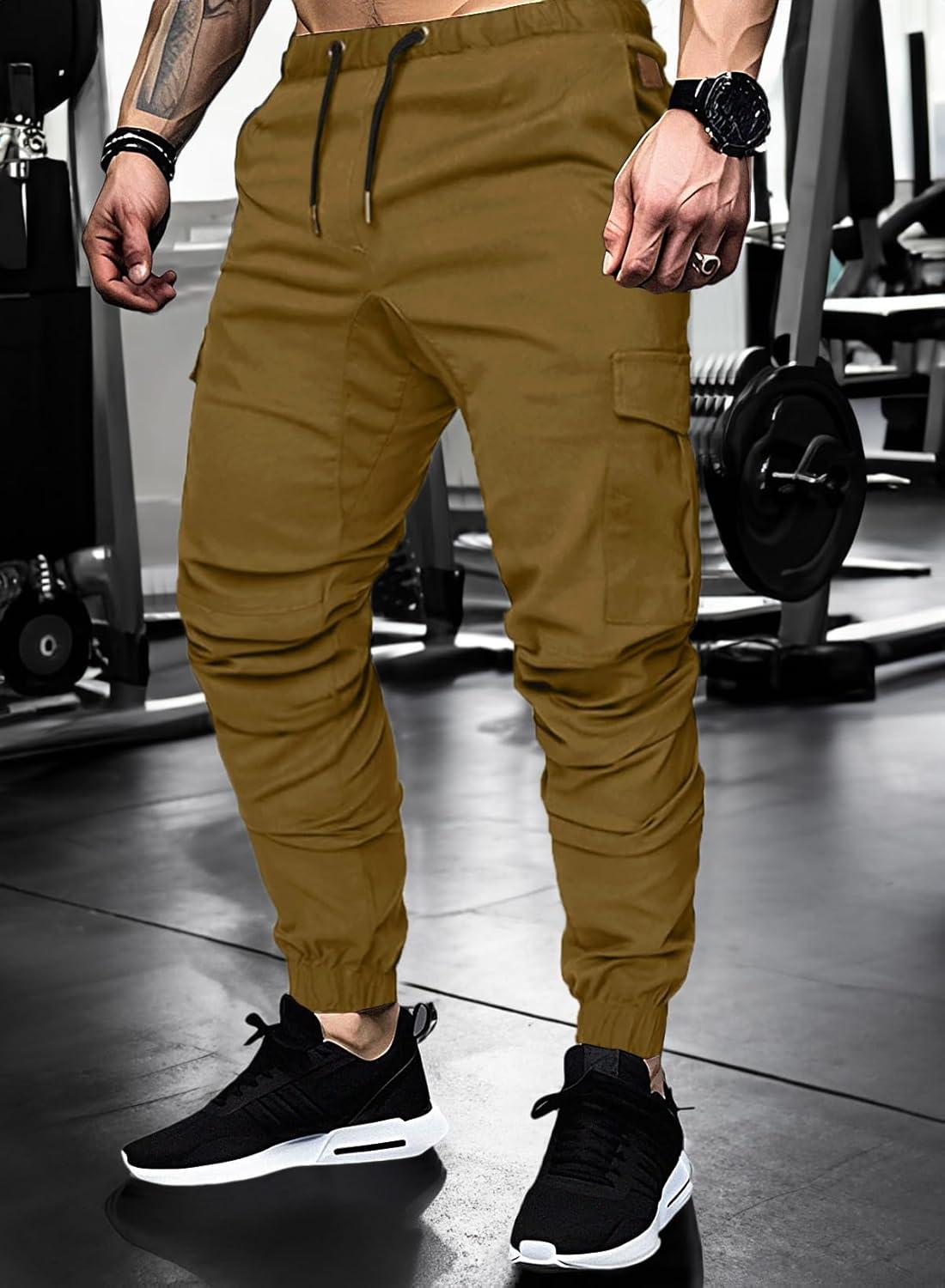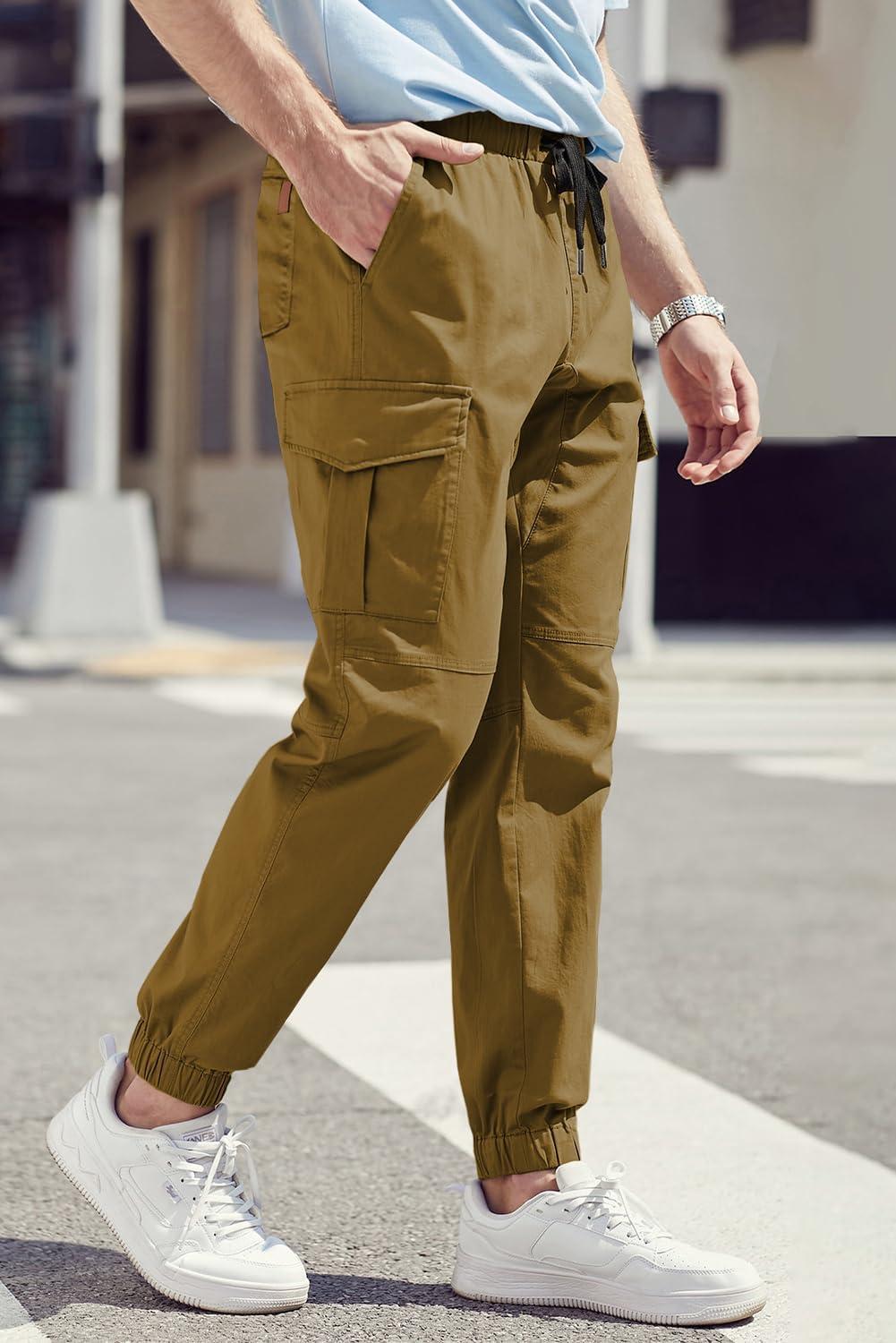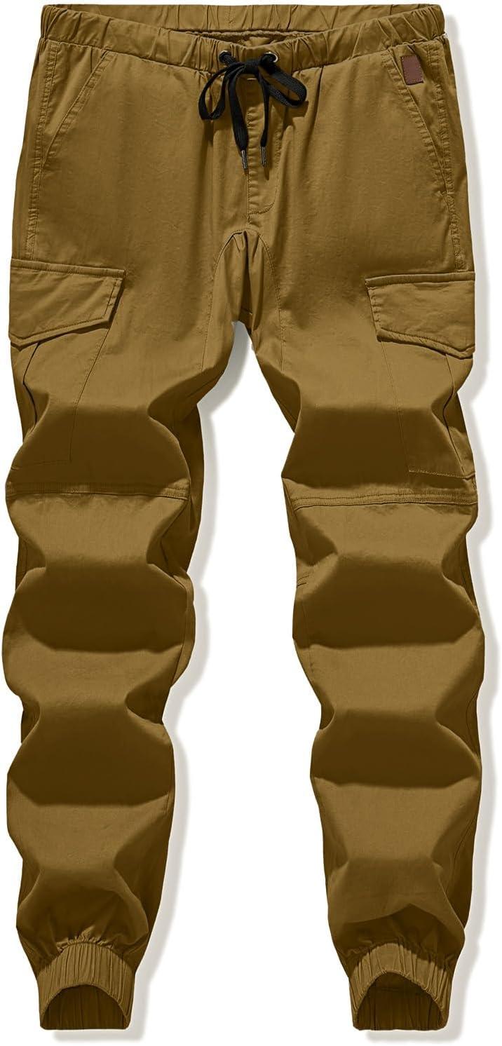 JMIERR Mens Fashion Cargo Pants – Casual Cotton Tapered Stretch Twill Drawstring Athletic Joggers Sweatpants with 6 Pockets(A Brown)
