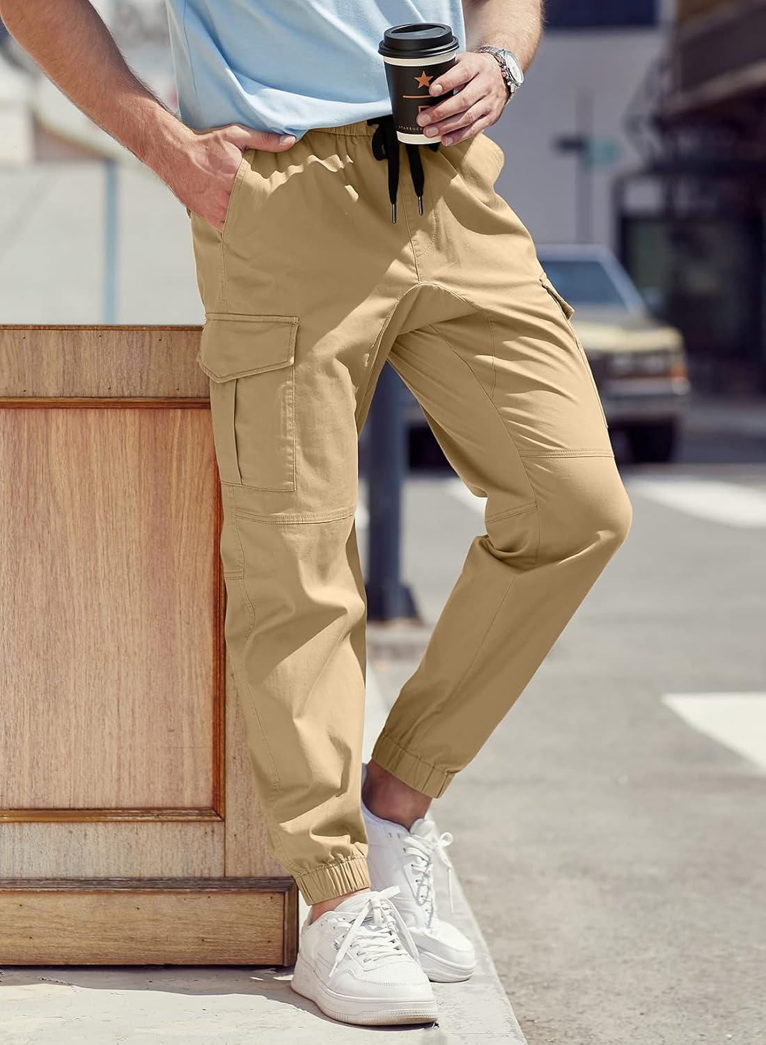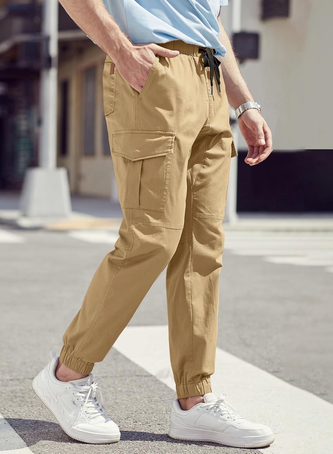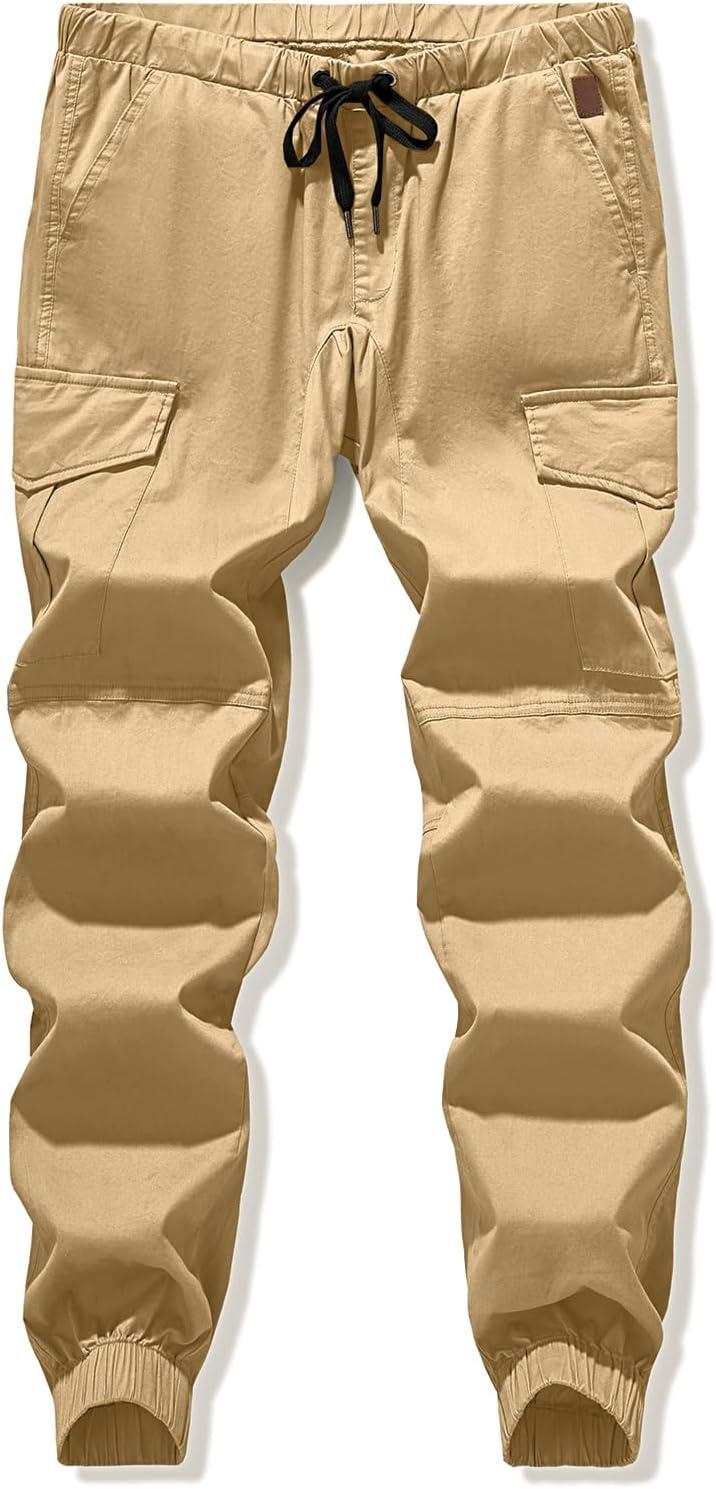 JMIERR Mens Fashion Cargo Pants – Casual Cotton Tapered Stretch Twill Drawstring Athletic Joggers Sweatpants with 6 Pockets(A Khaki 3)