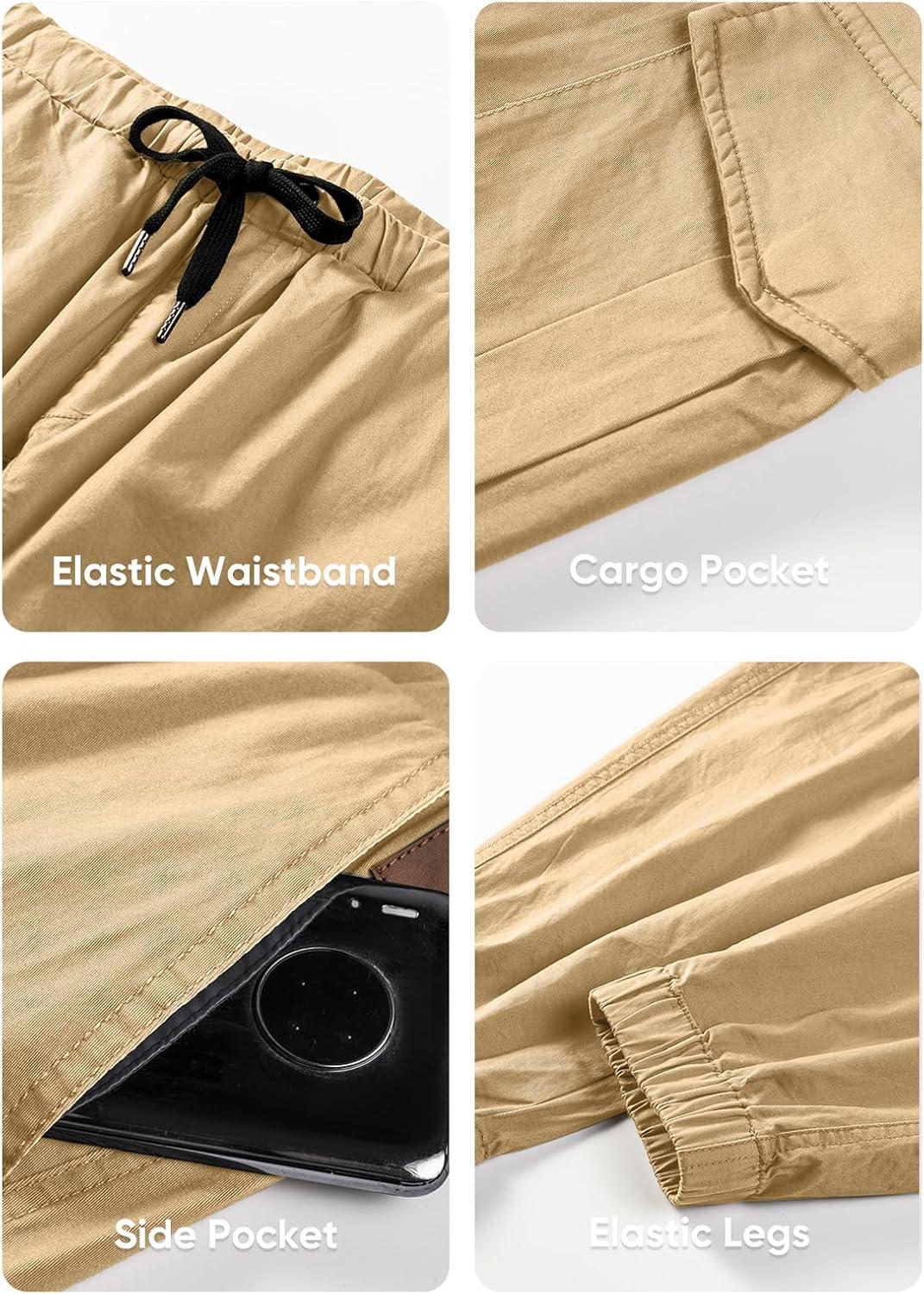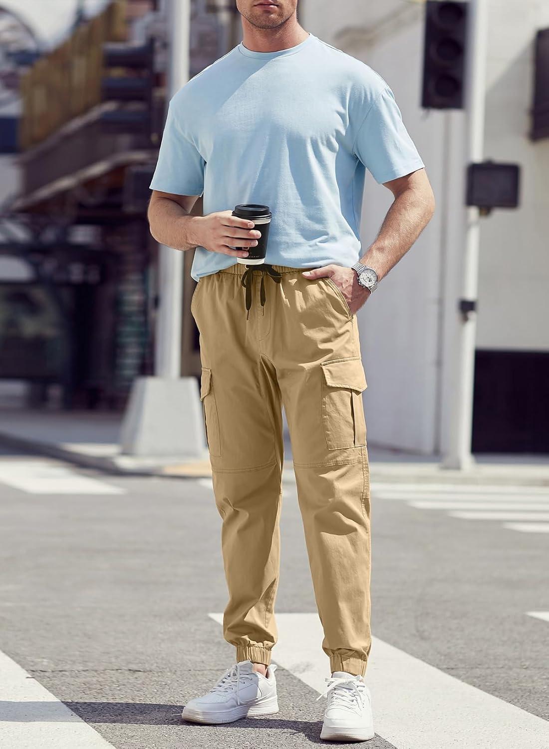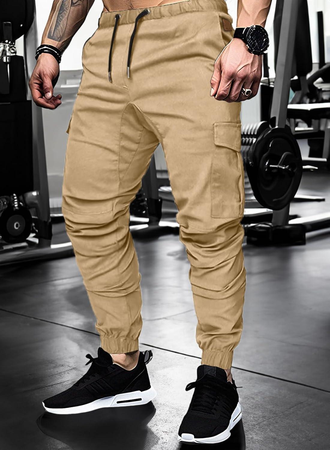 JMIERR Mens Fashion Cargo Pants – Casual Cotton Tapered Stretch Twill Drawstring Athletic Joggers Sweatpants with 6 Pockets(A Khaki 3)