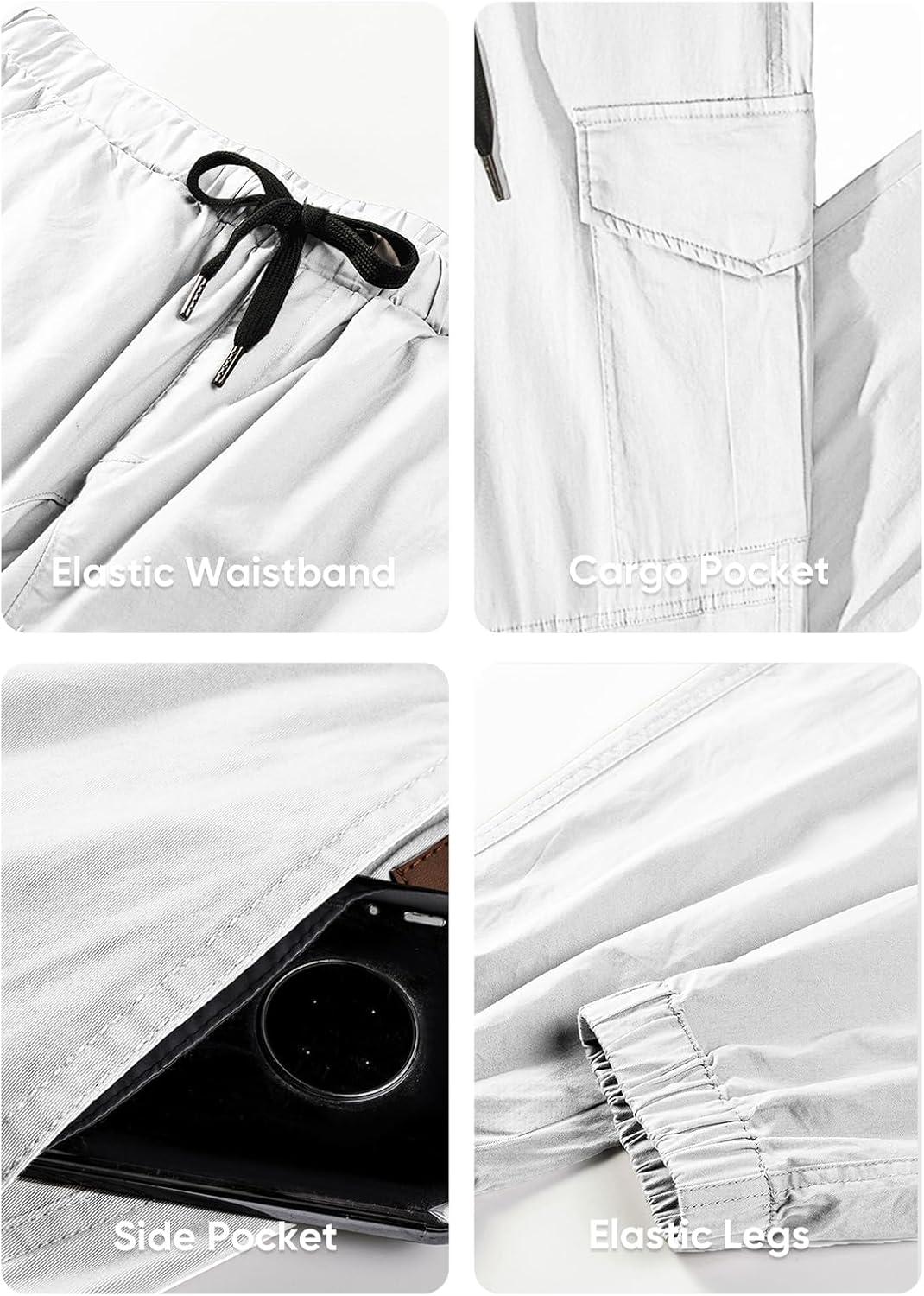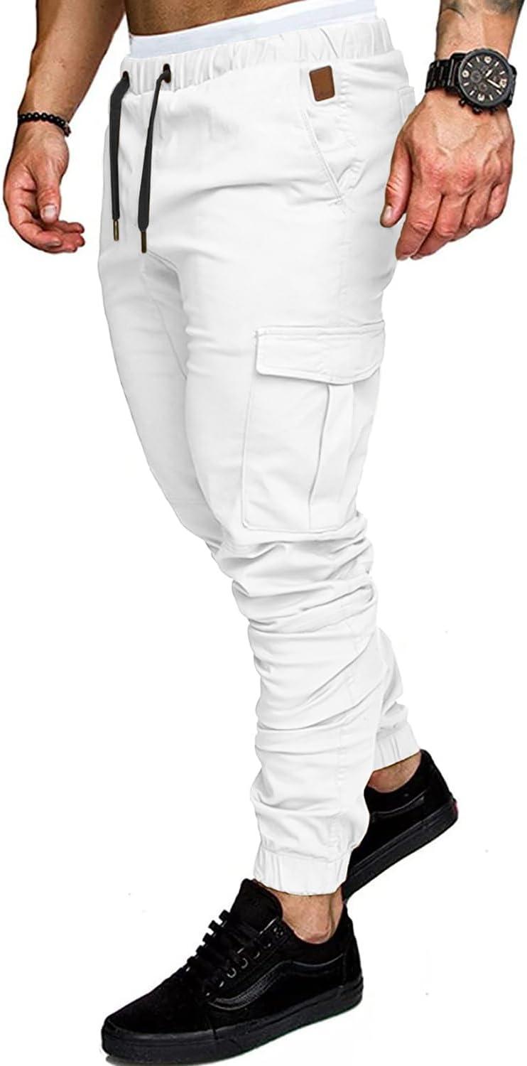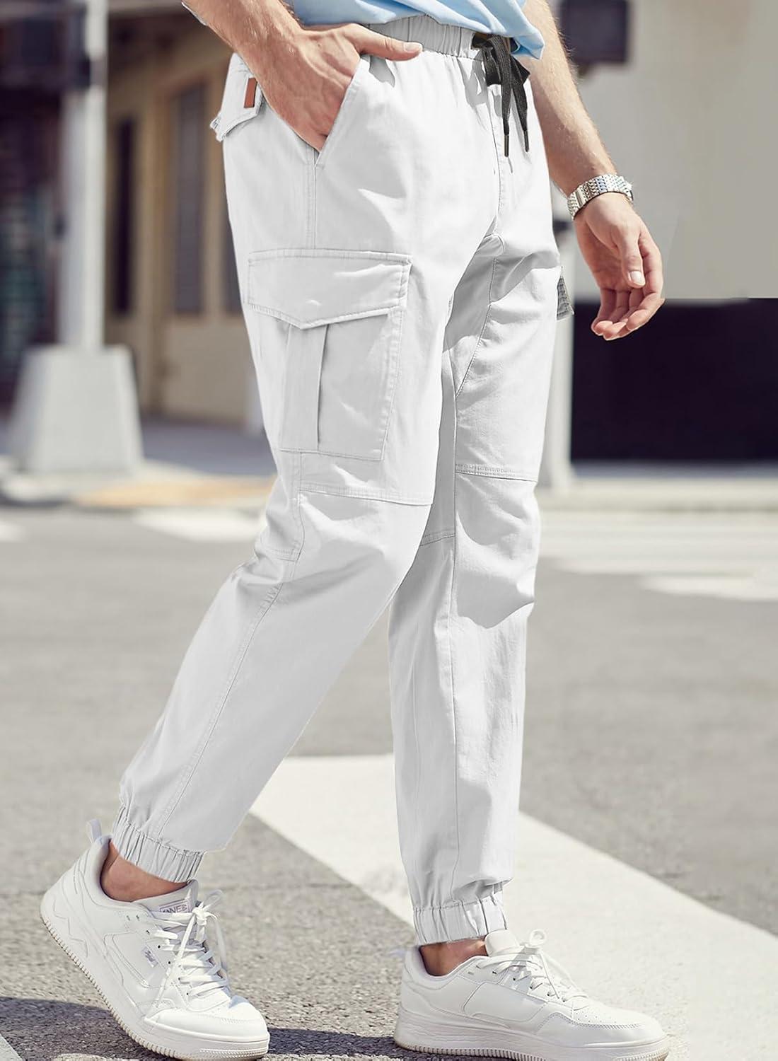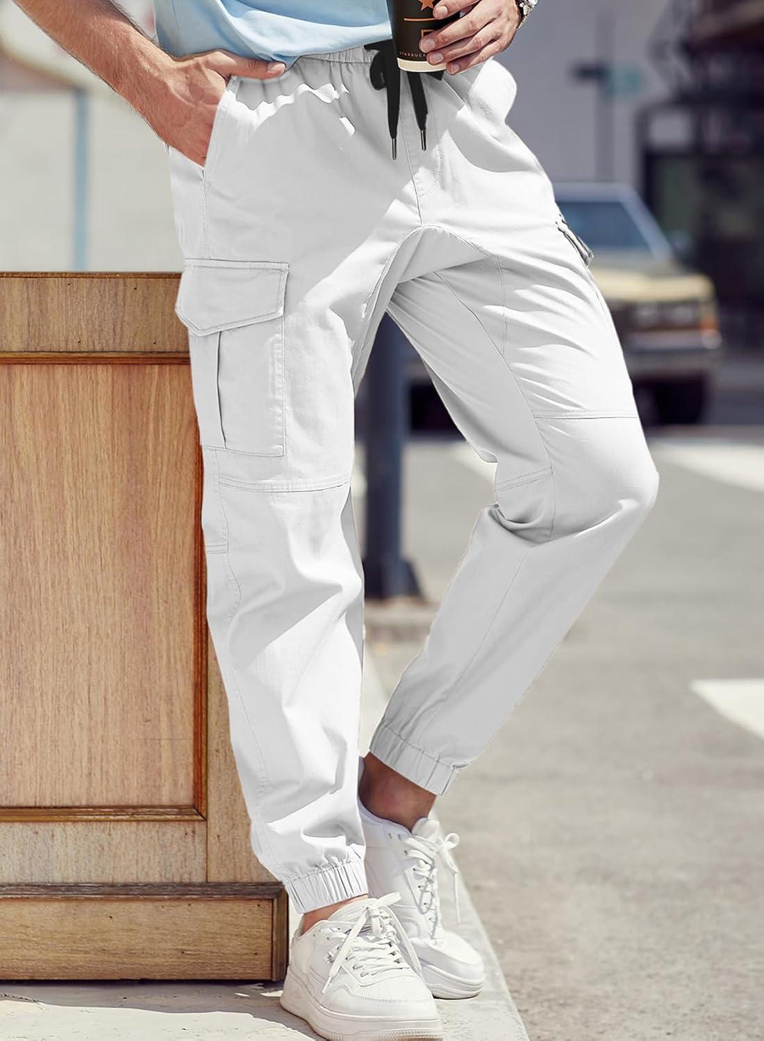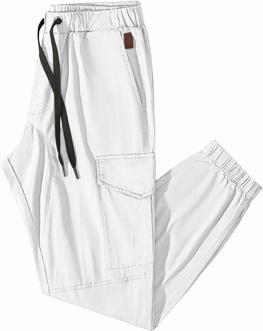 JMIERR Mens Fashion Cargo Pants – Casual Cotton Tapered Stretch Twill Drawstring Athletic Joggers Sweatpants with 6 Pockets(A White)