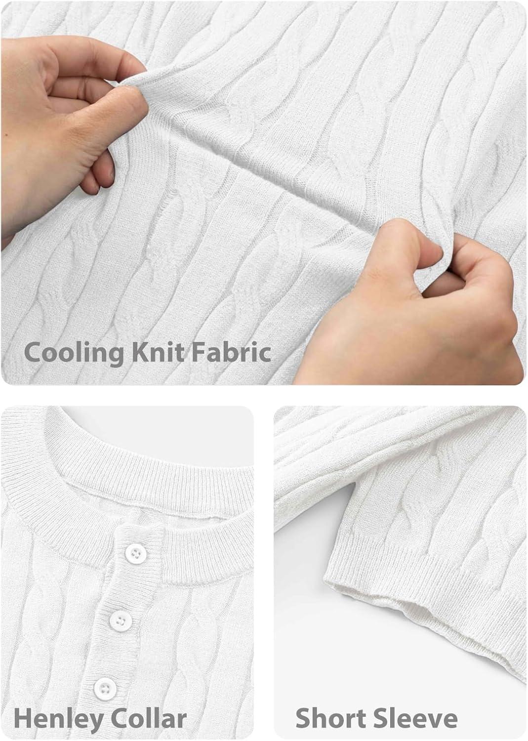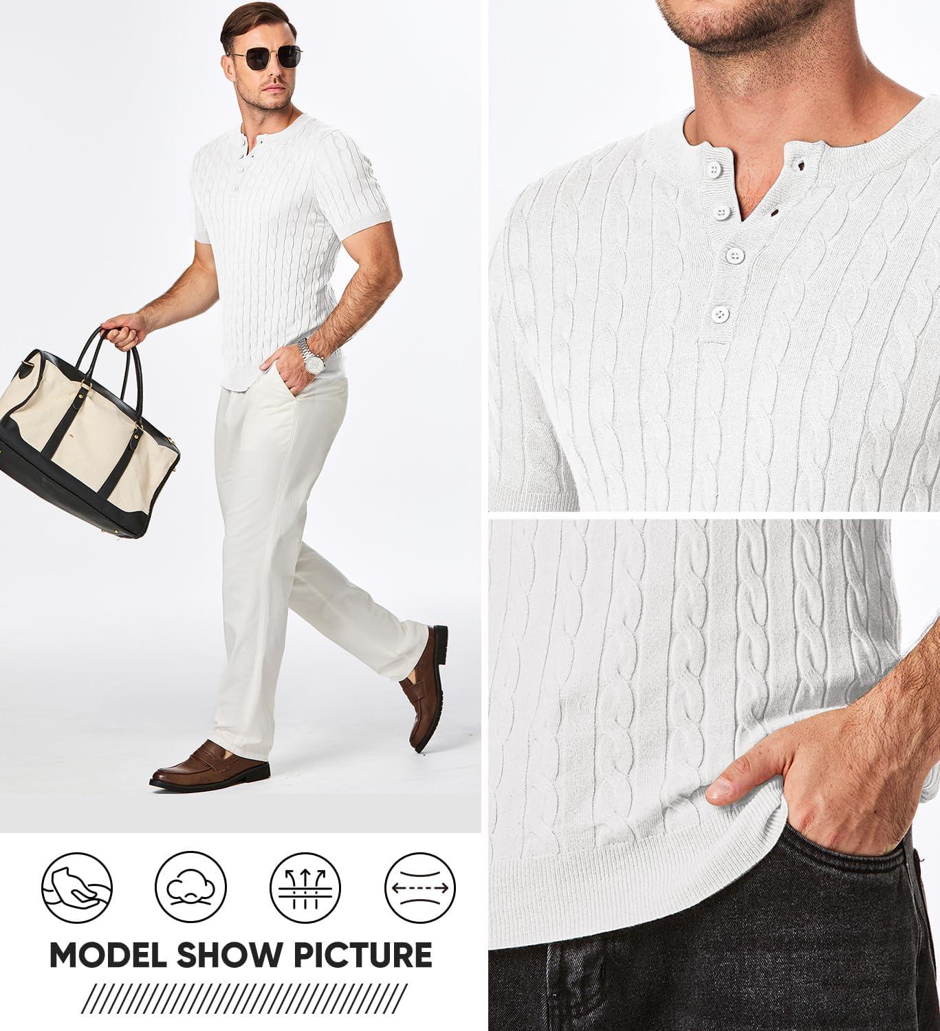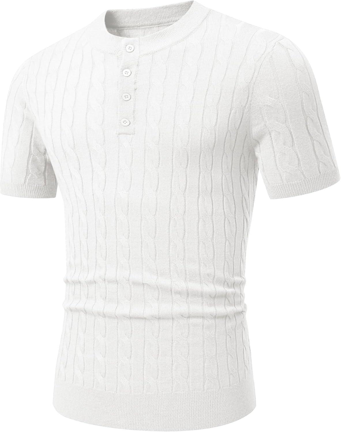JMIERR Men’s Knit Henley Shirts Casual Short Sleeve Button T-Shirt Cable Knitted Polo Shirts Golf Shirt(White)