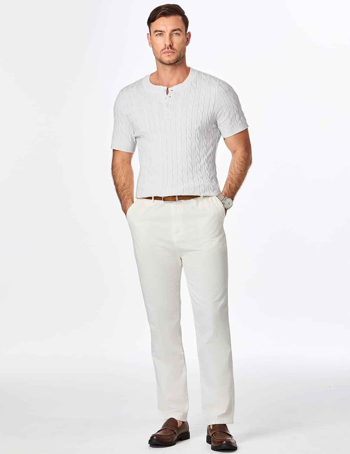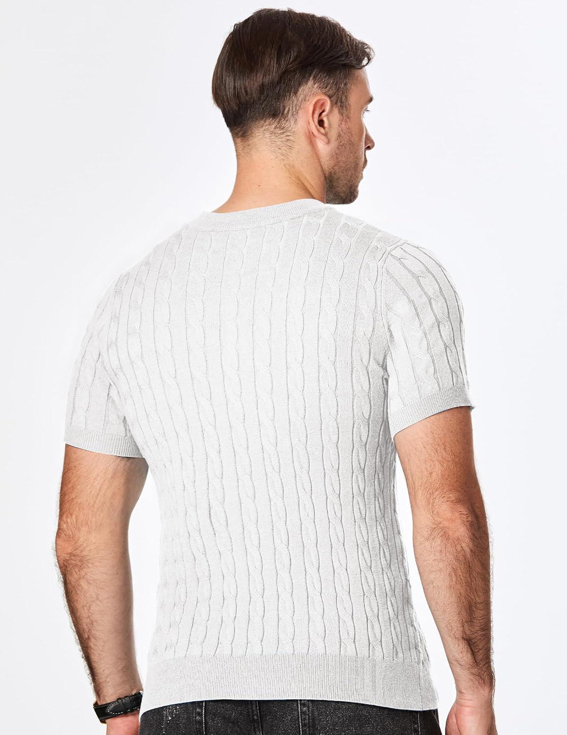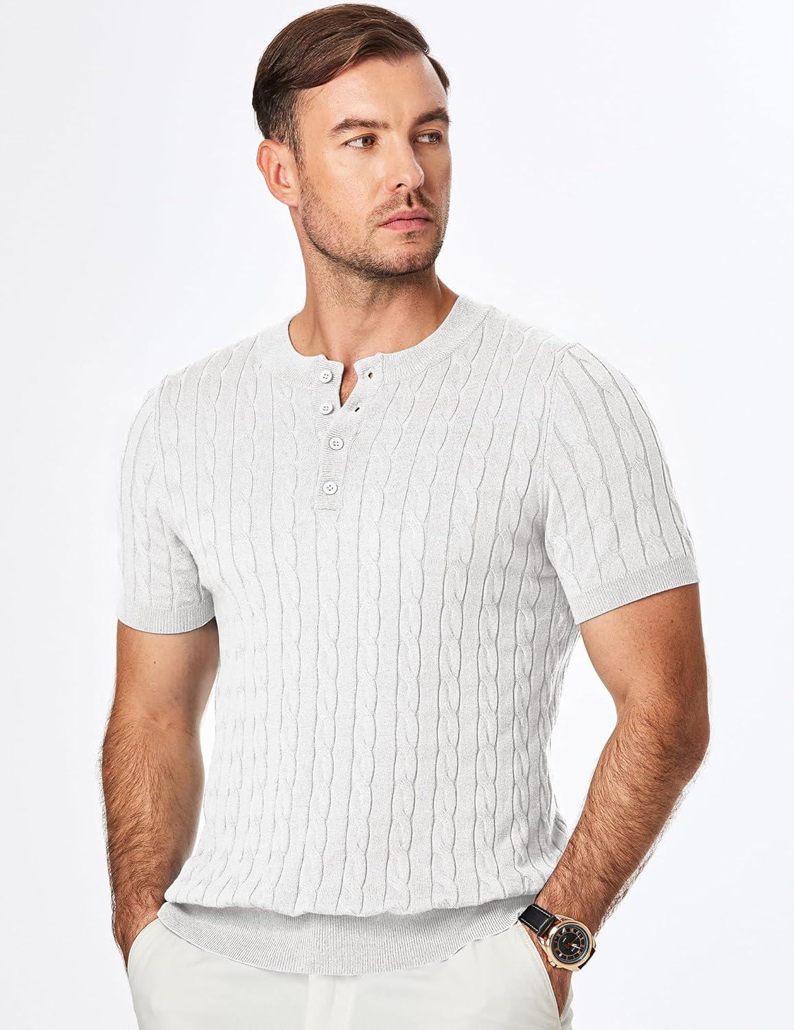JMIERR Men’s Knit Henley Shirts Casual Short Sleeve Button T-Shirt Cable Knitted Polo Shirts Golf Shirt(White)