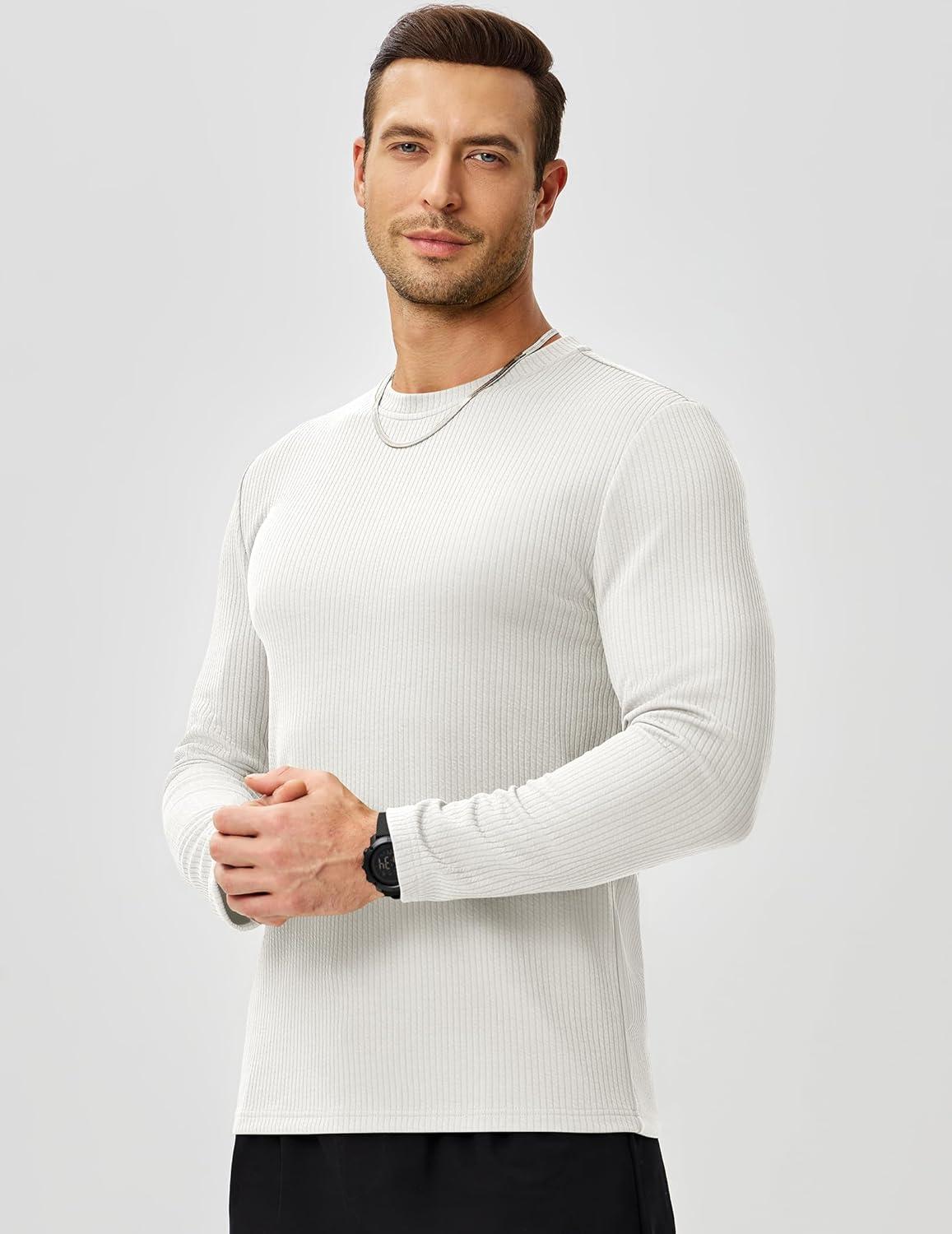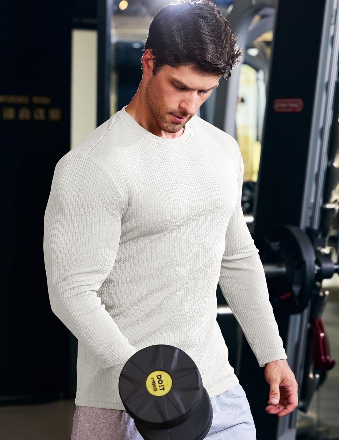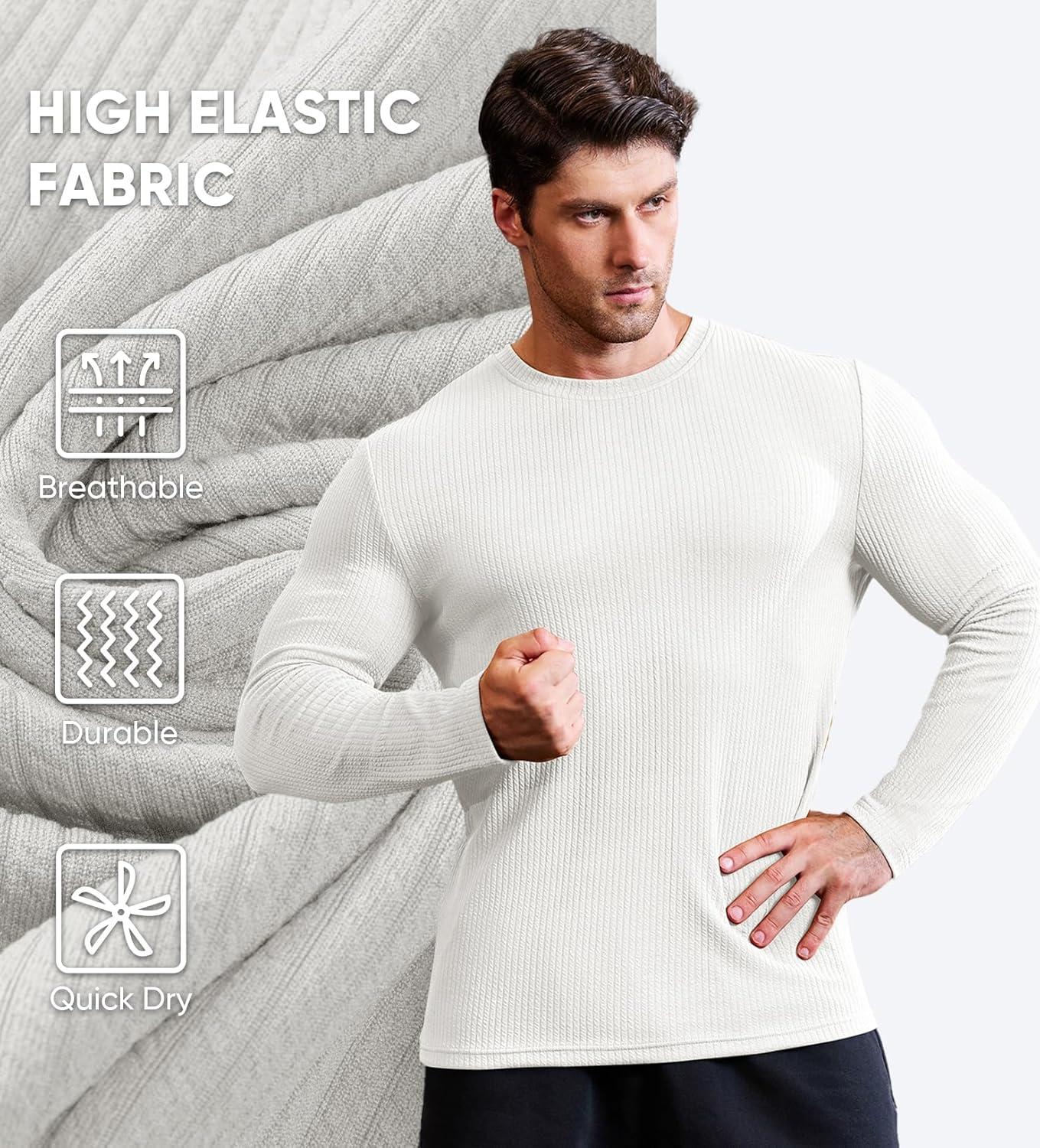 JMIERR Mens Long Sleeve Muscle T Shirts Casual Crewneck Knitted Longline Textured Tee Shirts for Gym Workout(A White)