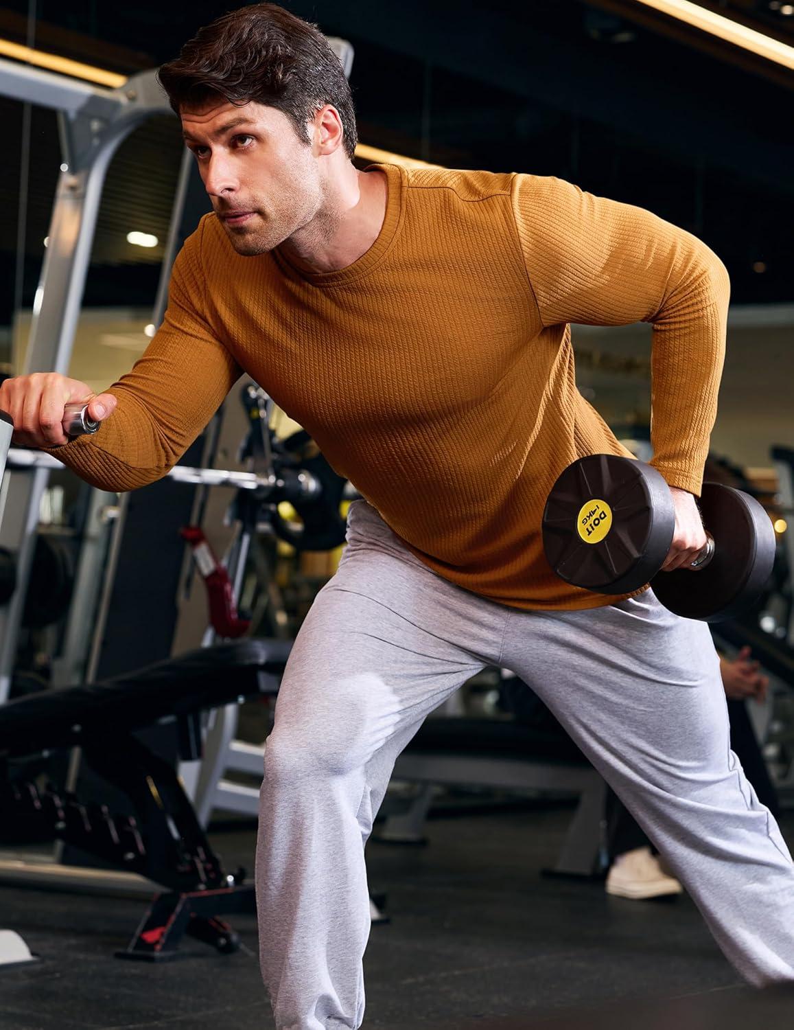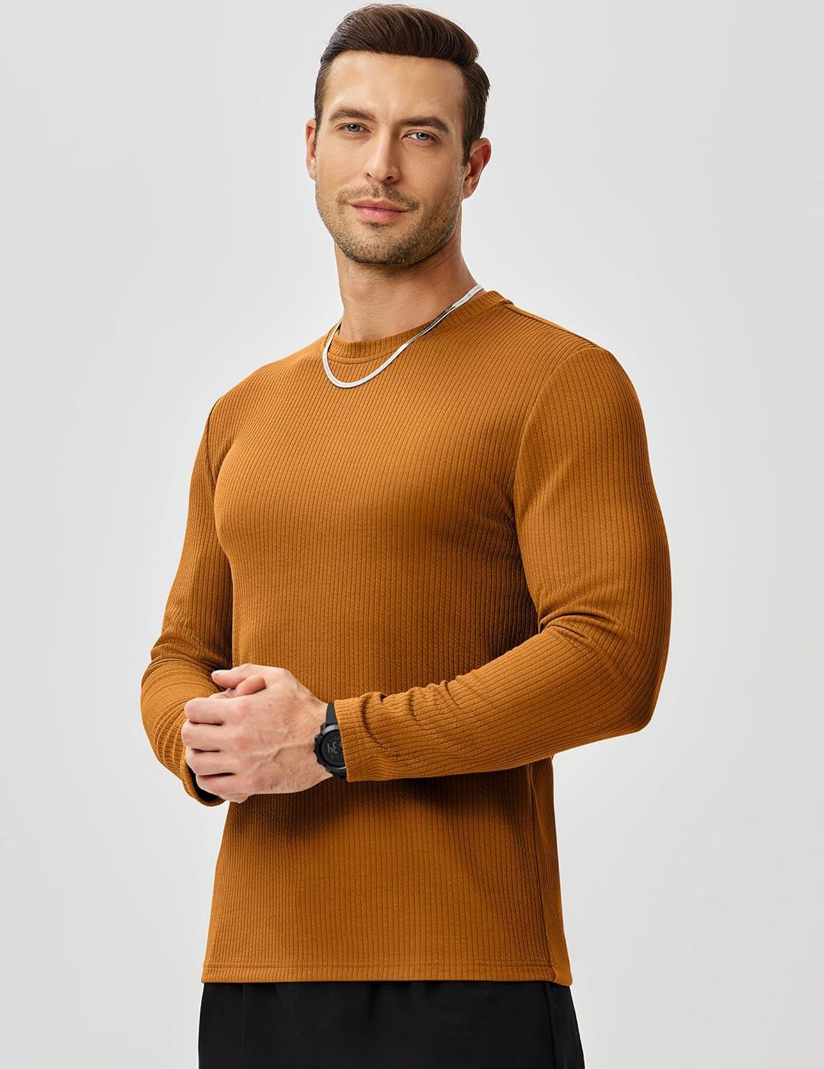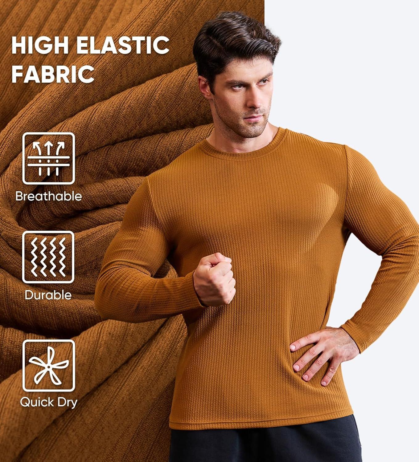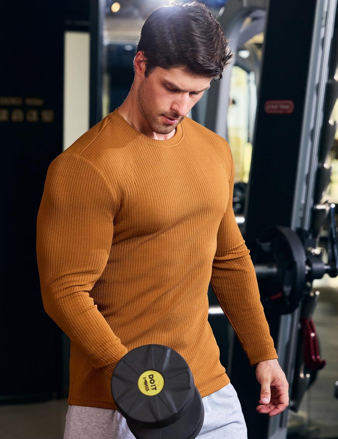 JMIERR Mens Long Sleeve Muscle T Shirts Casual Crewneck Knitted Longline Textured Tee Shirts for Gym Workout(B Khaki)