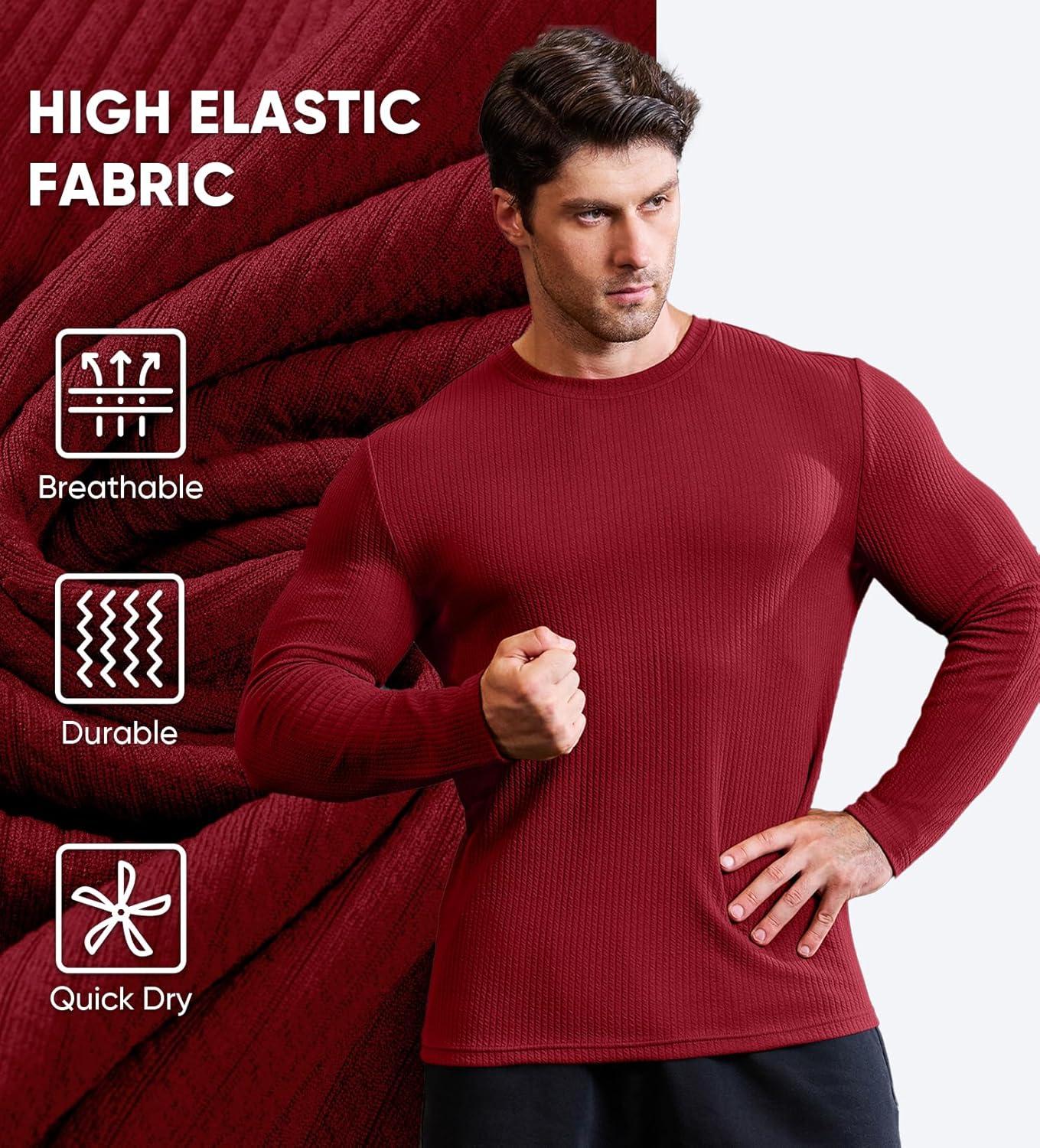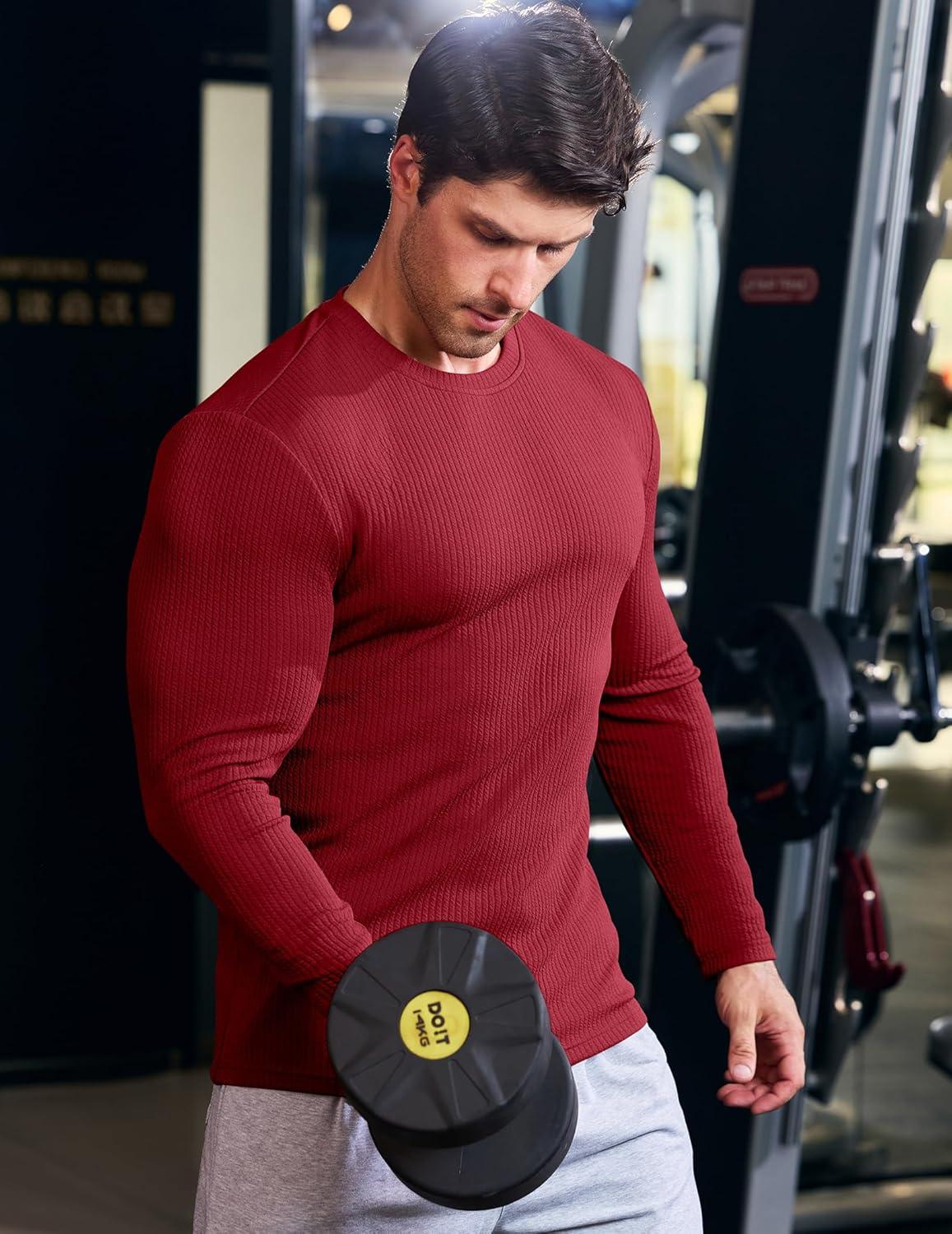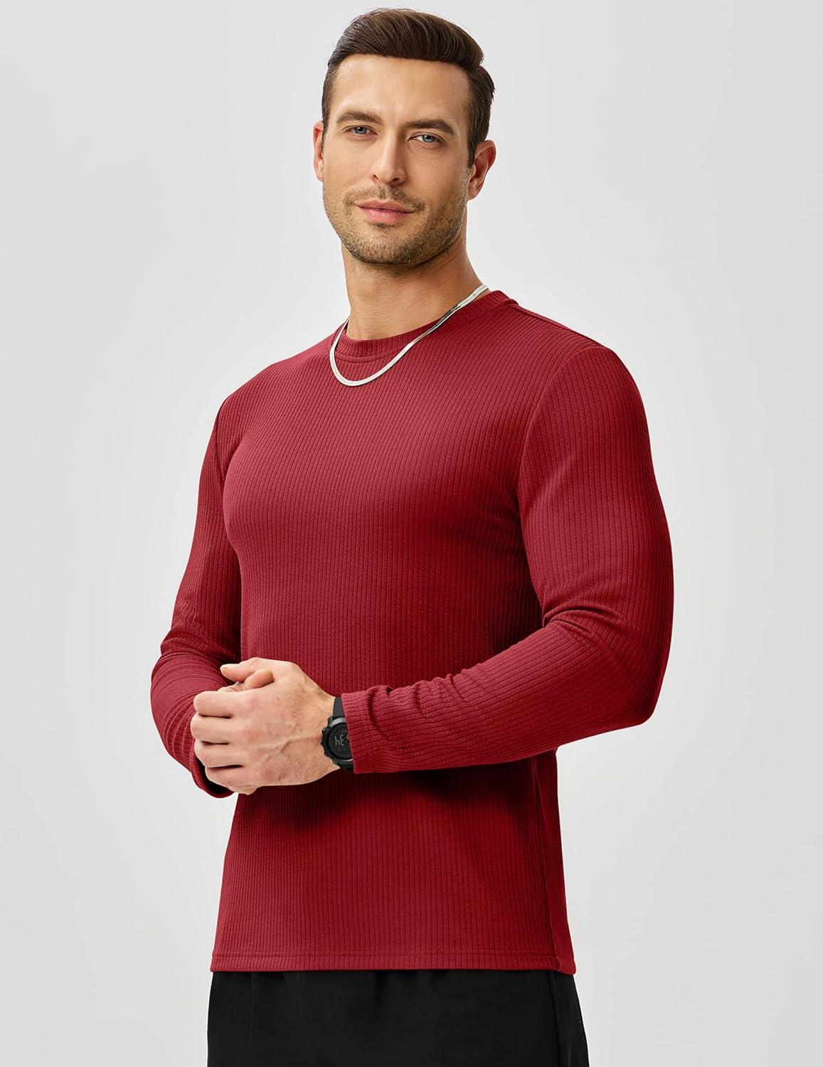JMIERR Mens Long Sleeve Muscle T Shirts Casual Crewneck Knitted Longline Textured Tee Shirts for Gym Workout(Red Dahlia)