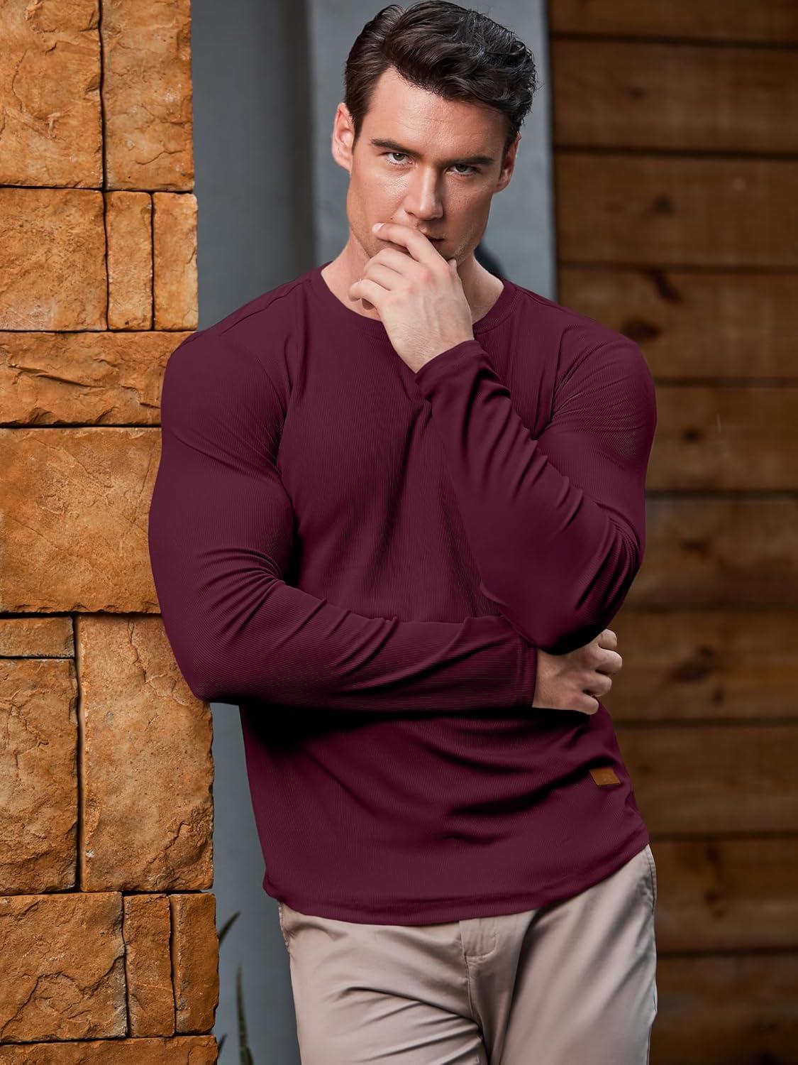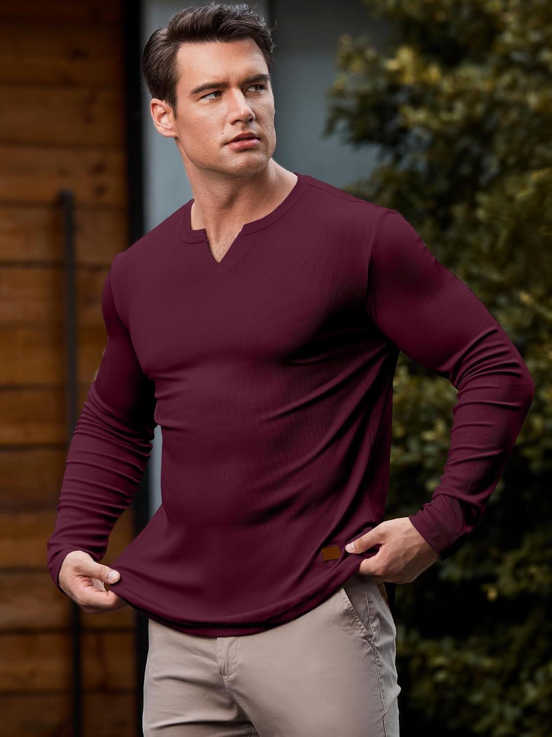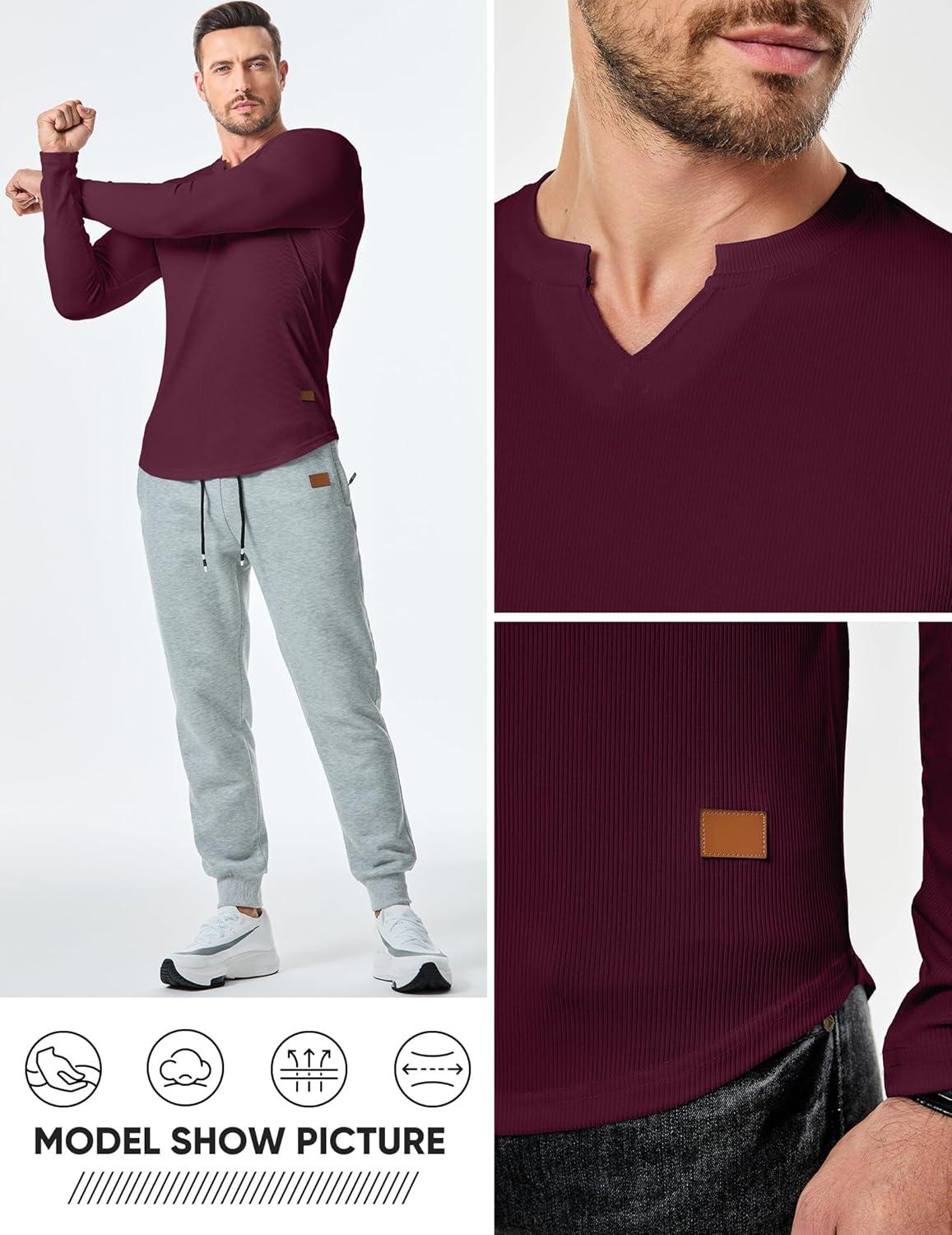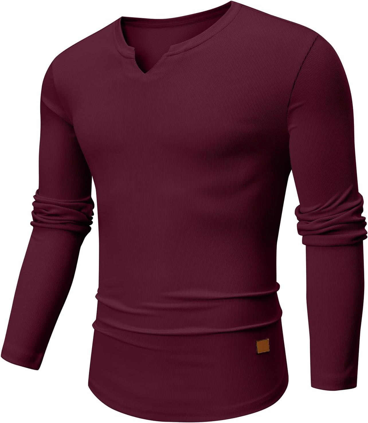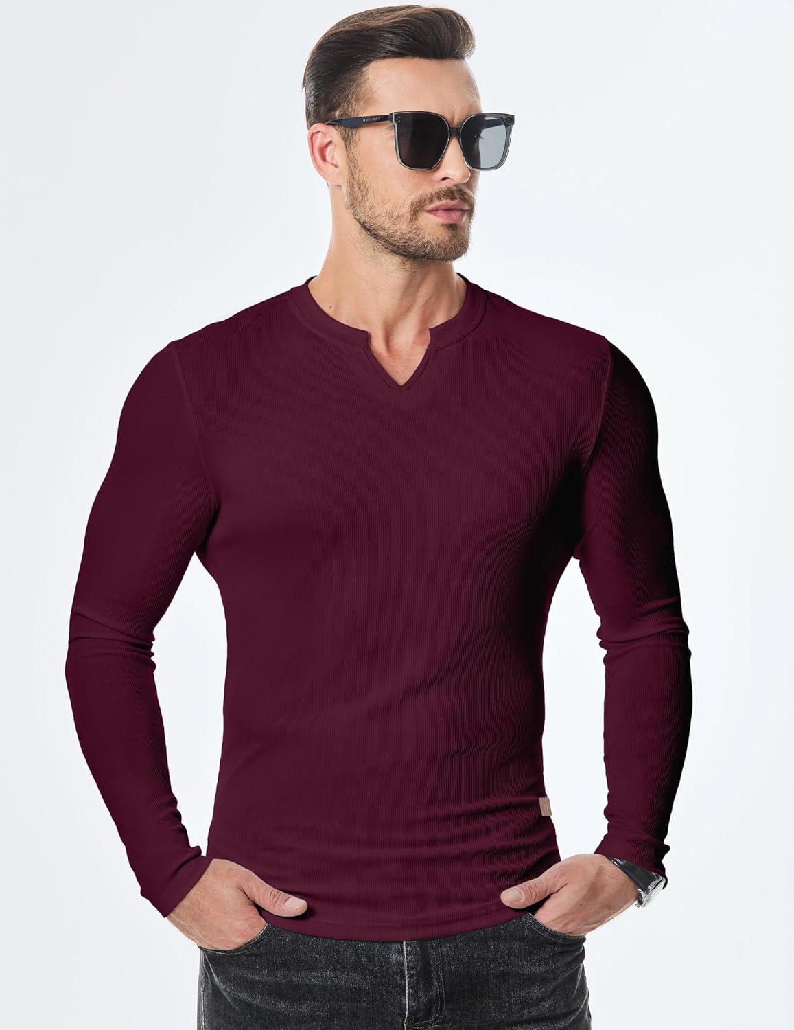 JMIERR Mens Long Sleeve Muscle T Shirts Casual V-Neck Longline Ribbed Tee Shirts(Burgundy)