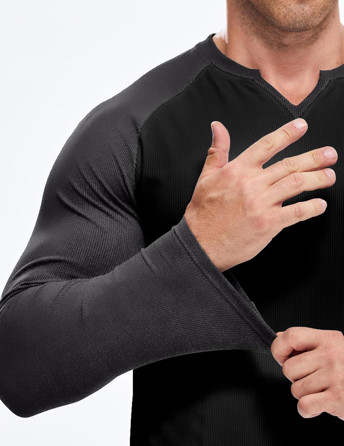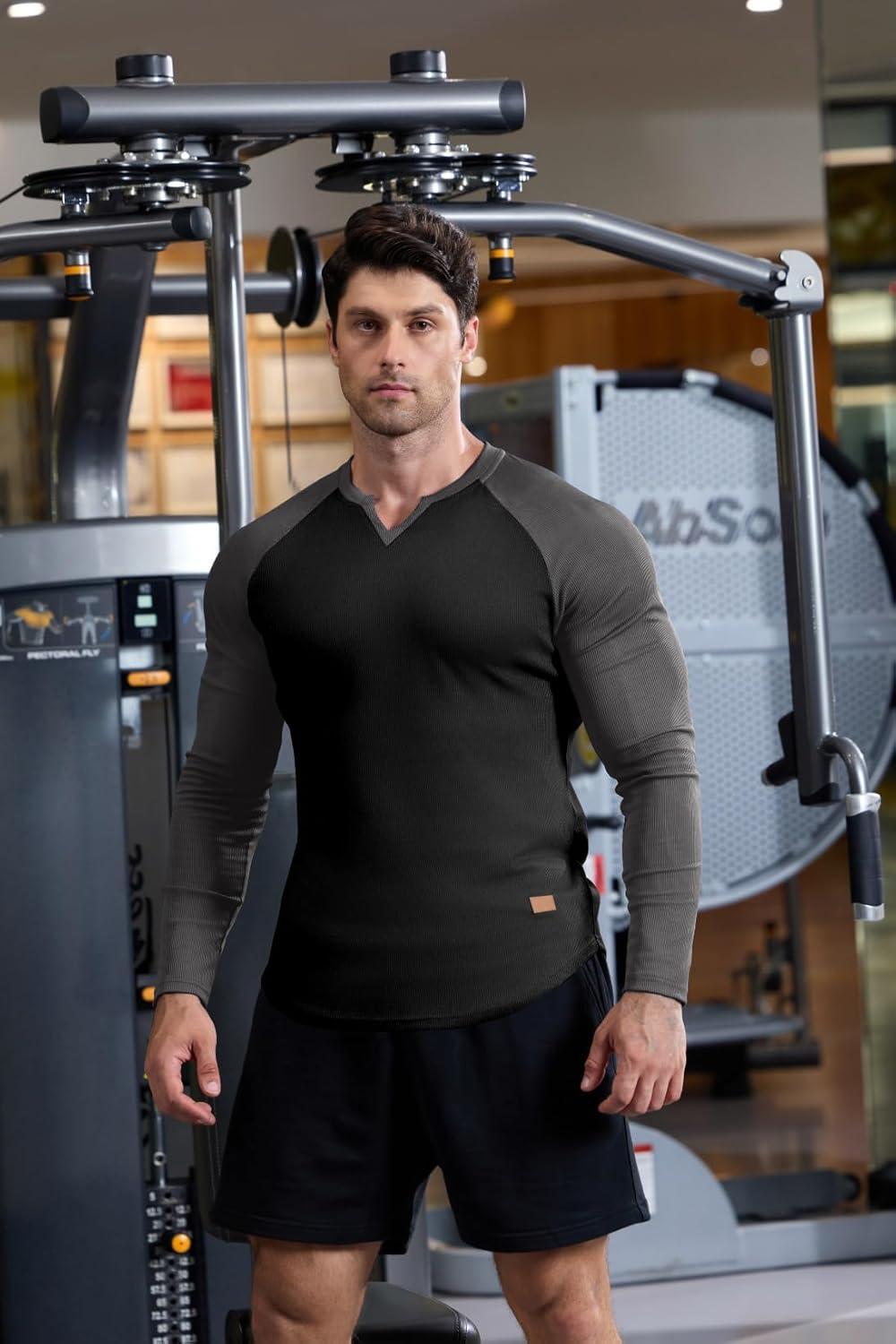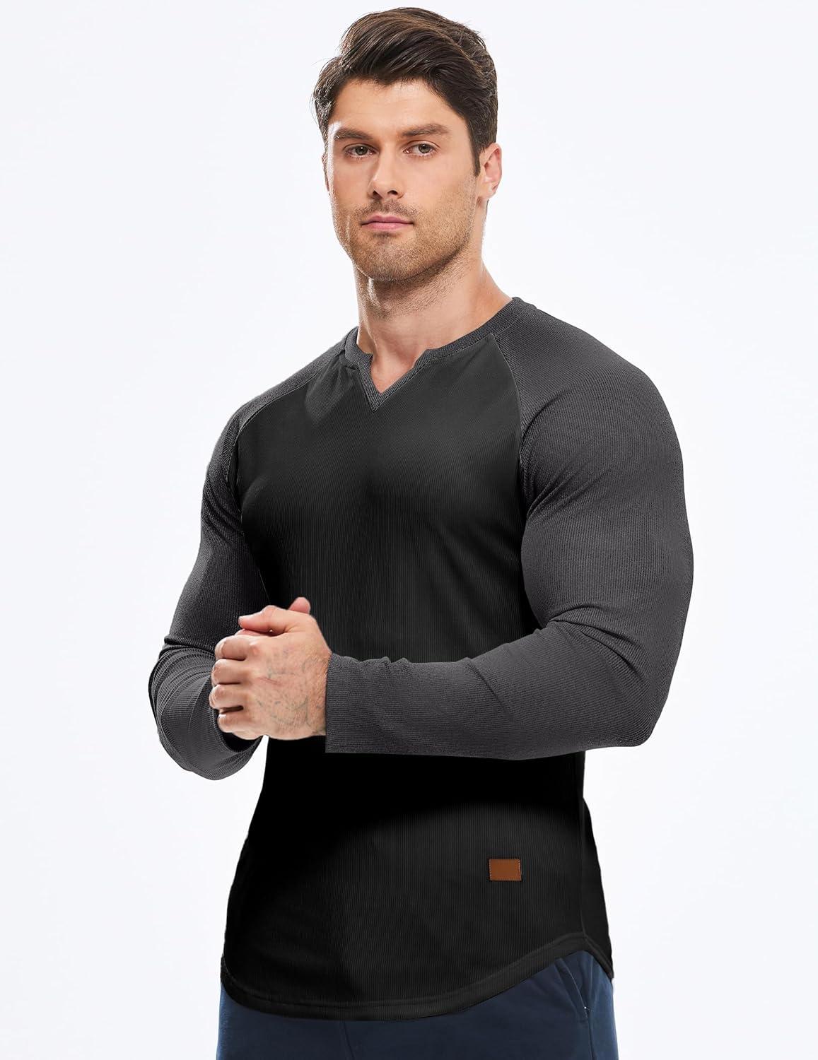 JMIERR Mens Long Sleeve Muscle T Shirts Casual V-Neck Longline Ribbed Tee Shirts(T Black & Grey)